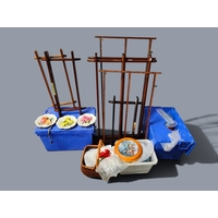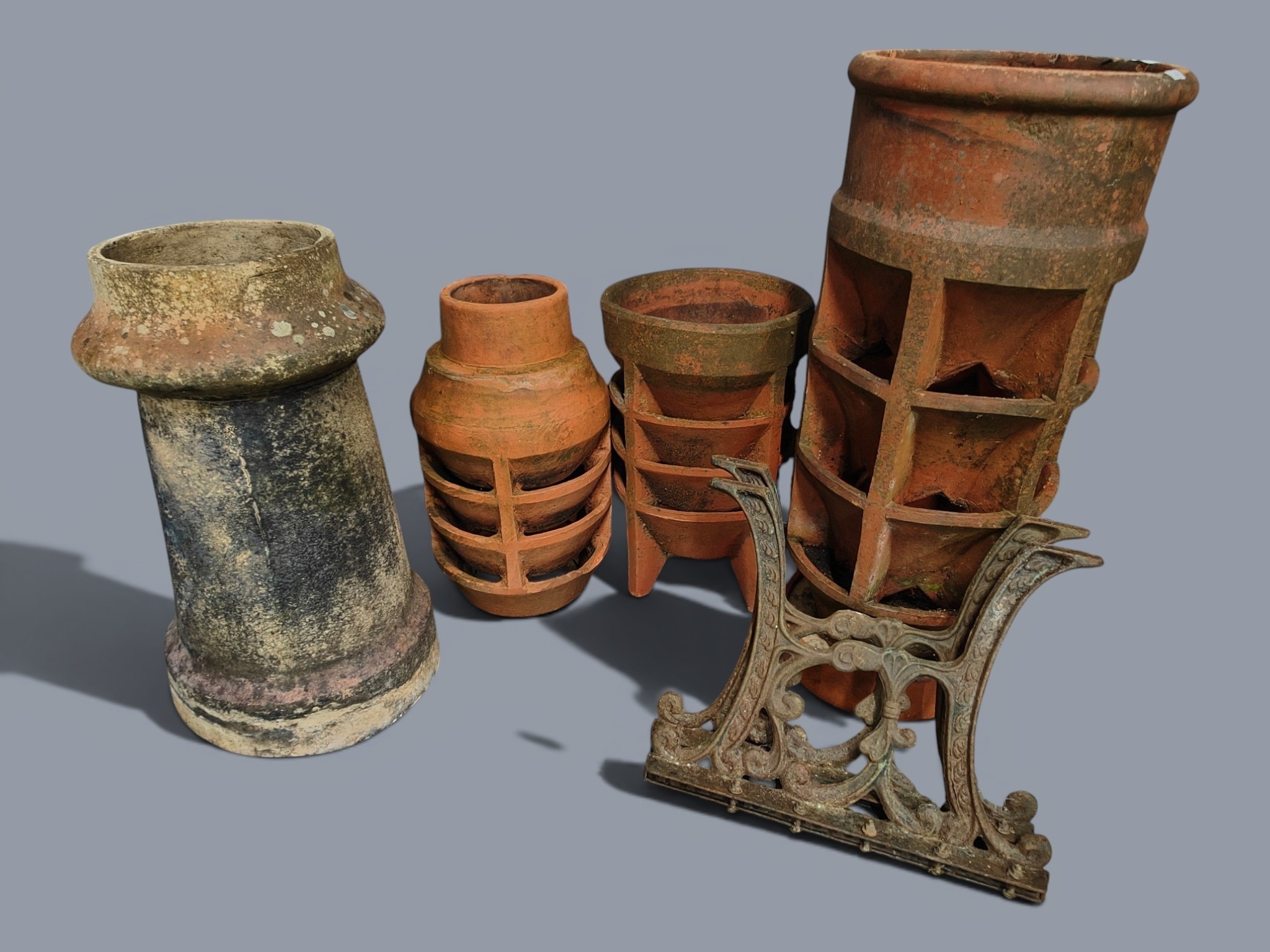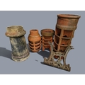 4 ANTIQUE CHIMNEY POTS AND PAIR OF BENCH ENDS