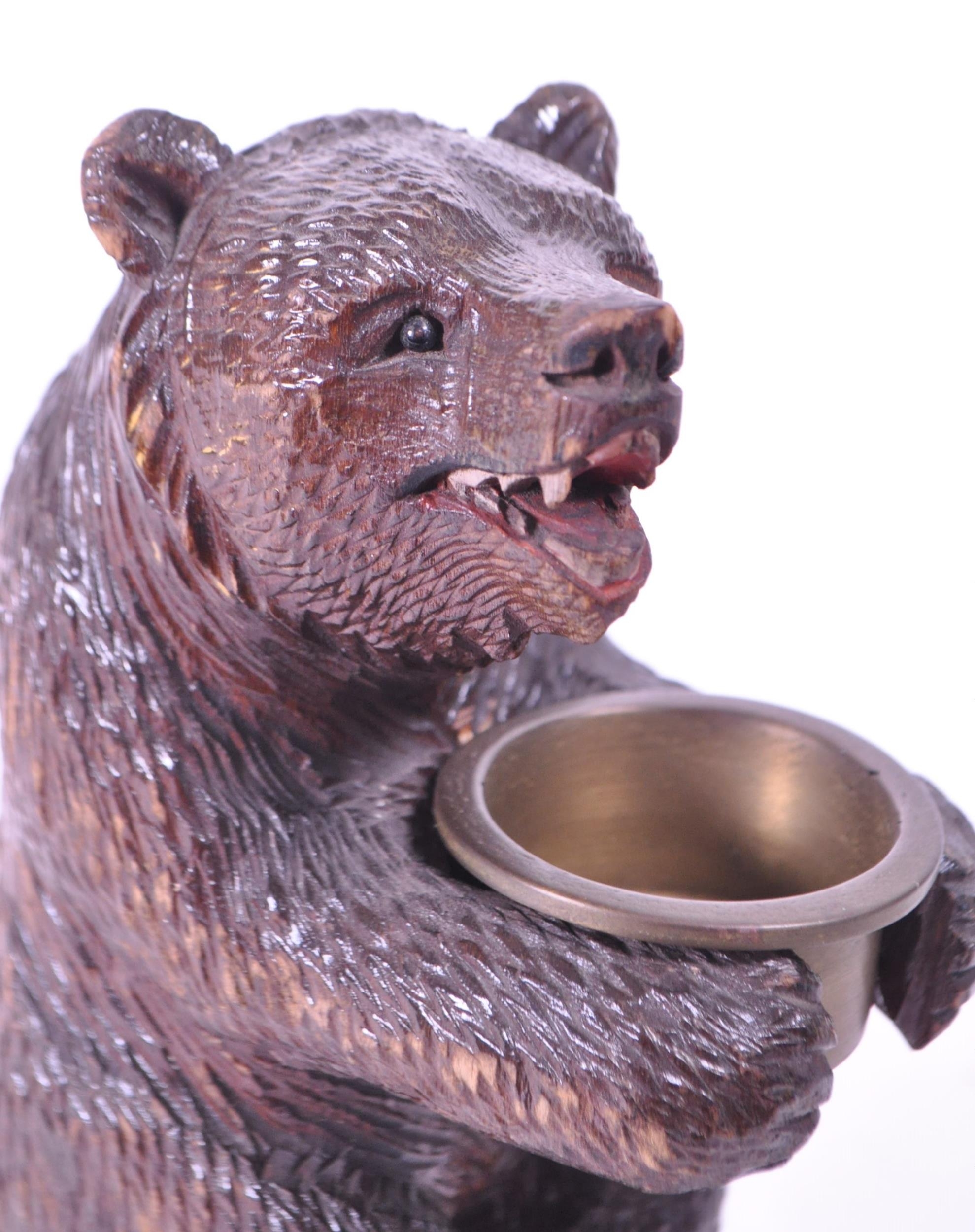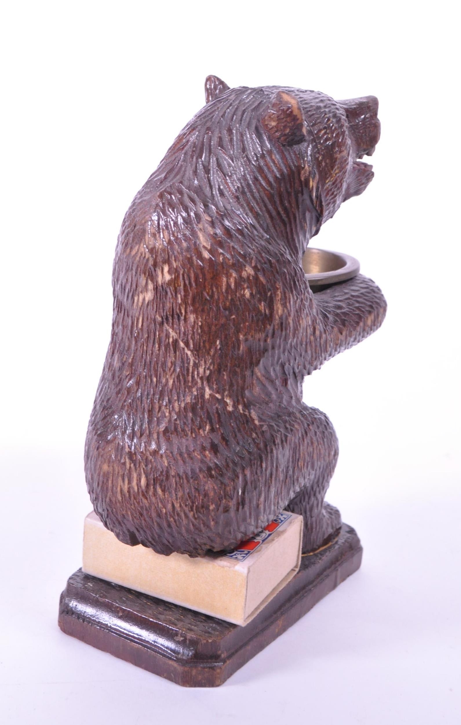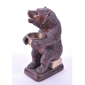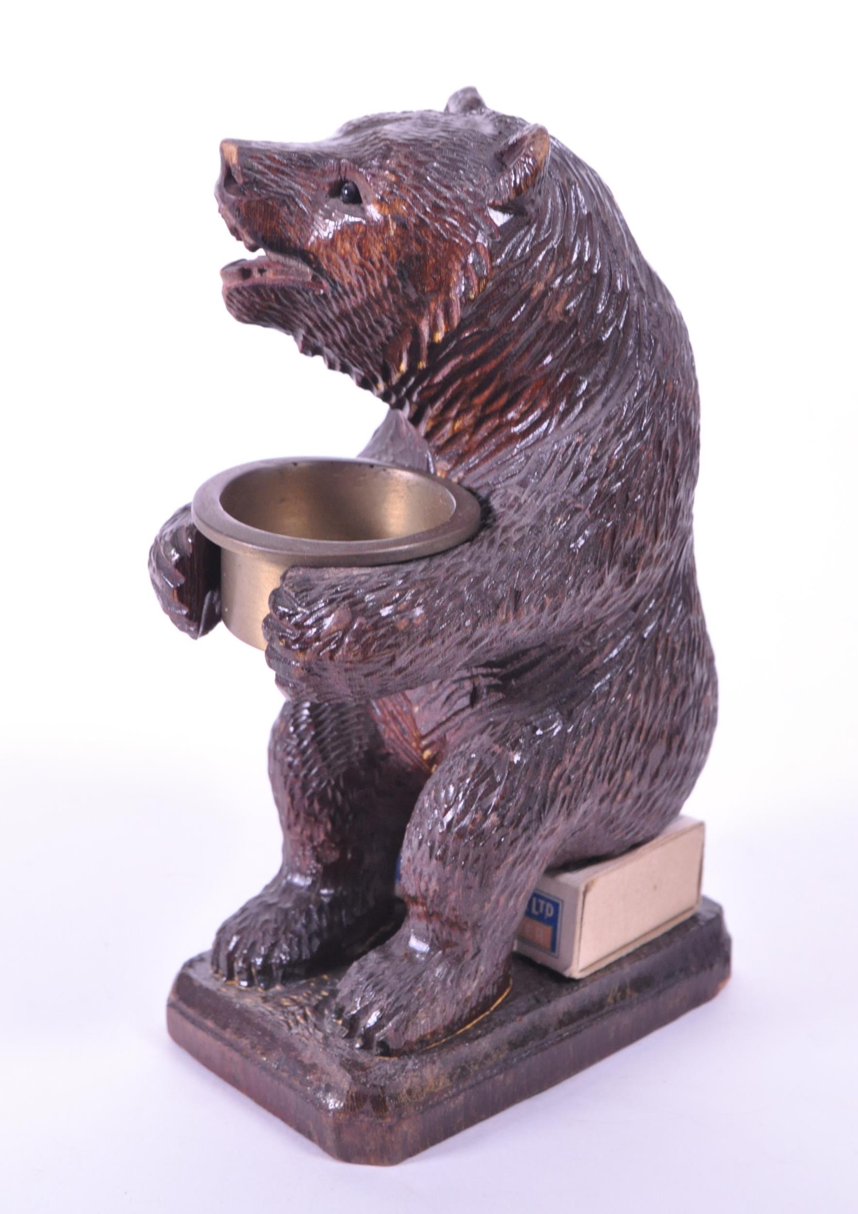 20th century German black forest wooden carved bear match strike figure with metal bowl match holder and England's Glory match stick positioned underneath where the bear is sitting. Raised on a rectangular wooden plinth style base. Measuring approx. 16cm x 6cm x 9cm.