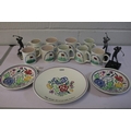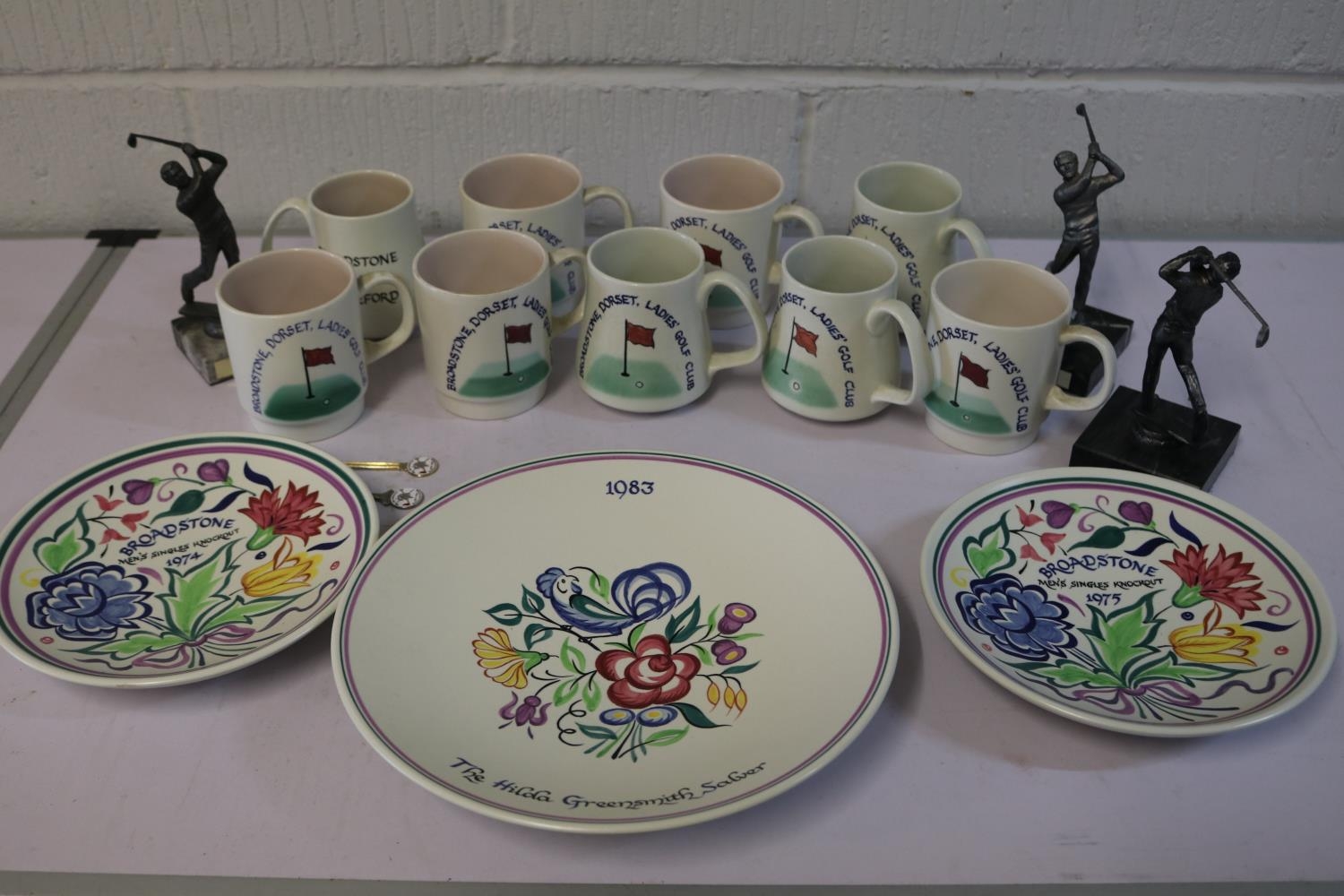 Three Poole pottery plates, quantity Poole "Broadstone Golf Club" mugs etc