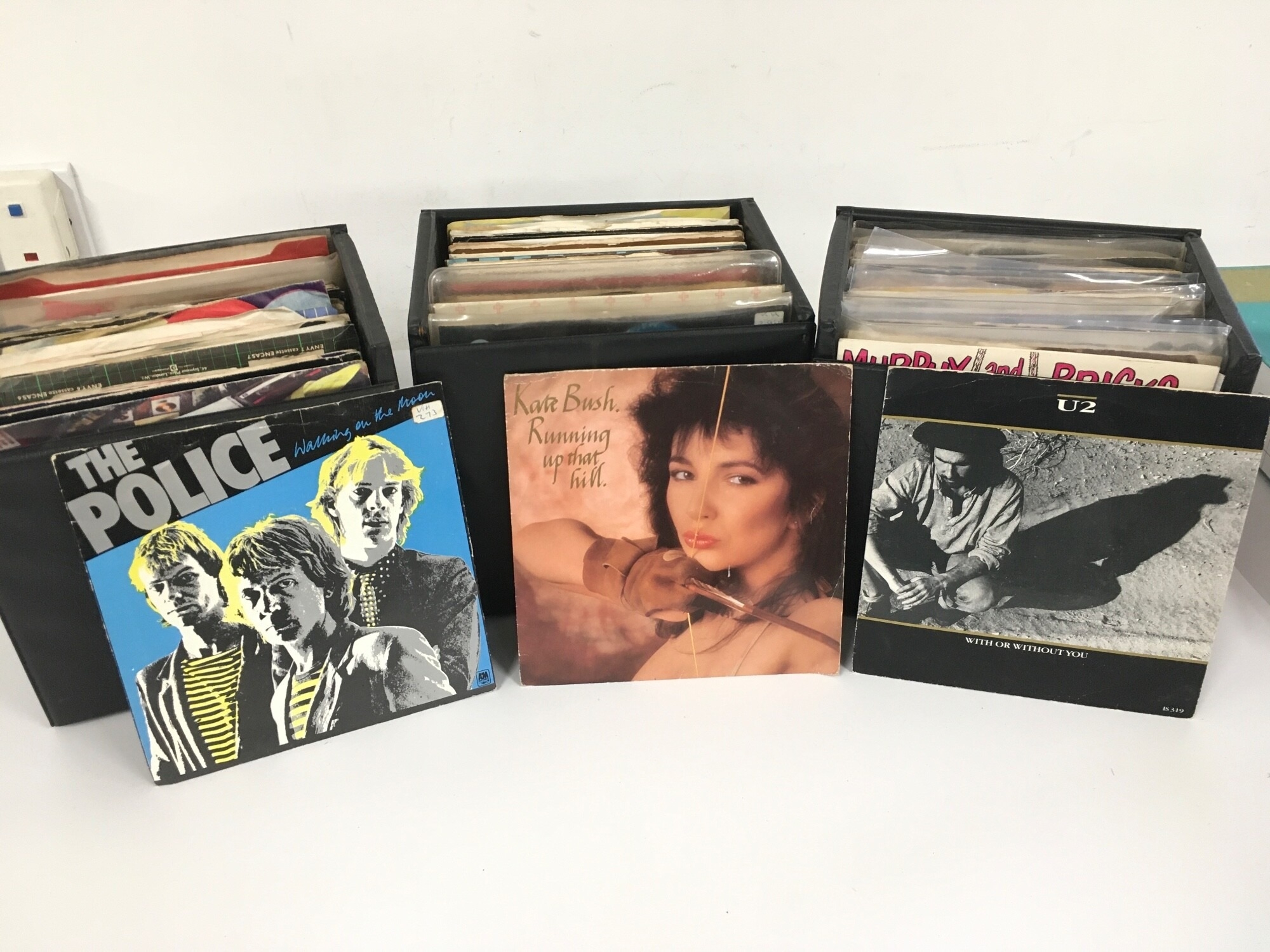 Twelve record cases of 7" singles by various artists comprising mainly 1980s titles.