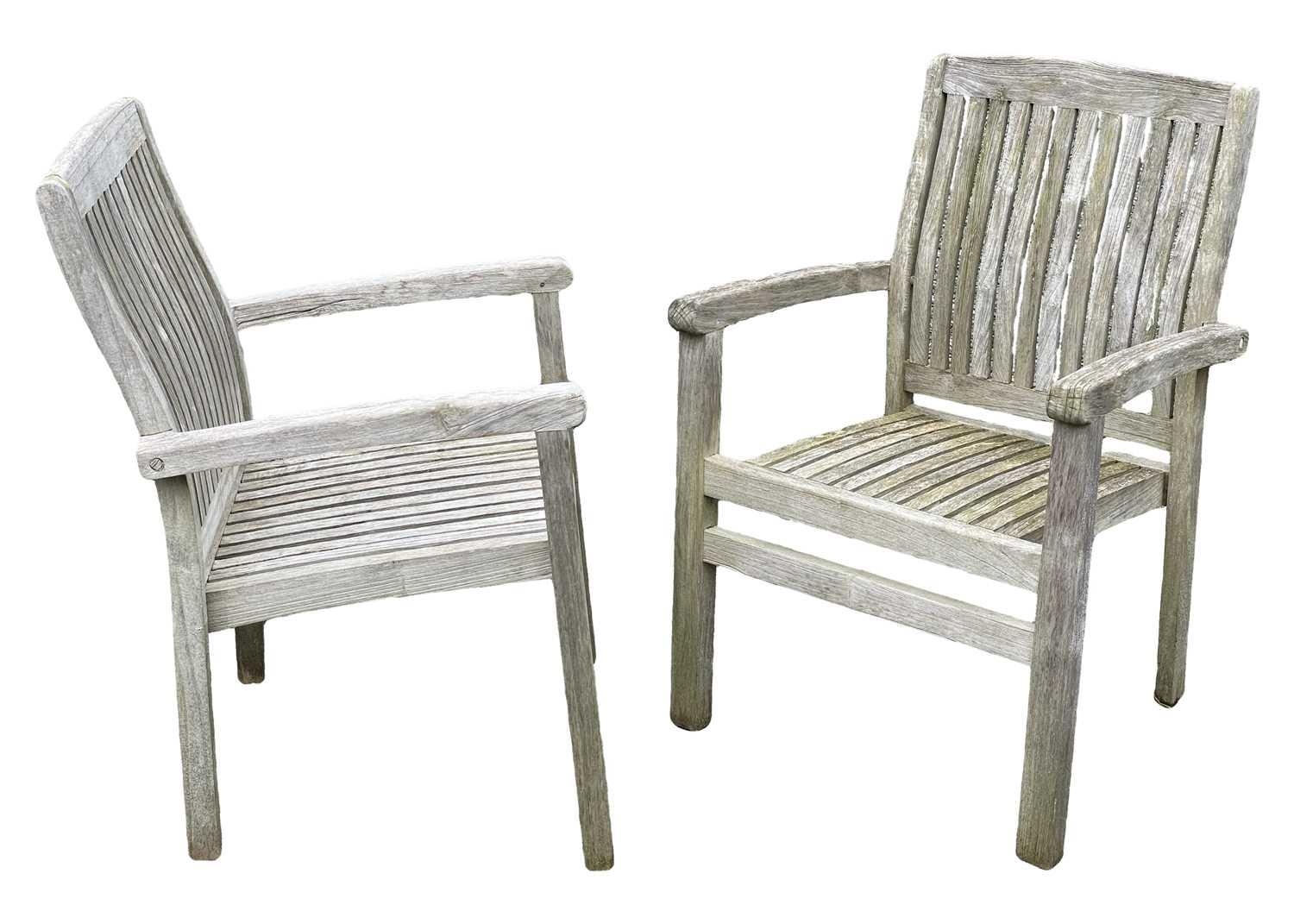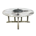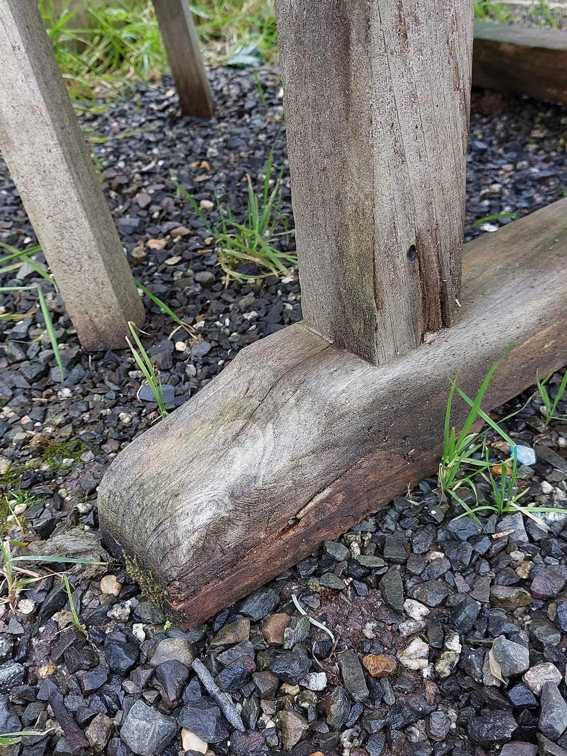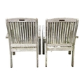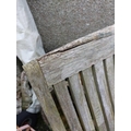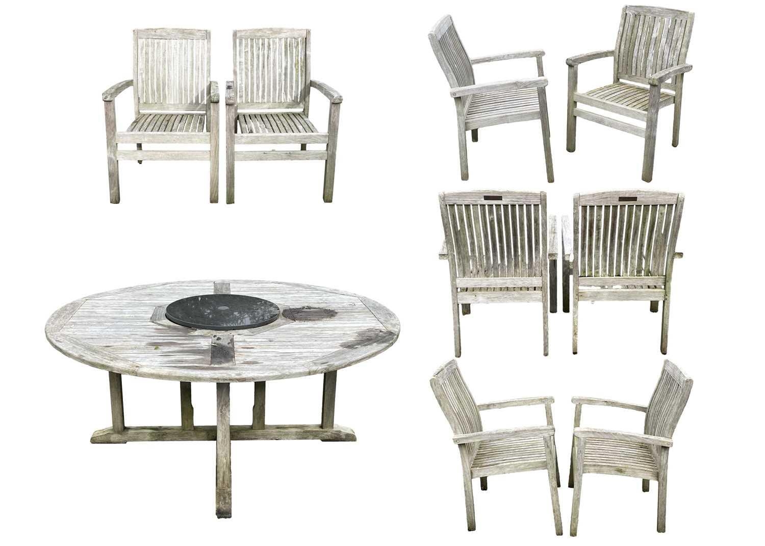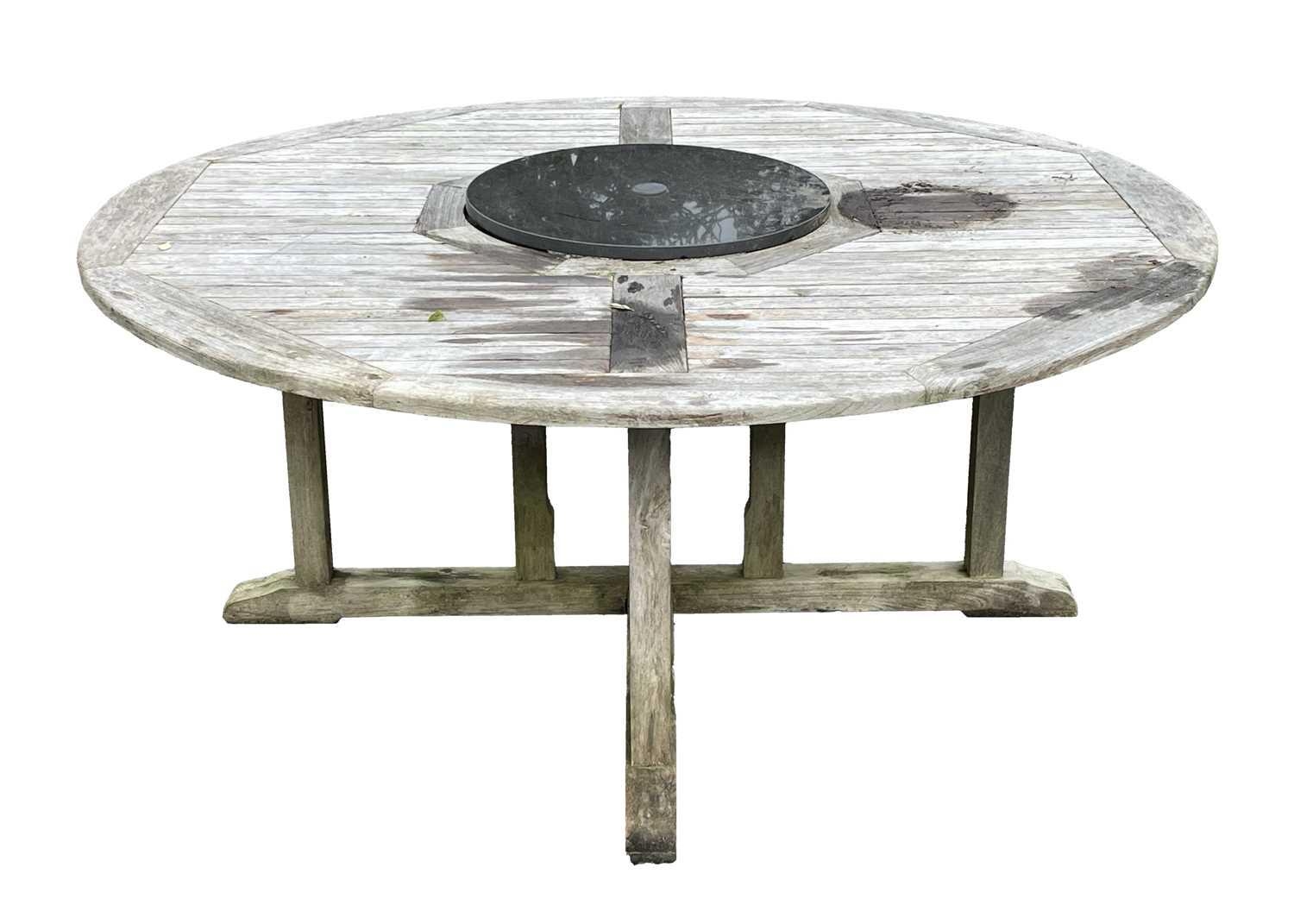 A large circular weathered teak garden table. With polished granite Lazy Susan, diameter of top 180cm, together with eight chairs (9). Chairs and table are sturdy and robust. some age cracks to wood, but no other damage. Additional images now online, thankyou.