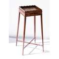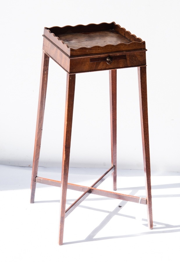 GEORGE III MAHOGANY SMALL TEA TABLE, the oblong, galleried top above a plain frieze with small, pull-out slide, raised on square, tapering legs tied by an X stretcher, 27 ¼” (69.2cm) high, 14” x 13 ½” (35.5cm x 34.3cm)