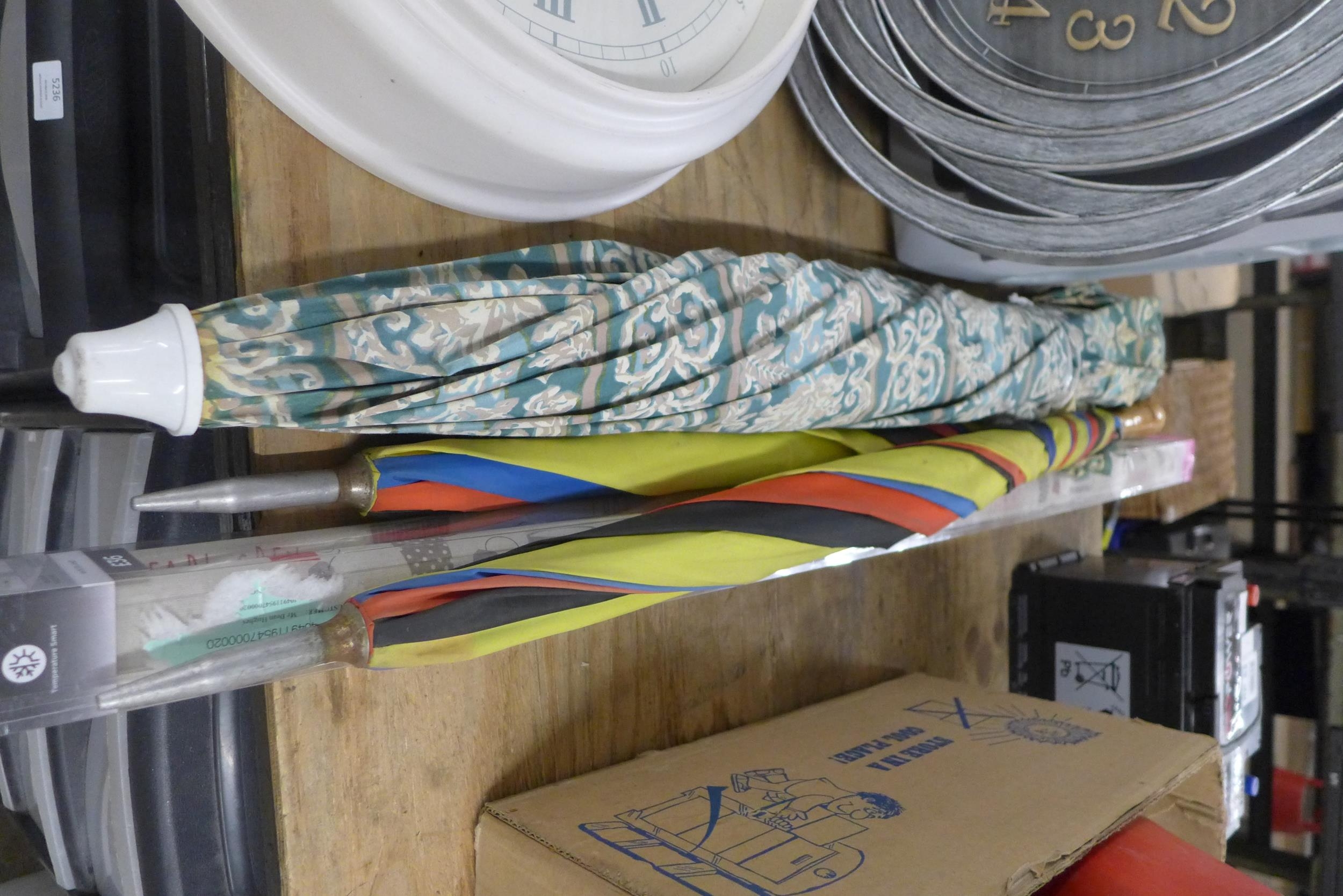 A quantity of household items including 2 clocks, a roller blind and 3 parasols
