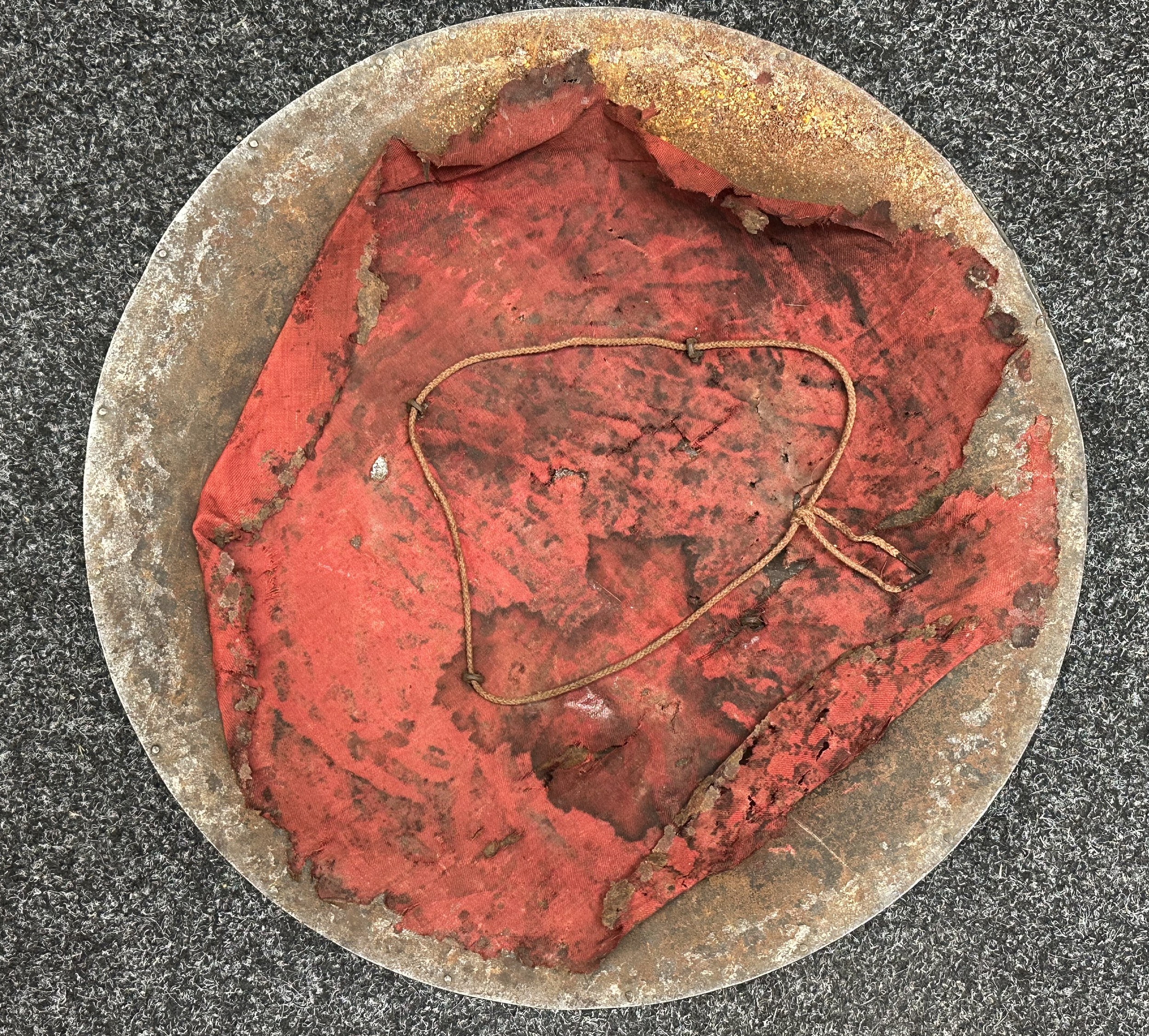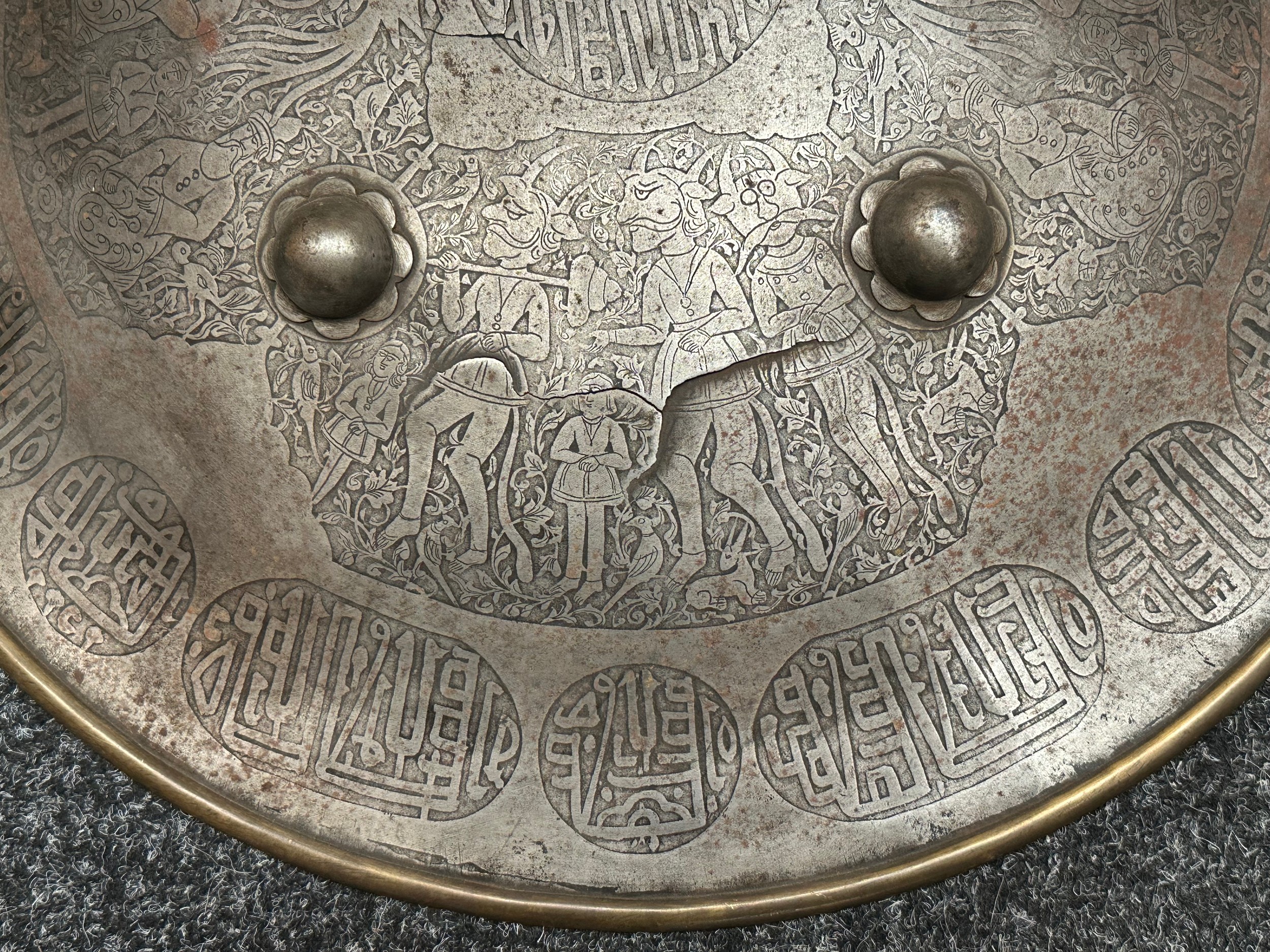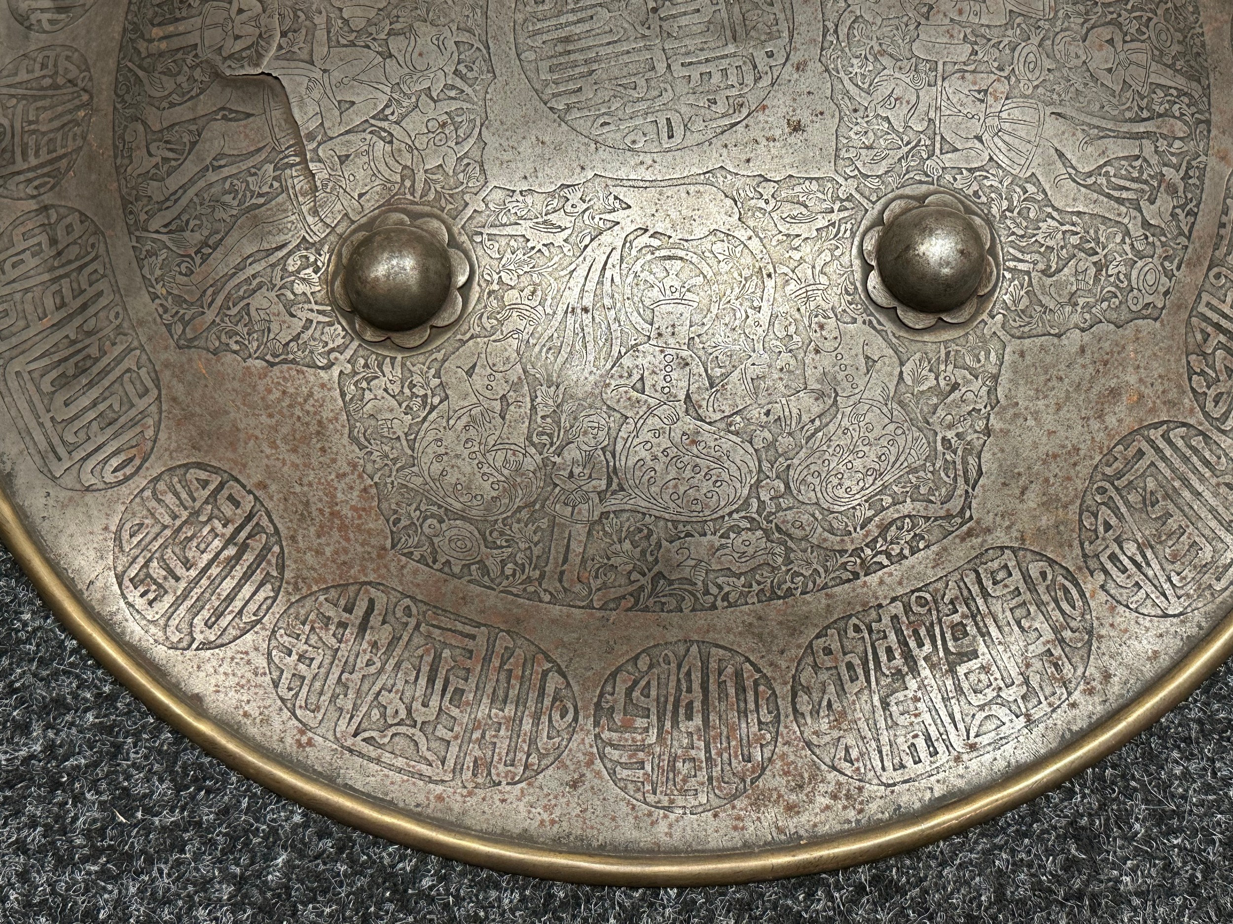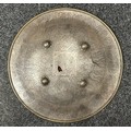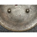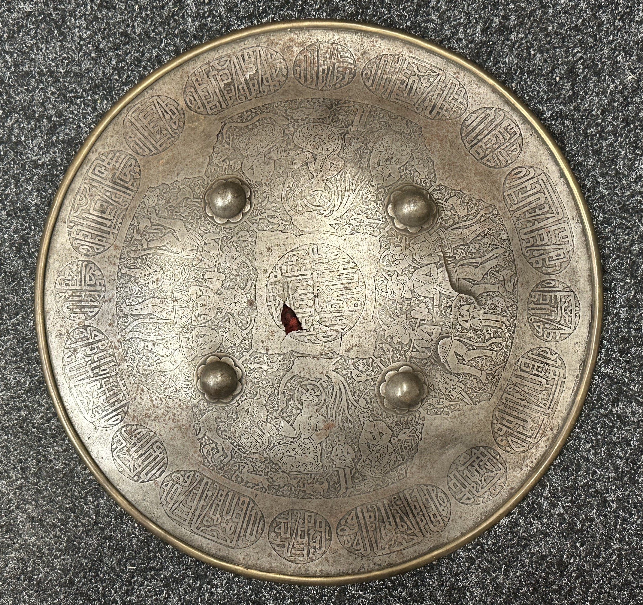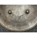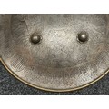 Indian Dhal Shield with battle damage. Steel with separate brass edging. 470mm in diameter. Eched decoration overall. Remains of red cloth lining to the reverse.