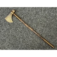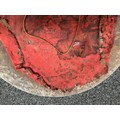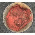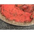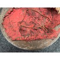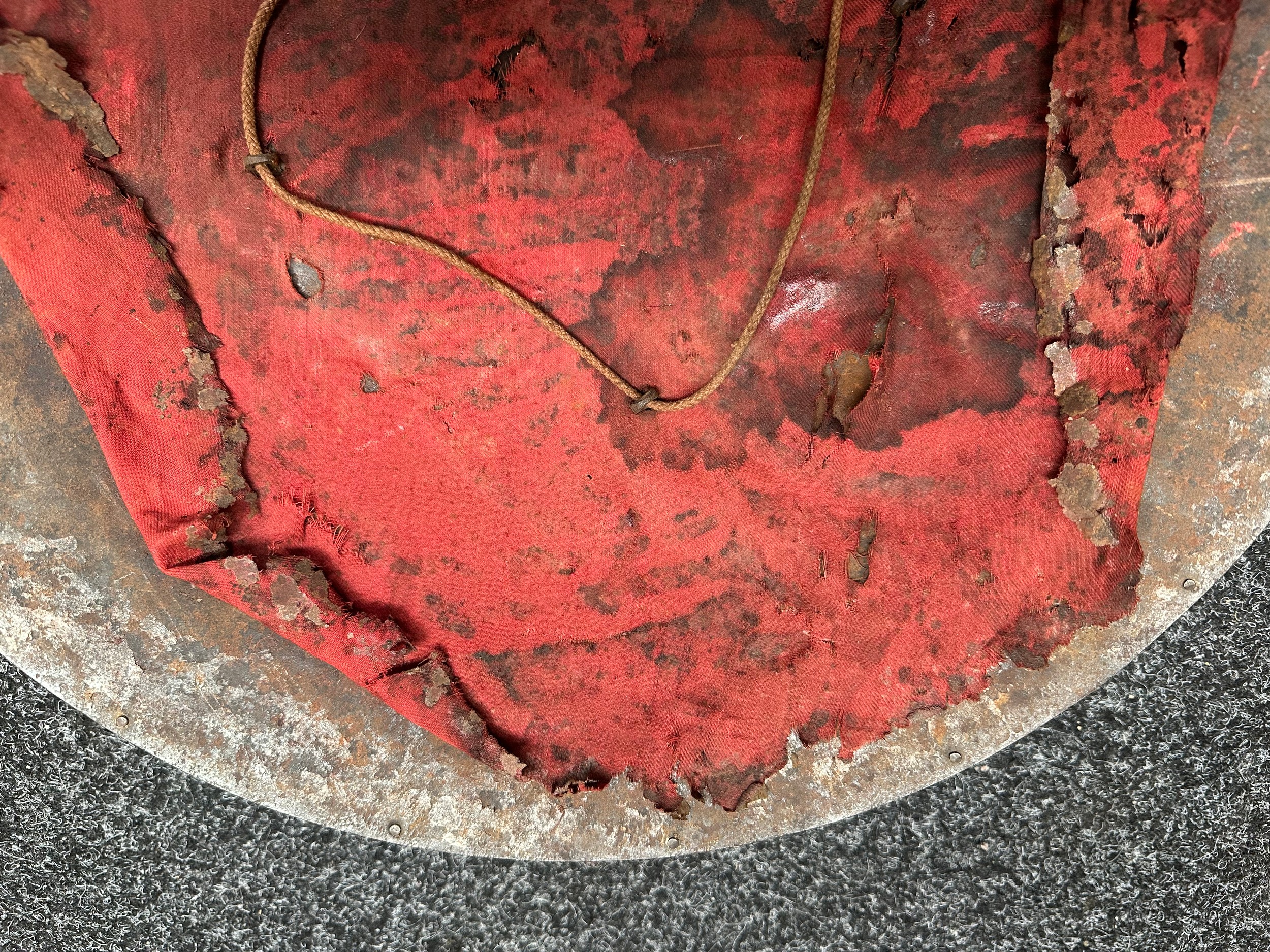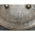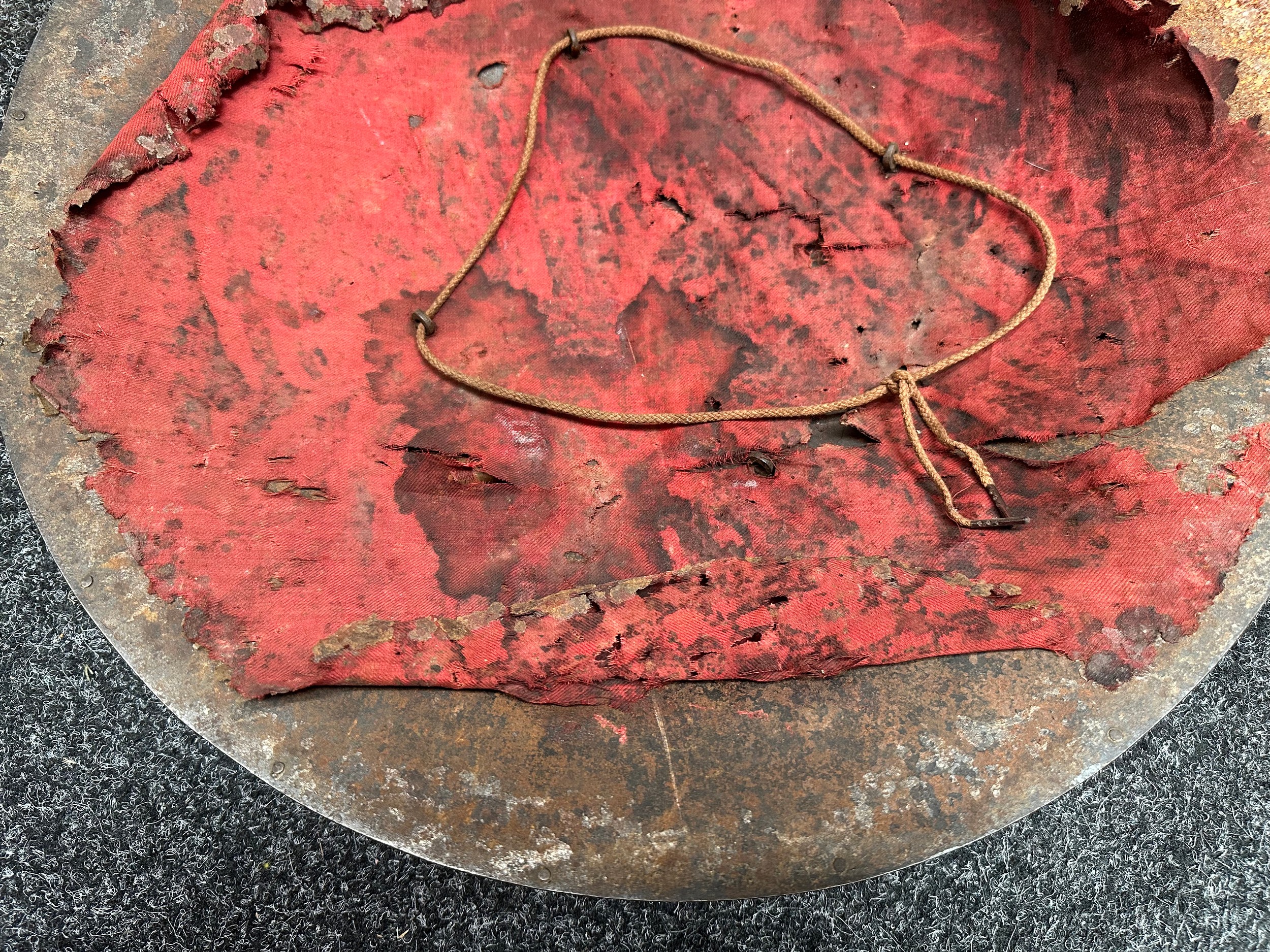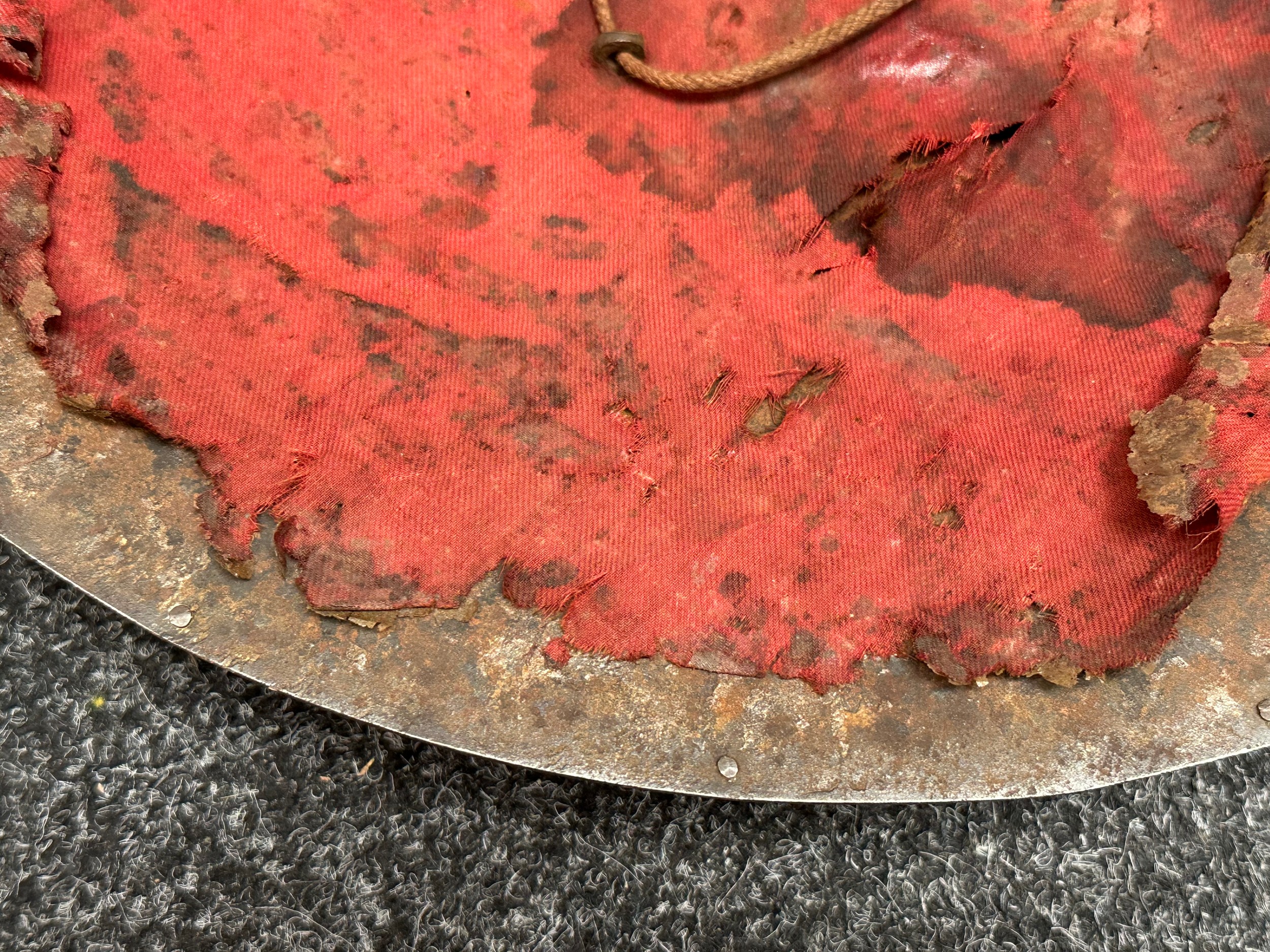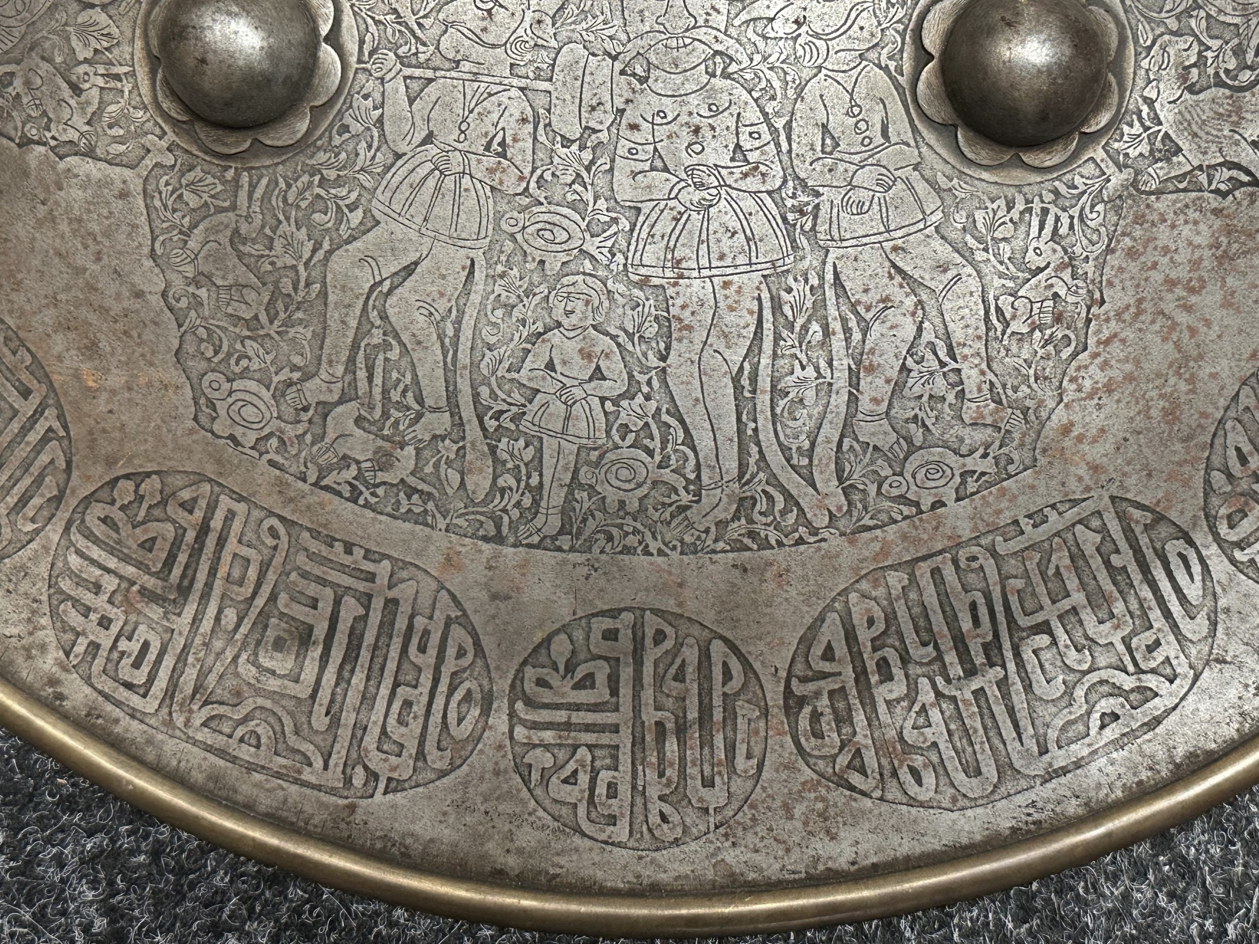 Indian Dhal Shield with battle damage. Steel with separate brass edging. 470mm in diameter. Eched decoration overall. Remains of red cloth lining to the reverse.