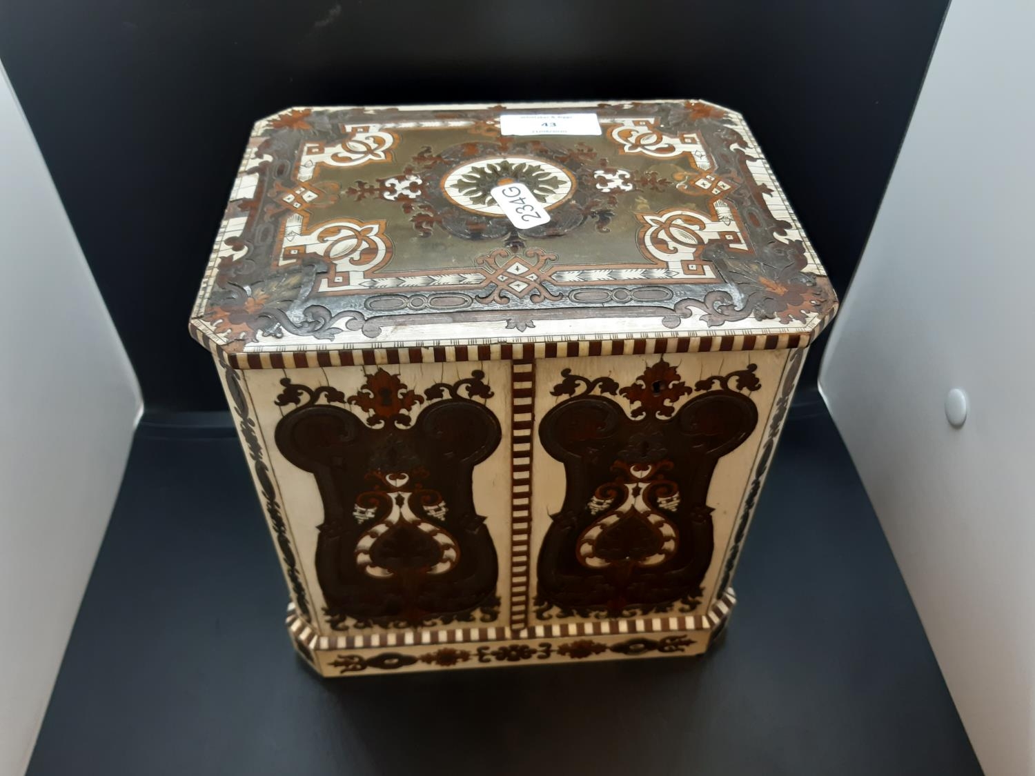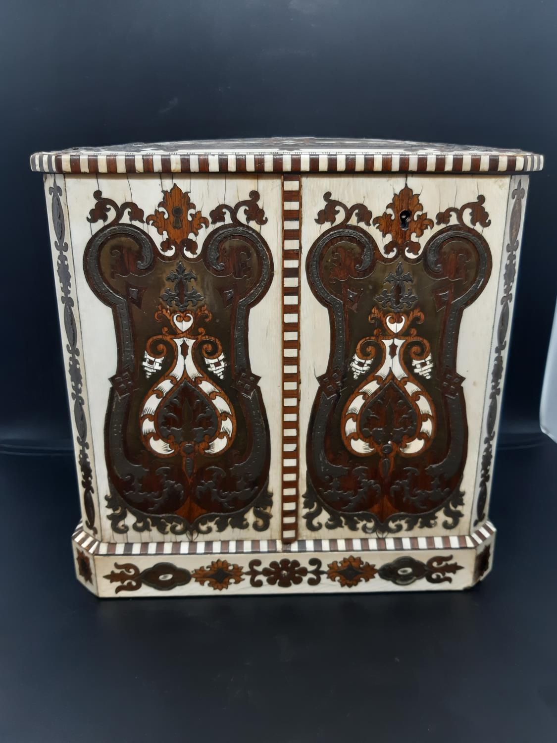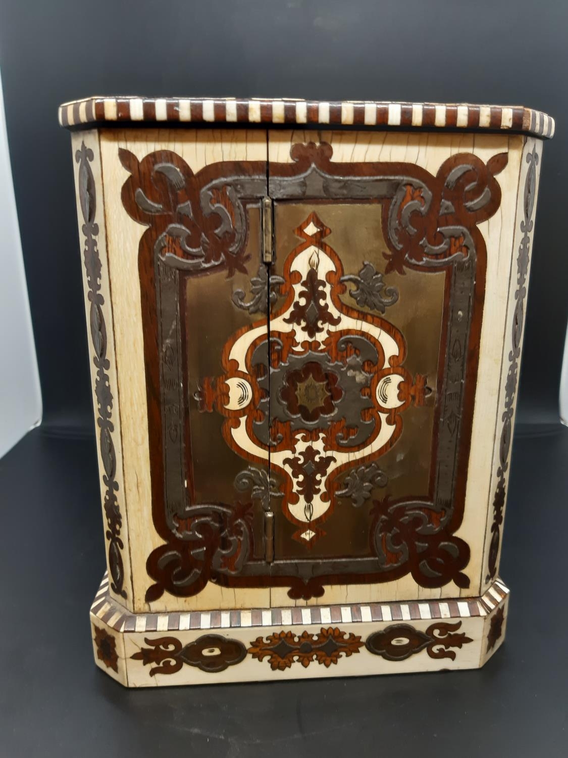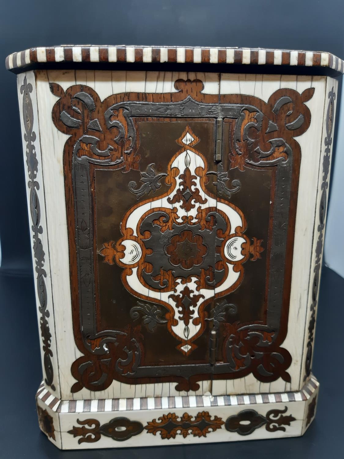 A believed French 19th century rosewood concealed cigar box with intricate brass, pewter and ivory inlay, hinged top and inner cigar storage
