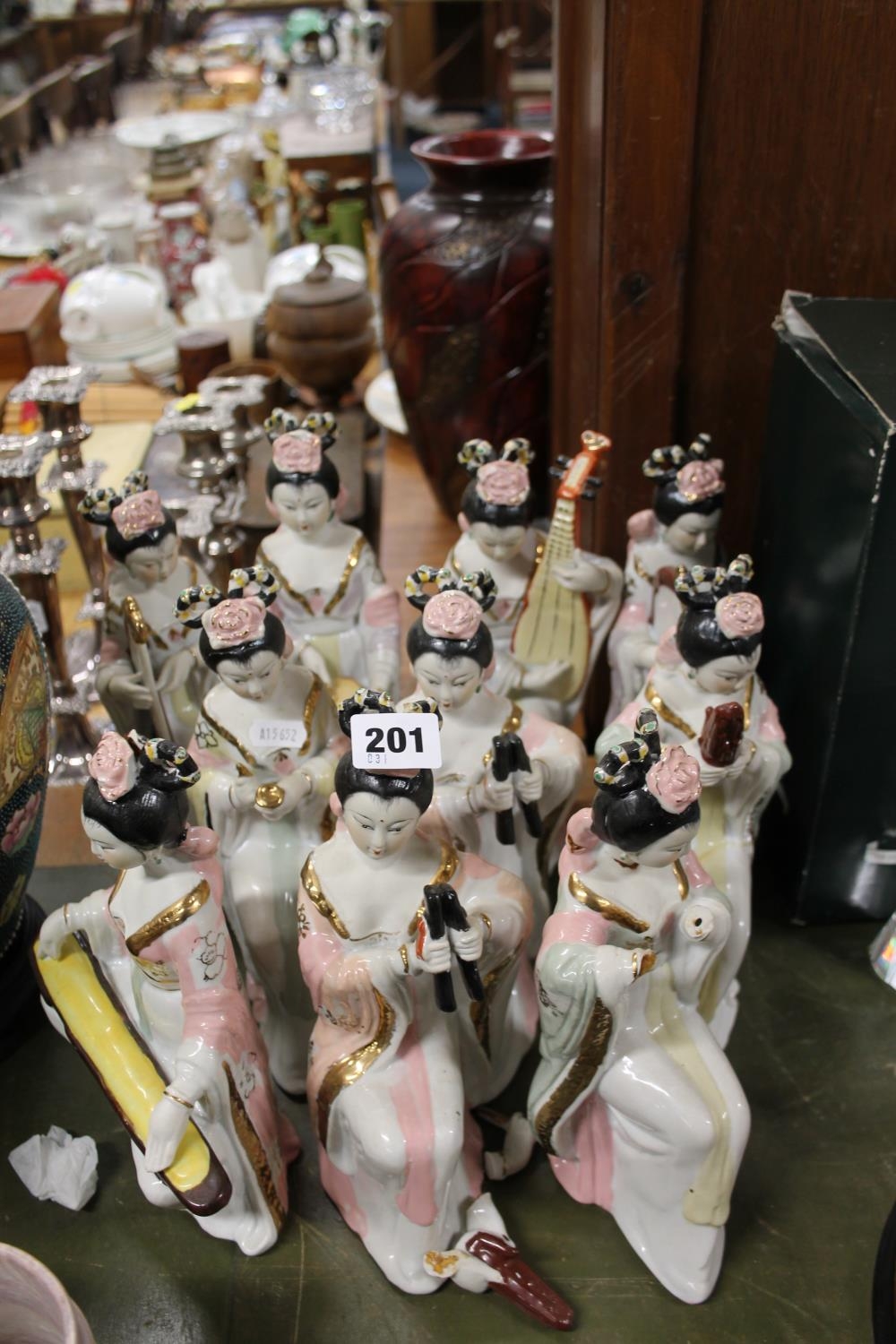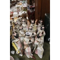 Ten reproduction oriental geisha figures.