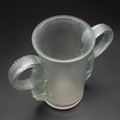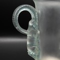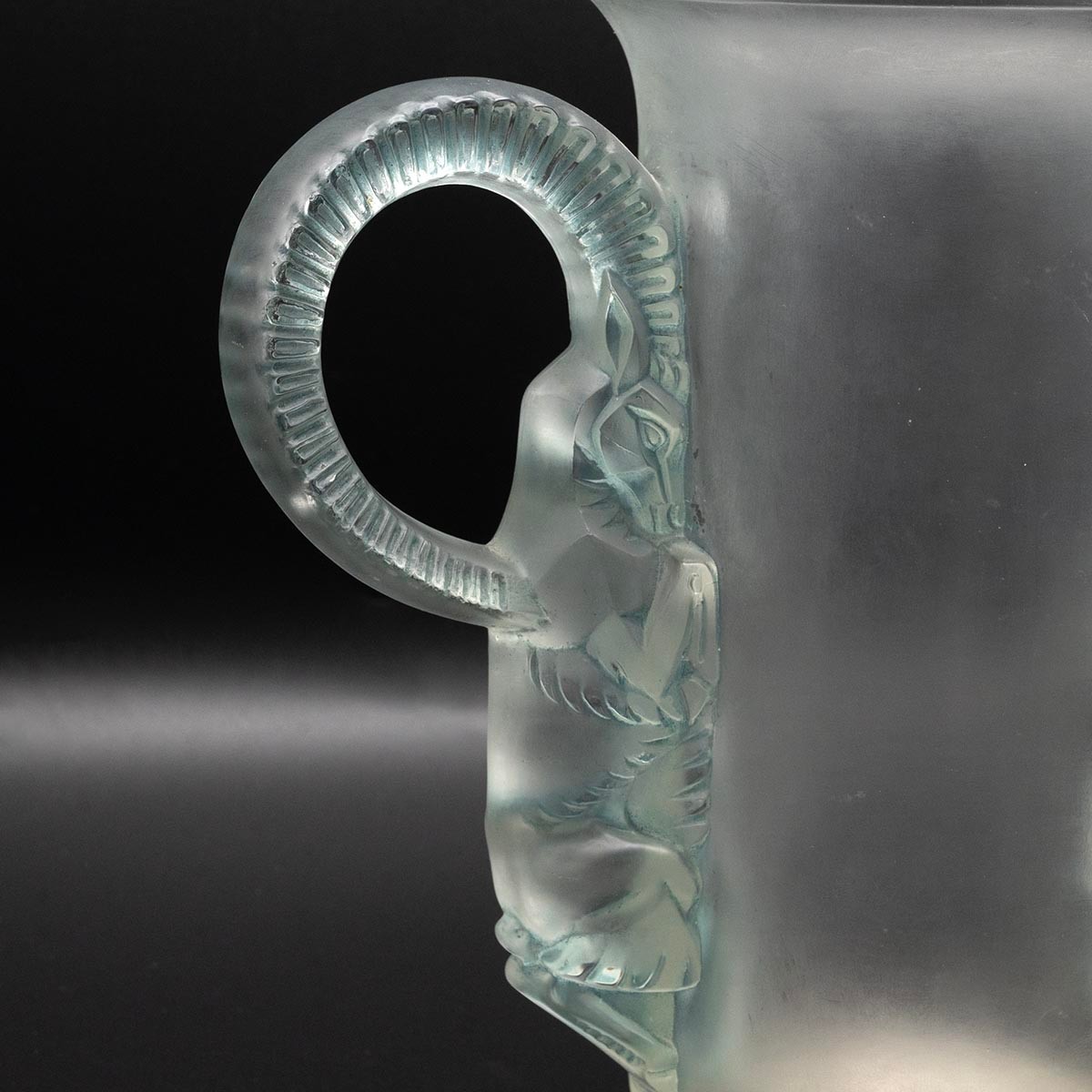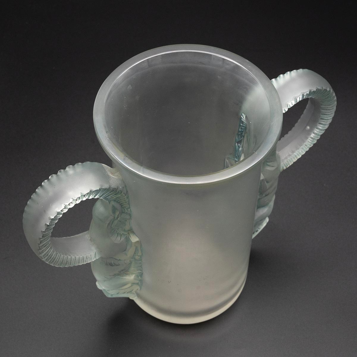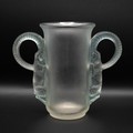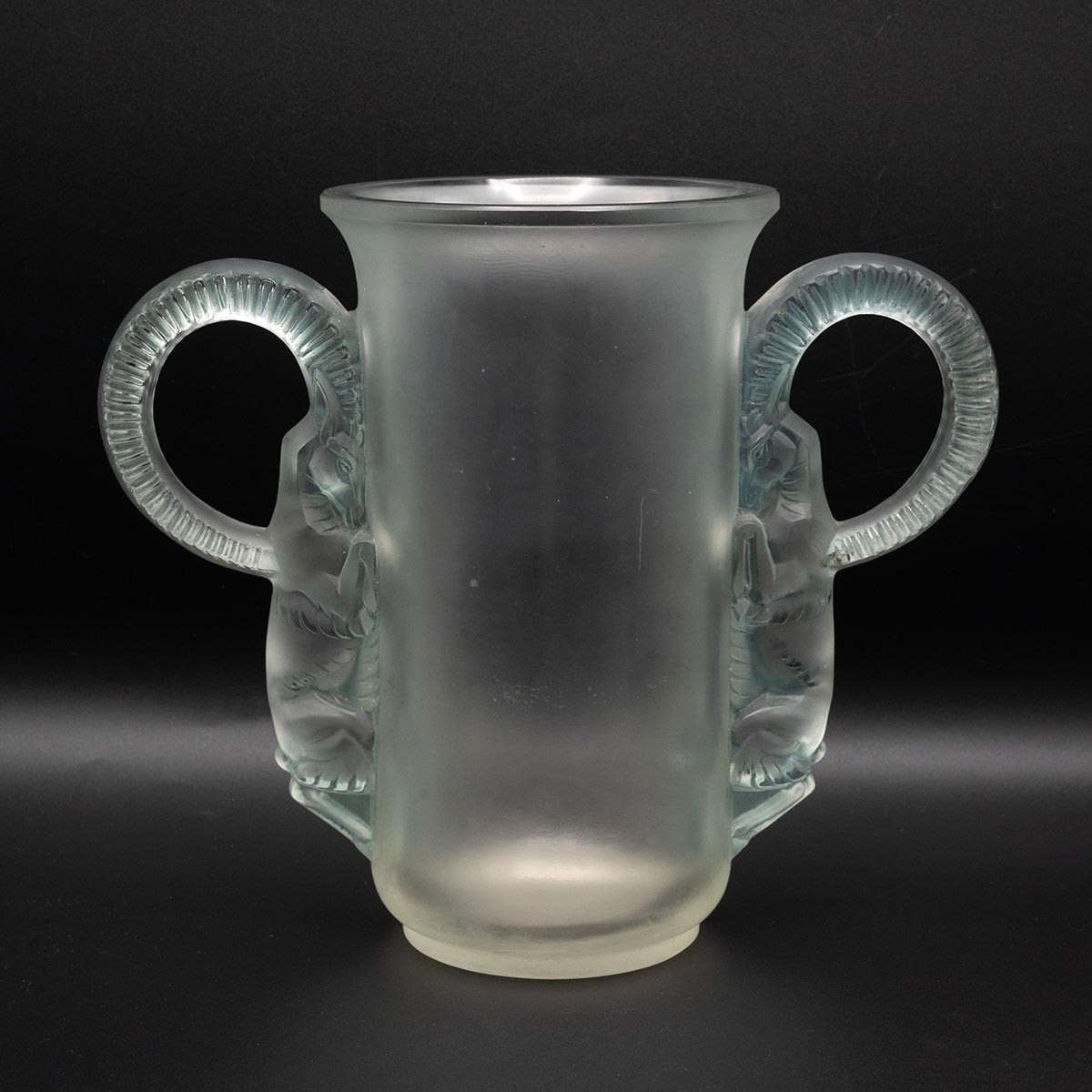 Rene Lalique Thibet glass vase. Model 1083, designed c1931, signed 'R. Lalique France' to base, frosted finish with coloured highlights to handle details, mountain goat/antelope handles, H 20.5cm, Dia rim 12cm.