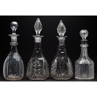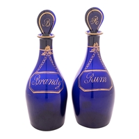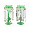 A pair of green glass lustres, with gilt decoration and hung with cut glass prisms and pendants, 32cm high, [glue repairs to one].