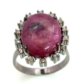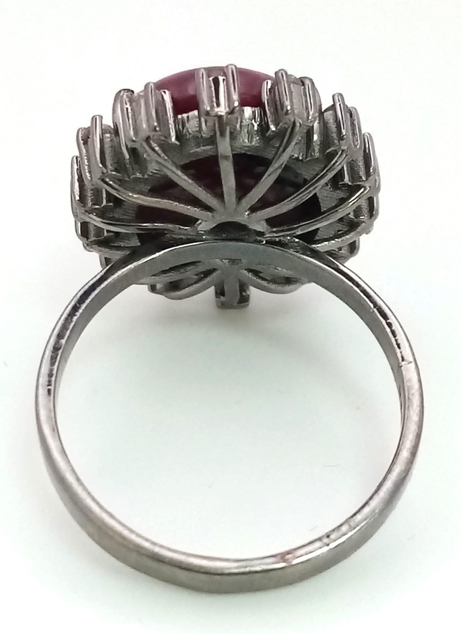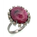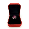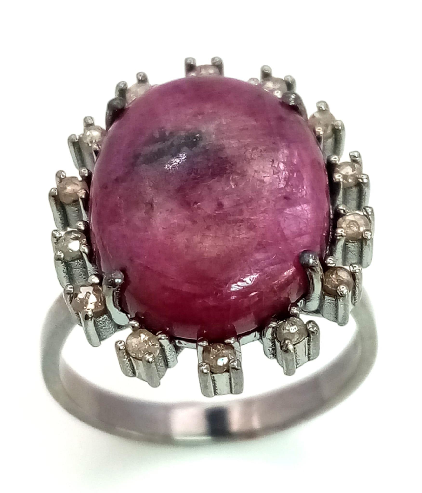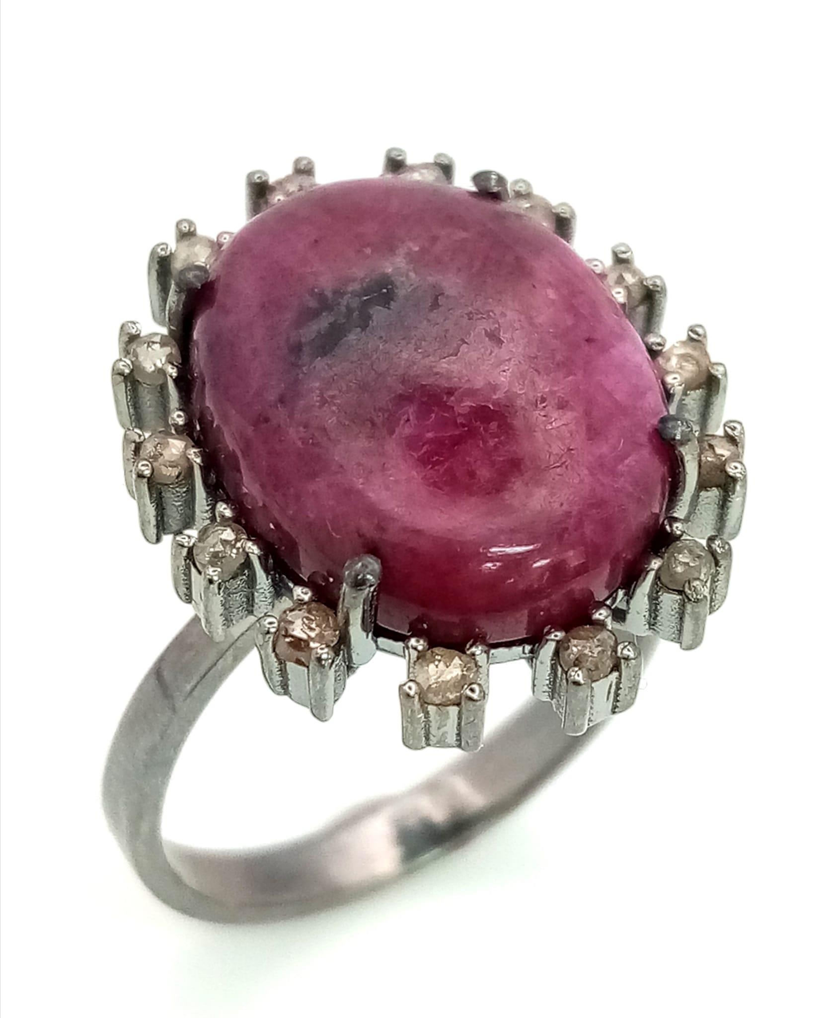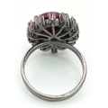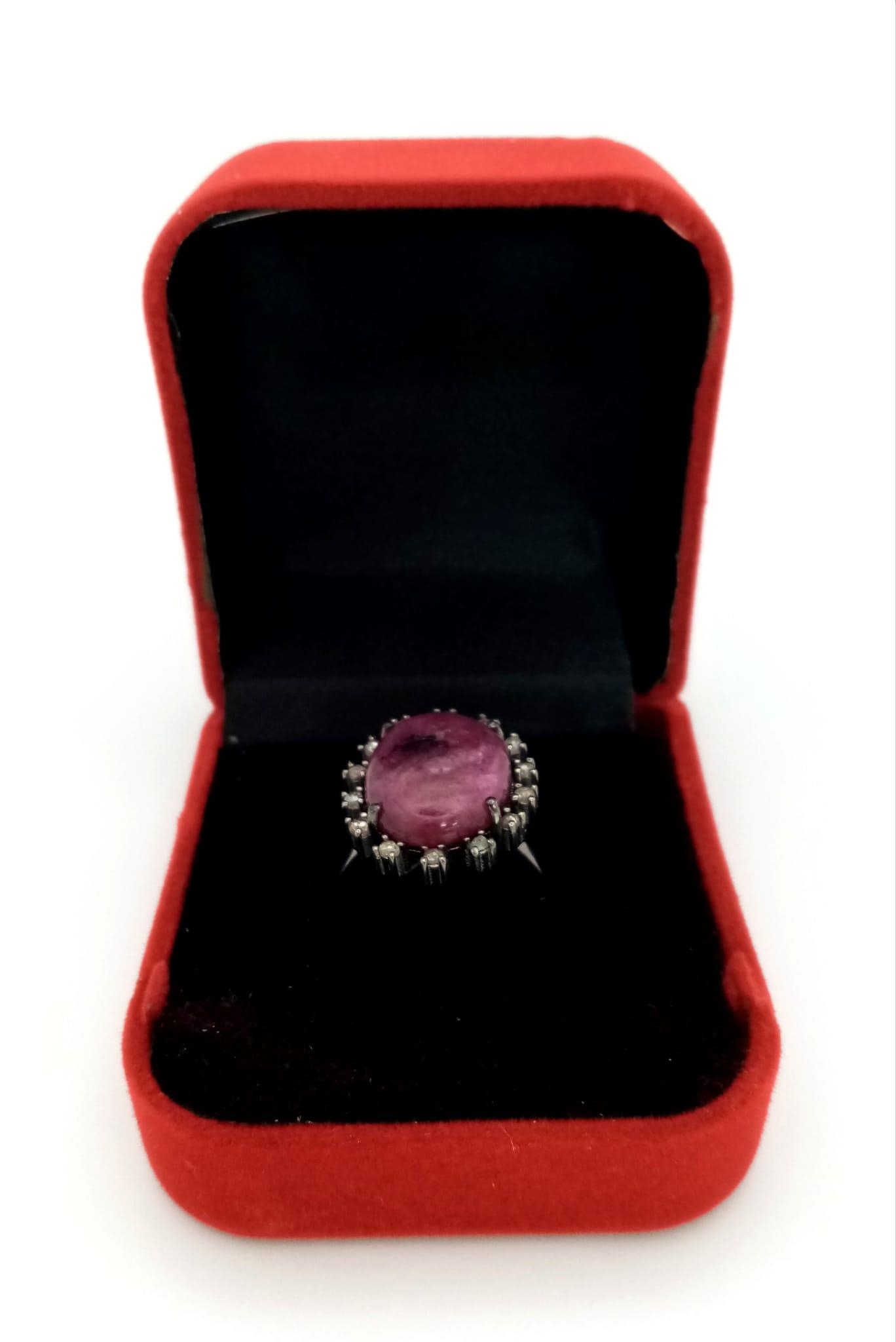 A 13.2ct Madagascan Oval Cut Ruby and Rose cut Diamond Surround Ring - 0.65ct. Set in 925 silver. Size Q. Comes with a presentation case.