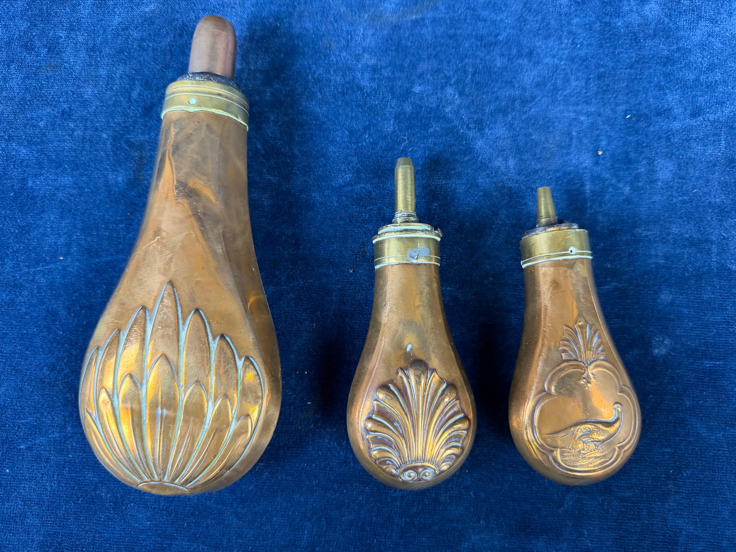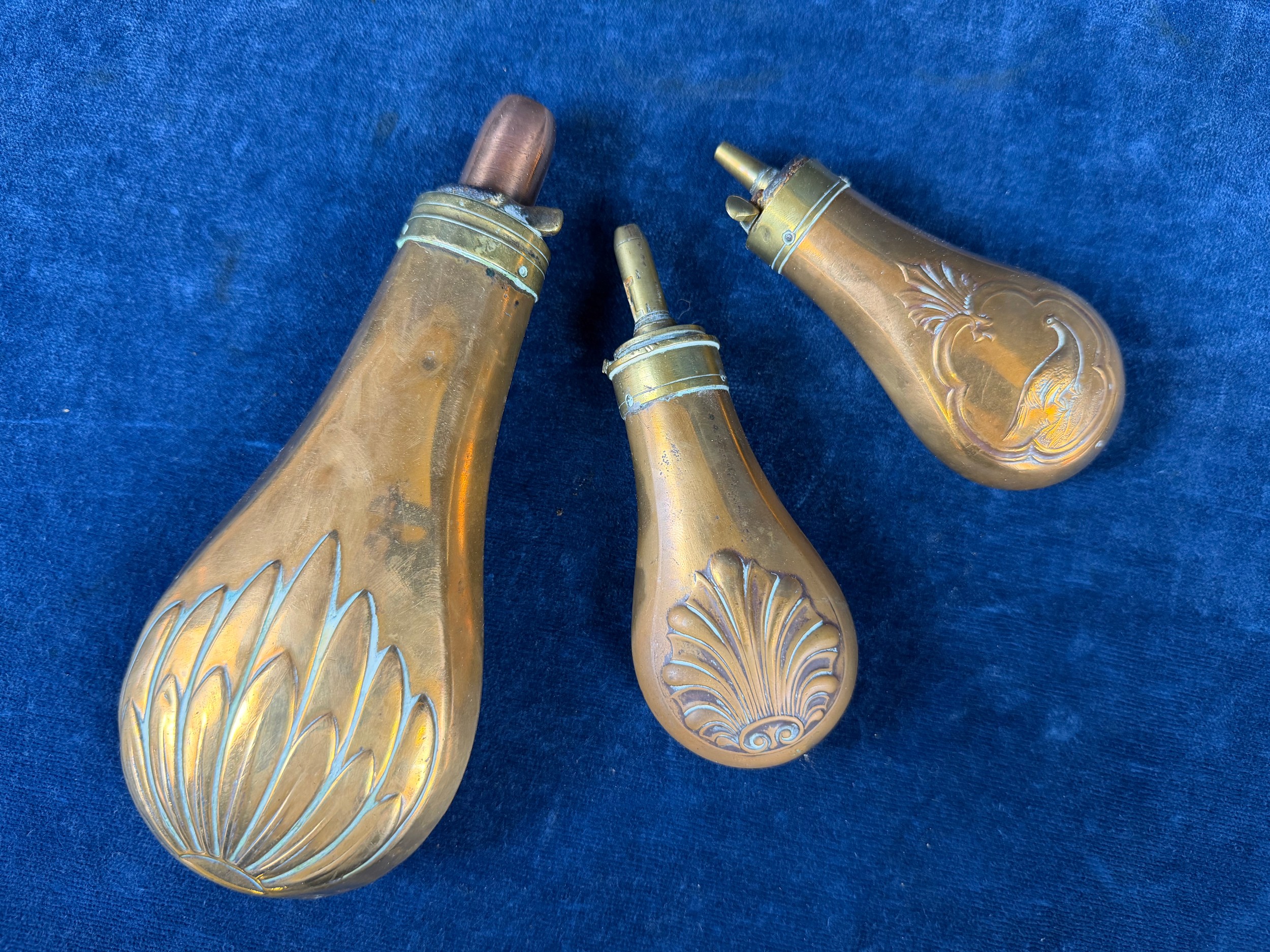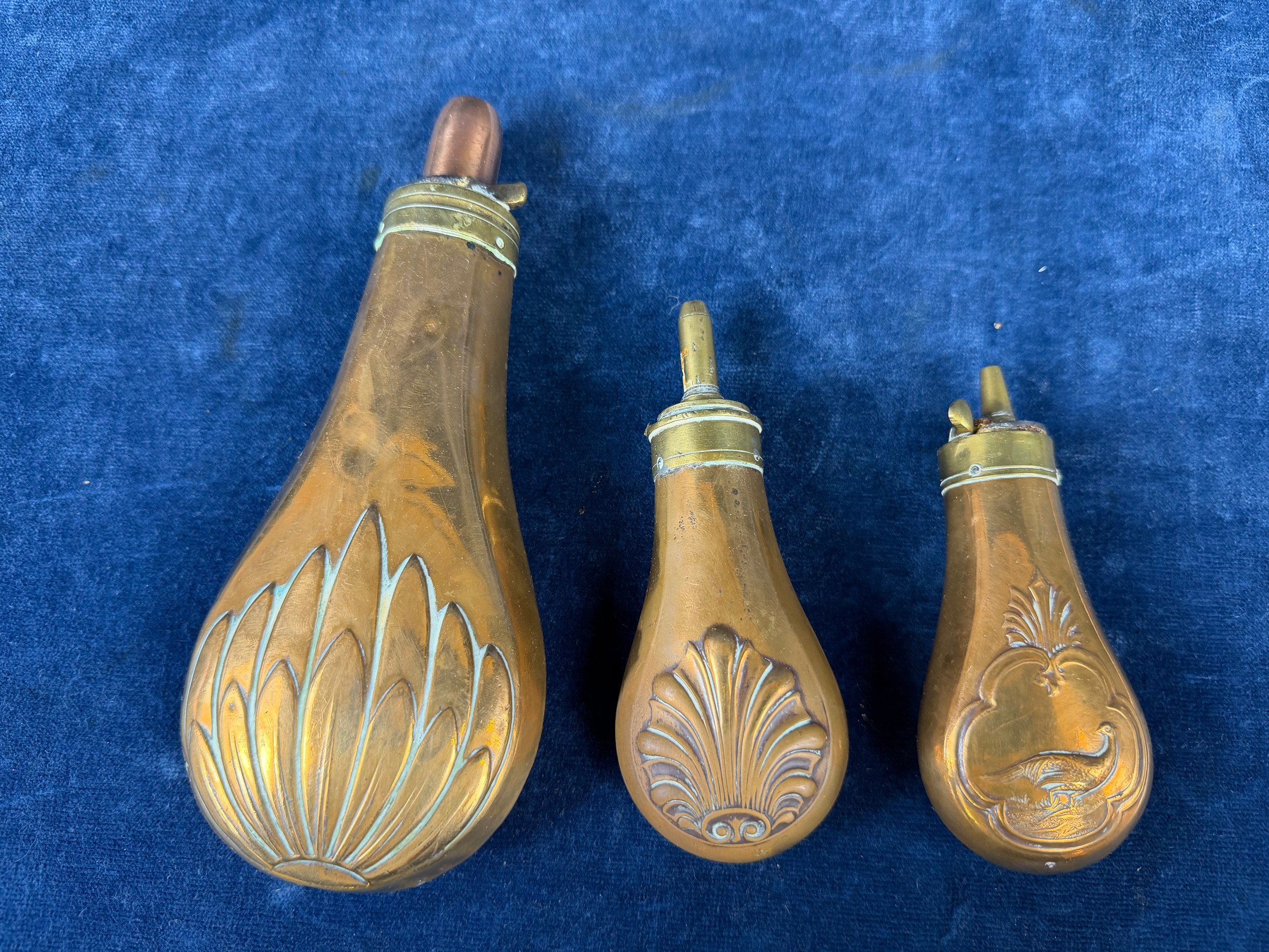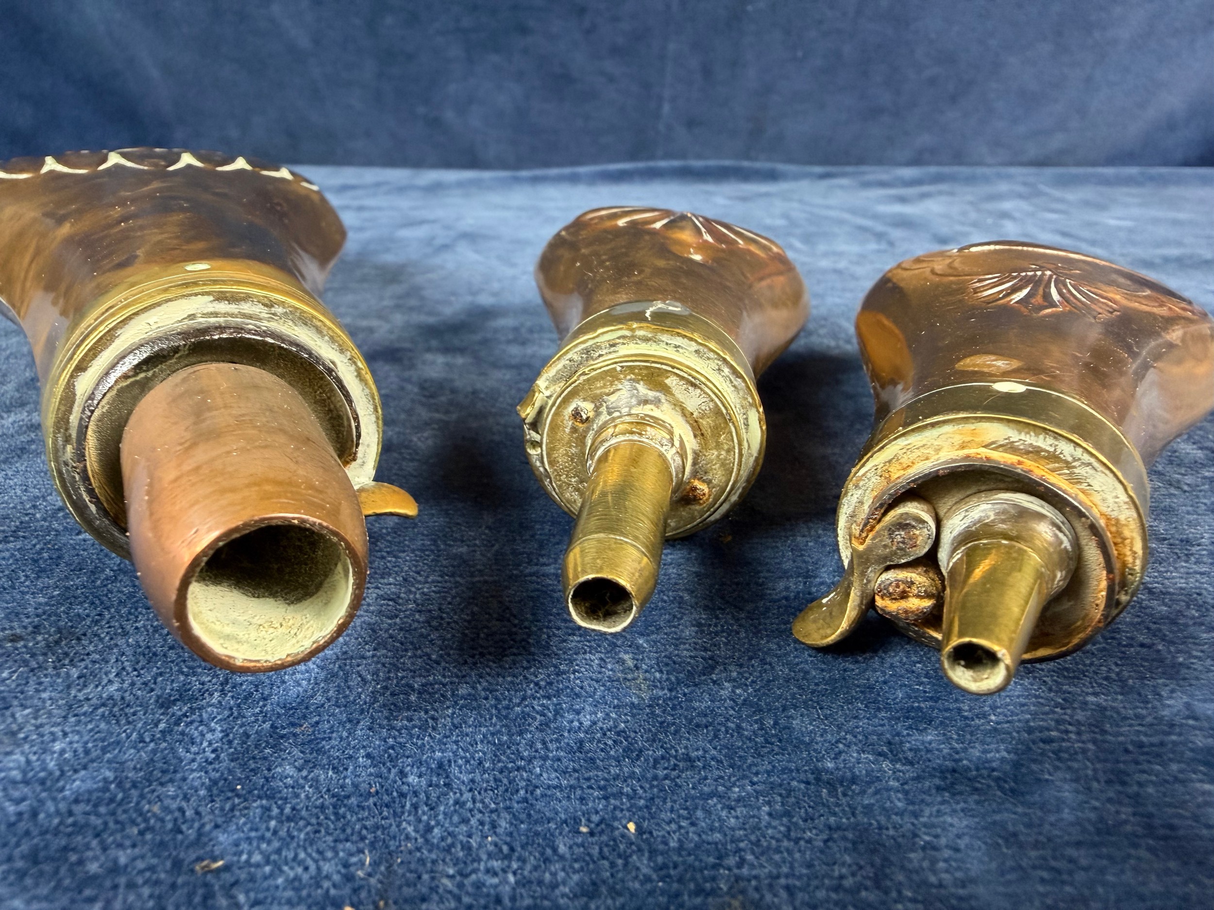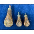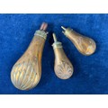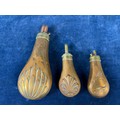Three antique copper and brass gunpowder flasks.