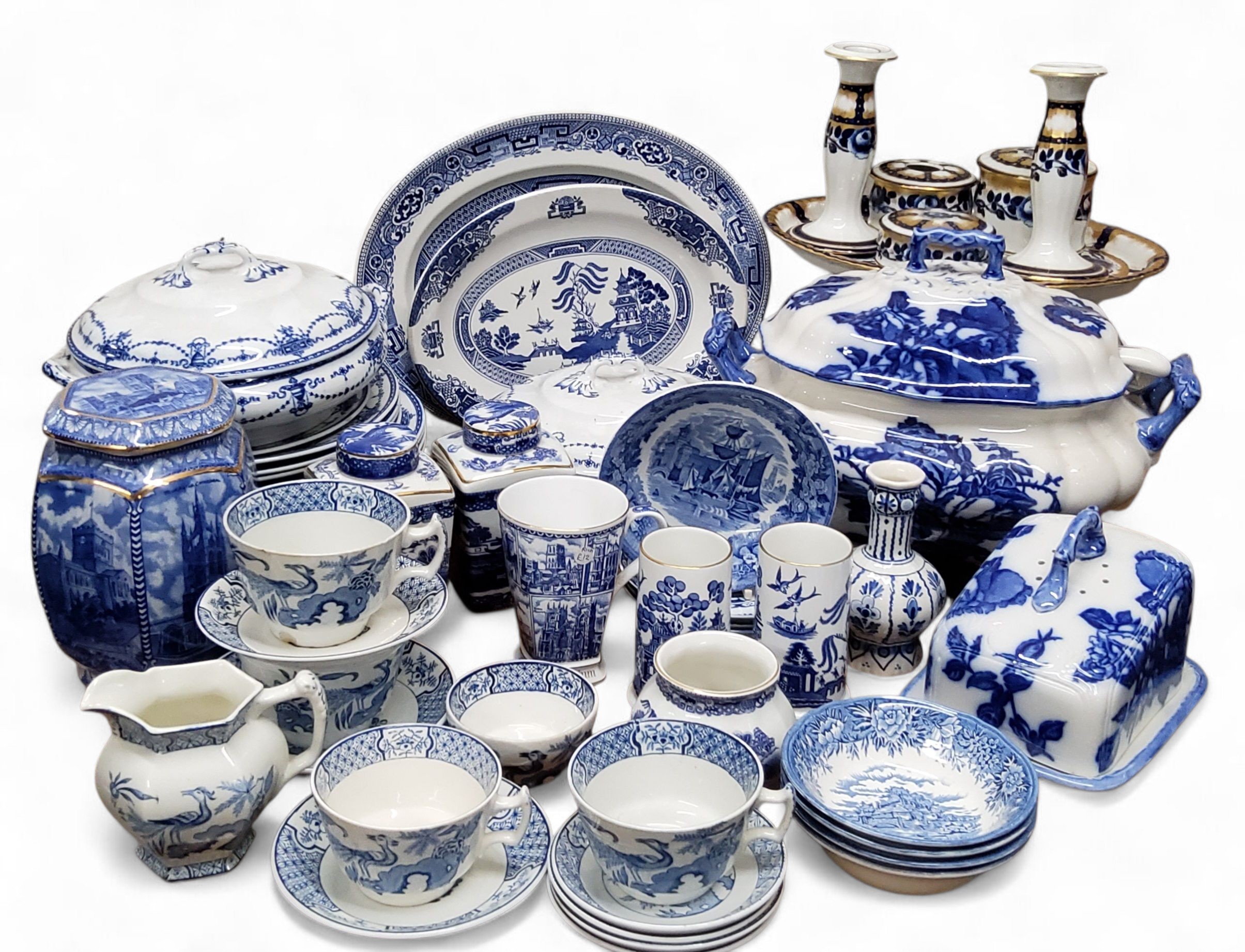 Blue and White - Ringtons Millennium 2000 biscuit barrel; tea cannisters; Coalport Willow spill vases; Wdegwood Ferrara bowl; Losol Ware part dinner service; Losol Ware Minto dressing table set; etc