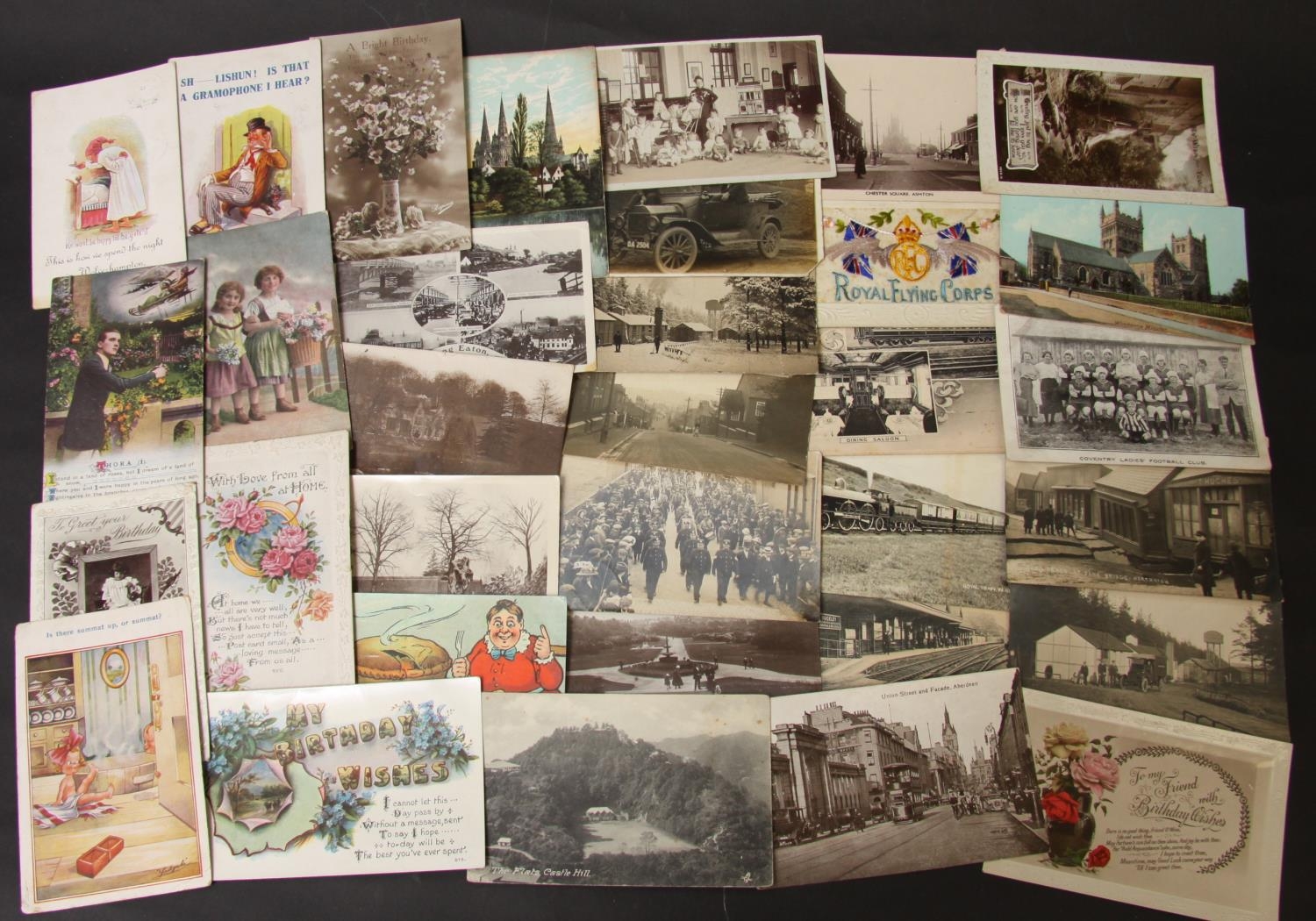 Postcards, Edward VII - George V, topo, Coventry Ladies Football Club; Rugeley Town Station; Royal Flying Corps silk cap badge card; rps including Northwich subsidence (pm 1917); Scout parade; Chester Square Ashton; humour etc