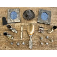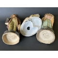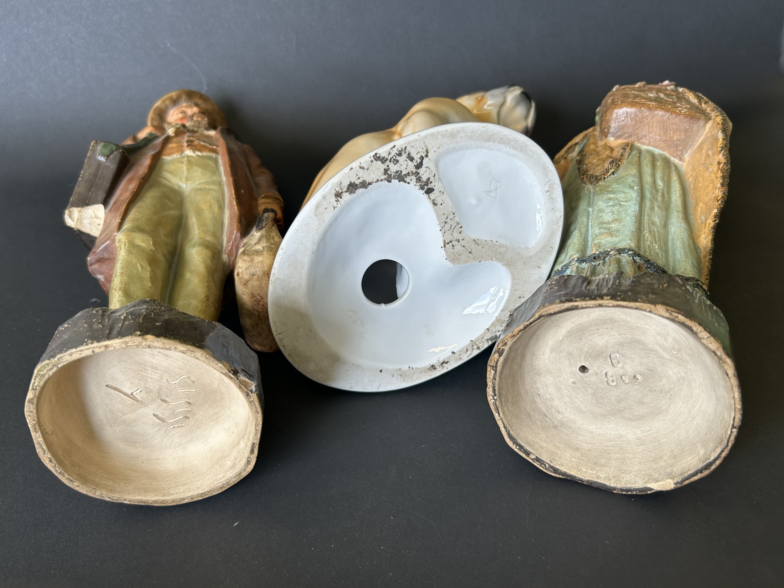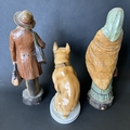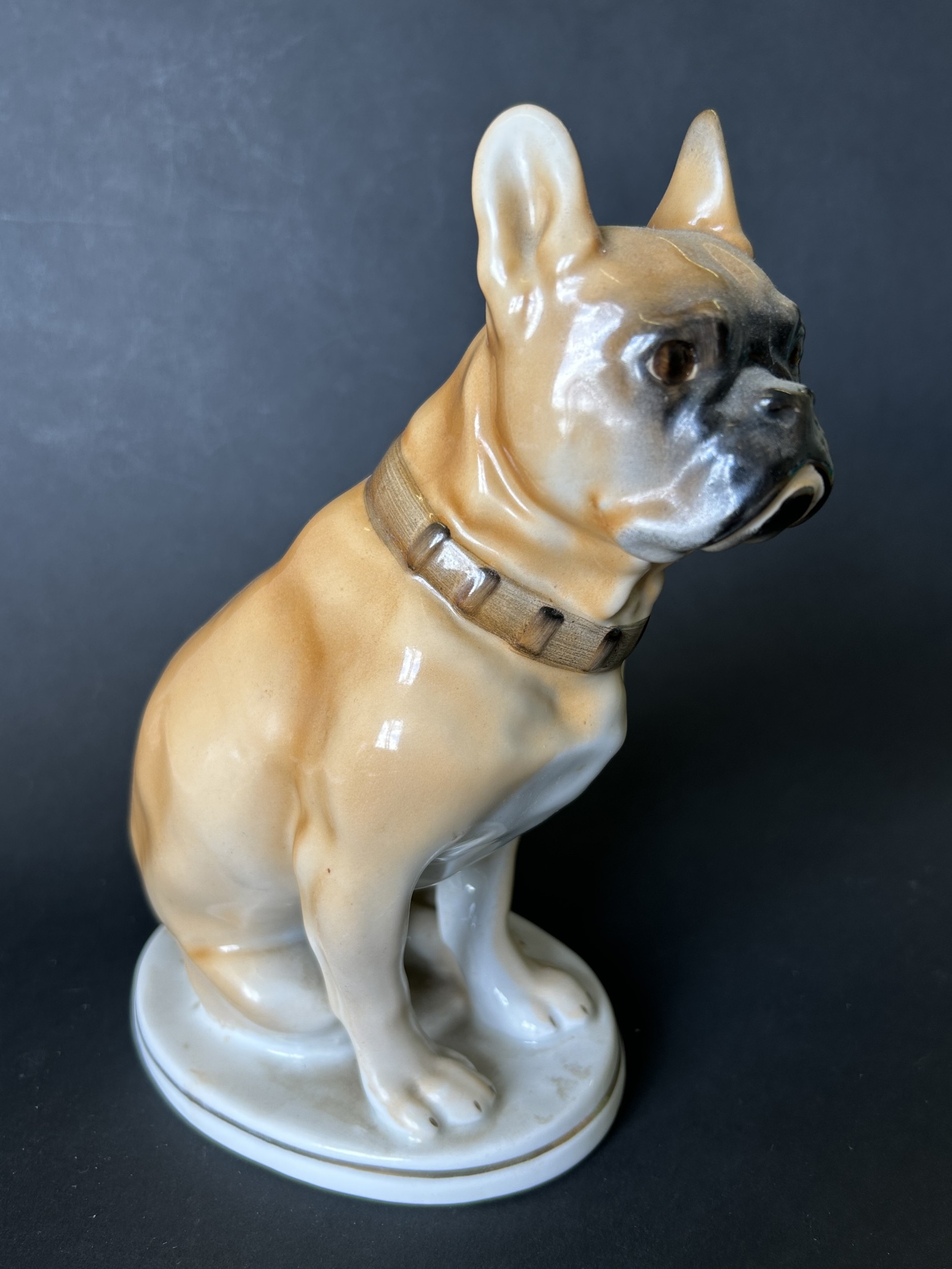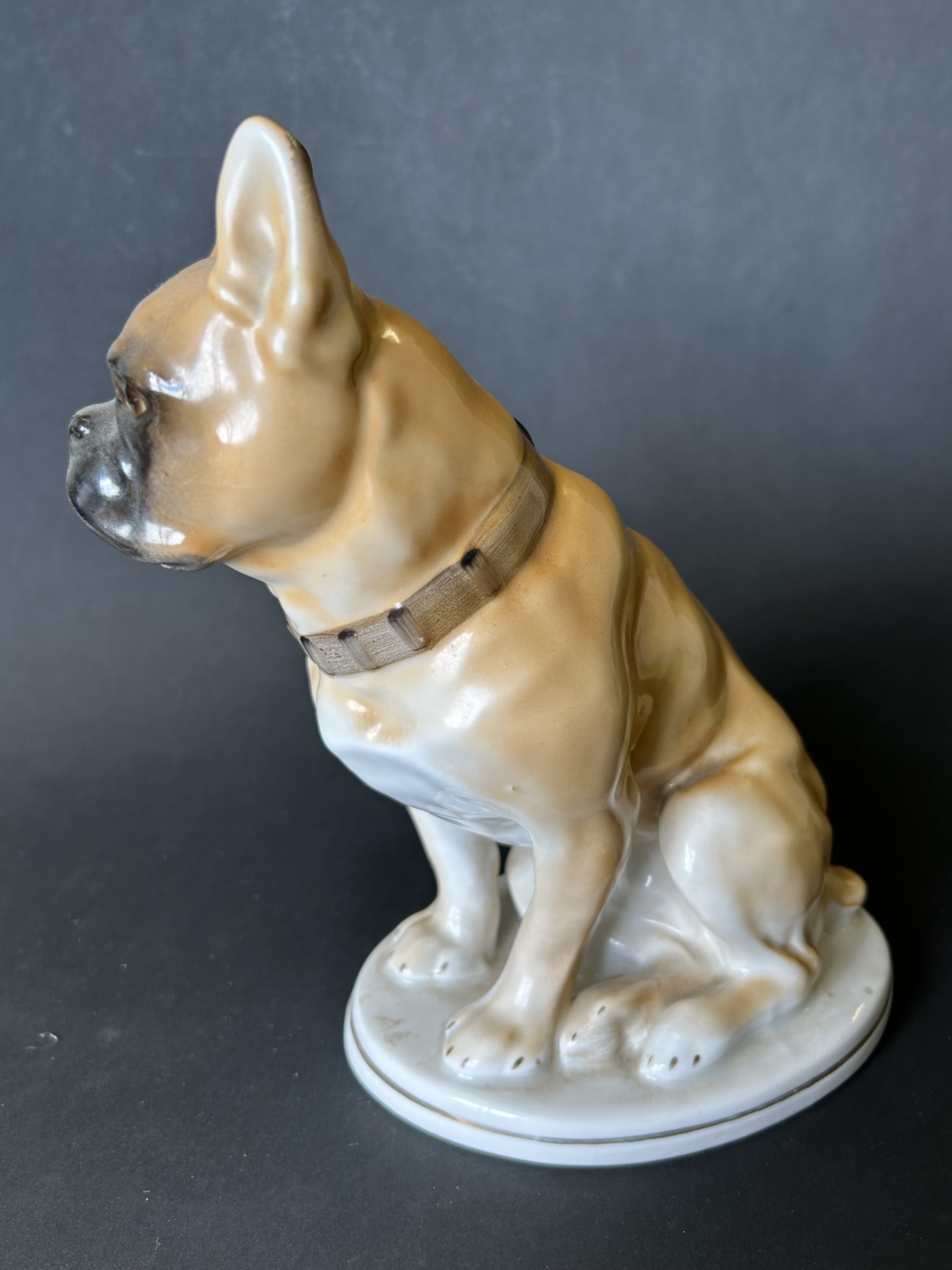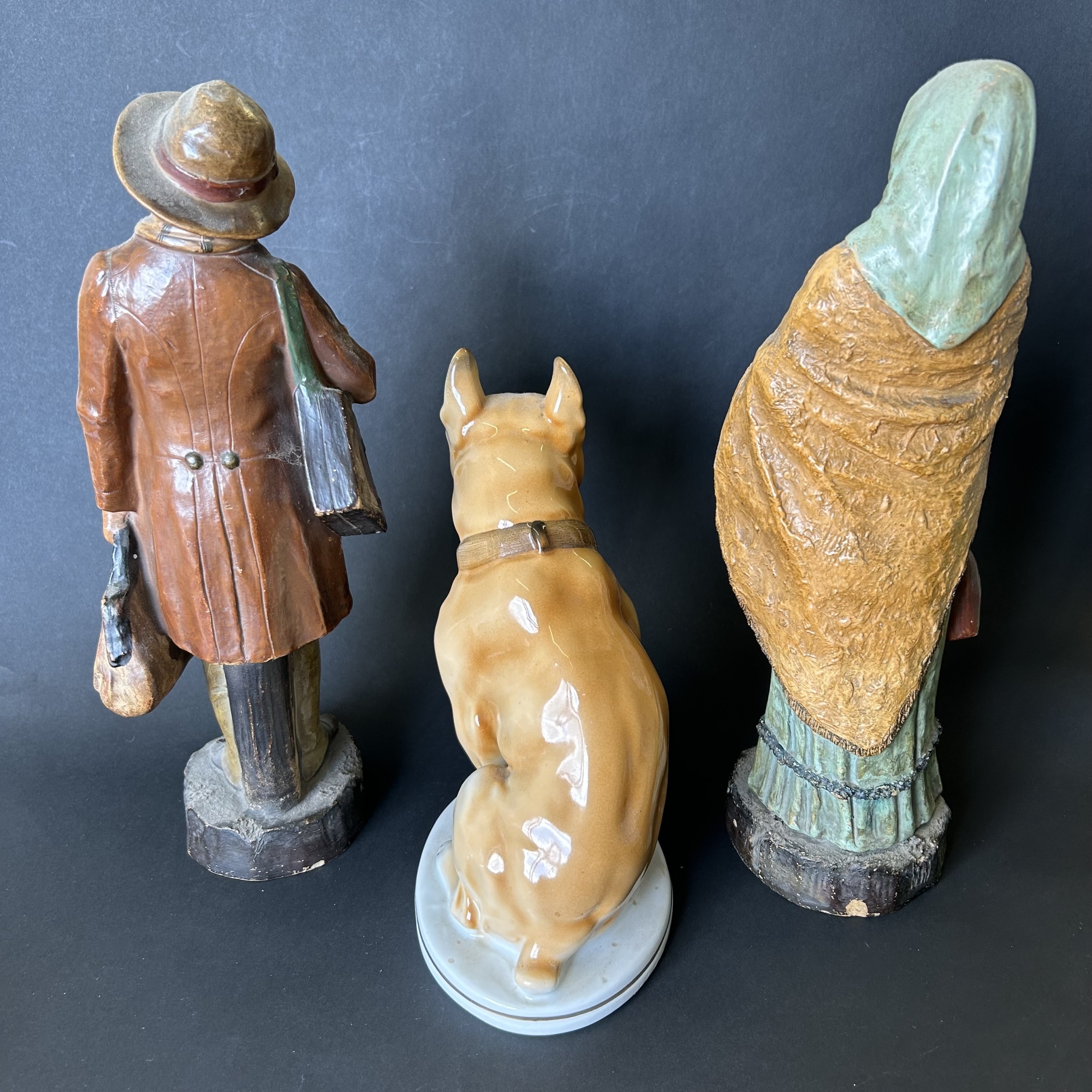 A vintage porcelain 'Lomonosov Factory' (possibly Russian) bulldog figurine, 8 1/4" tall plus a pair of continental figurines, approx. 12 1/4" tall (both with faults)