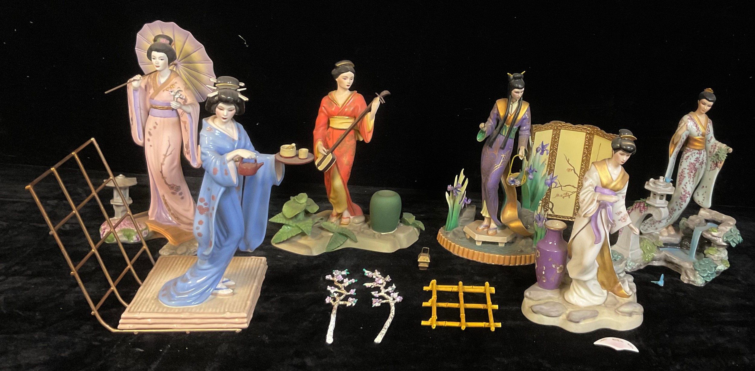 A set of six Franklin Mint Geisha figures, designed by Manabu Saito, including Mariko Princess of the Wisteria Blossom, 30.5cm; Michiko Princess of the Plum Blossoms, 27.5cm; etc (6)