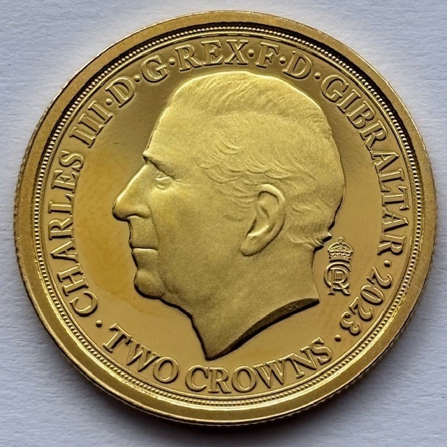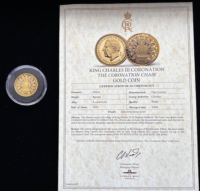 2023 9-carat Gold Proof Two Crown Coin, King Charles III Coronation The Coronation Chair, Selective colour print, Diameter 26mm, Weight 8g, COA
