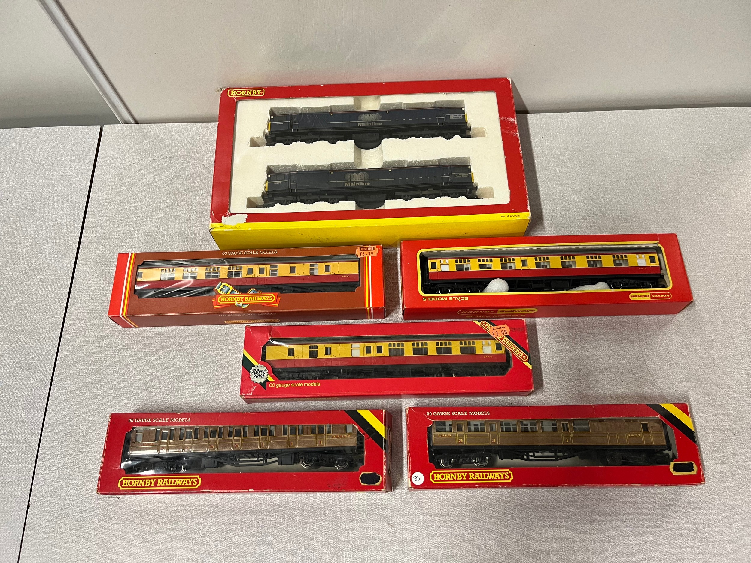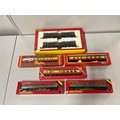 selection of boxed hornby carriages along with mainline engine set