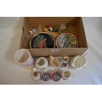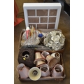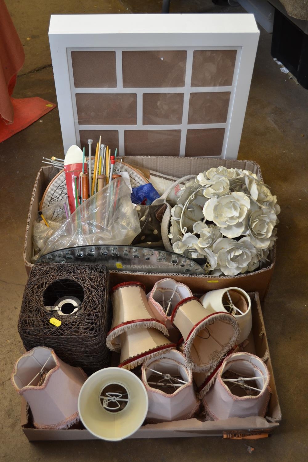 2 BOXES OF SUNDRY ITEMS, LAMPSHADES AND WALL CABINET