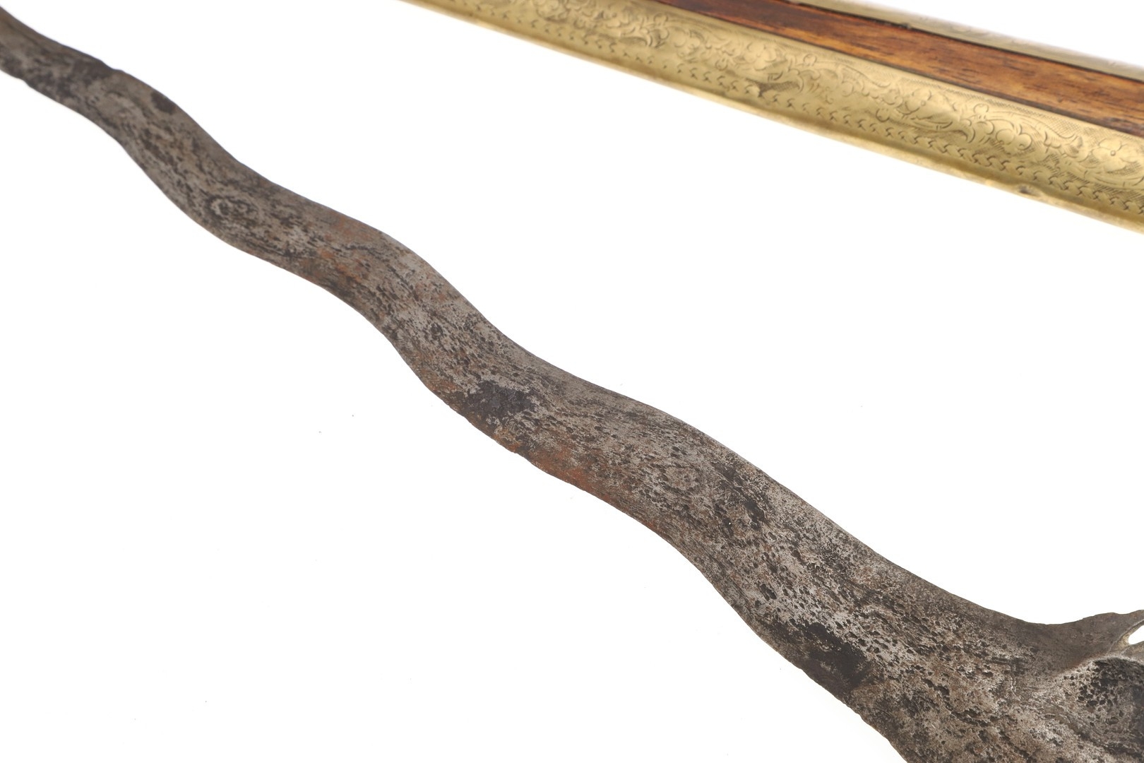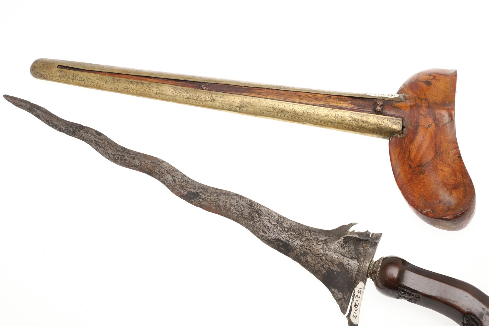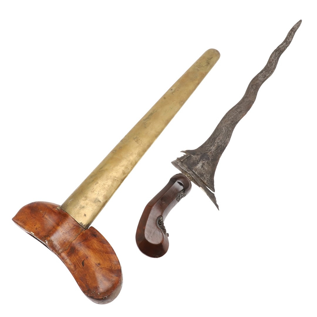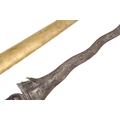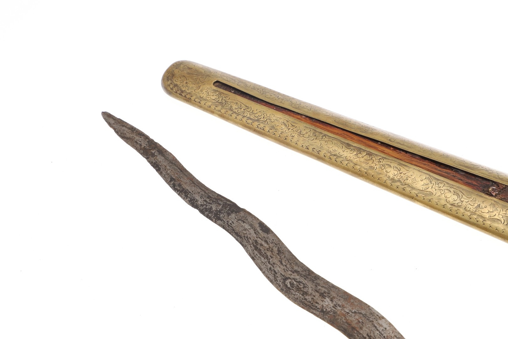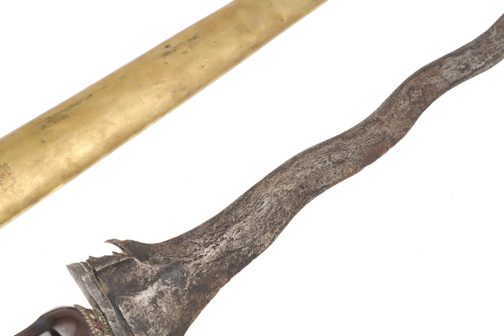 A 19TH CENTURY 'JEWEL' MOUNTED JAVANESE KRIS AND SCABBARD. The 35.5 cm blade with eight curves and pamor in the Kembang Lampes or 'Carpet of Flowers' design. On a Java type hilt, the mount set with rough-cut white and red stones. The scabbard with chased brass pendok with a central split mounted with three further white stones. The cross piece of rounded Balinese or Madura type. 48 cm.