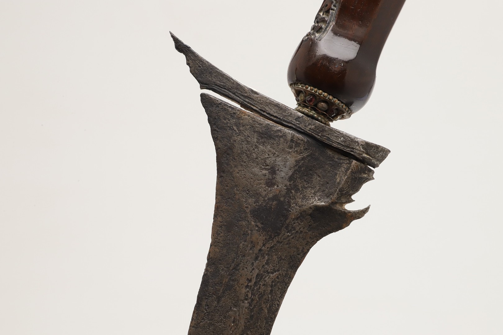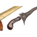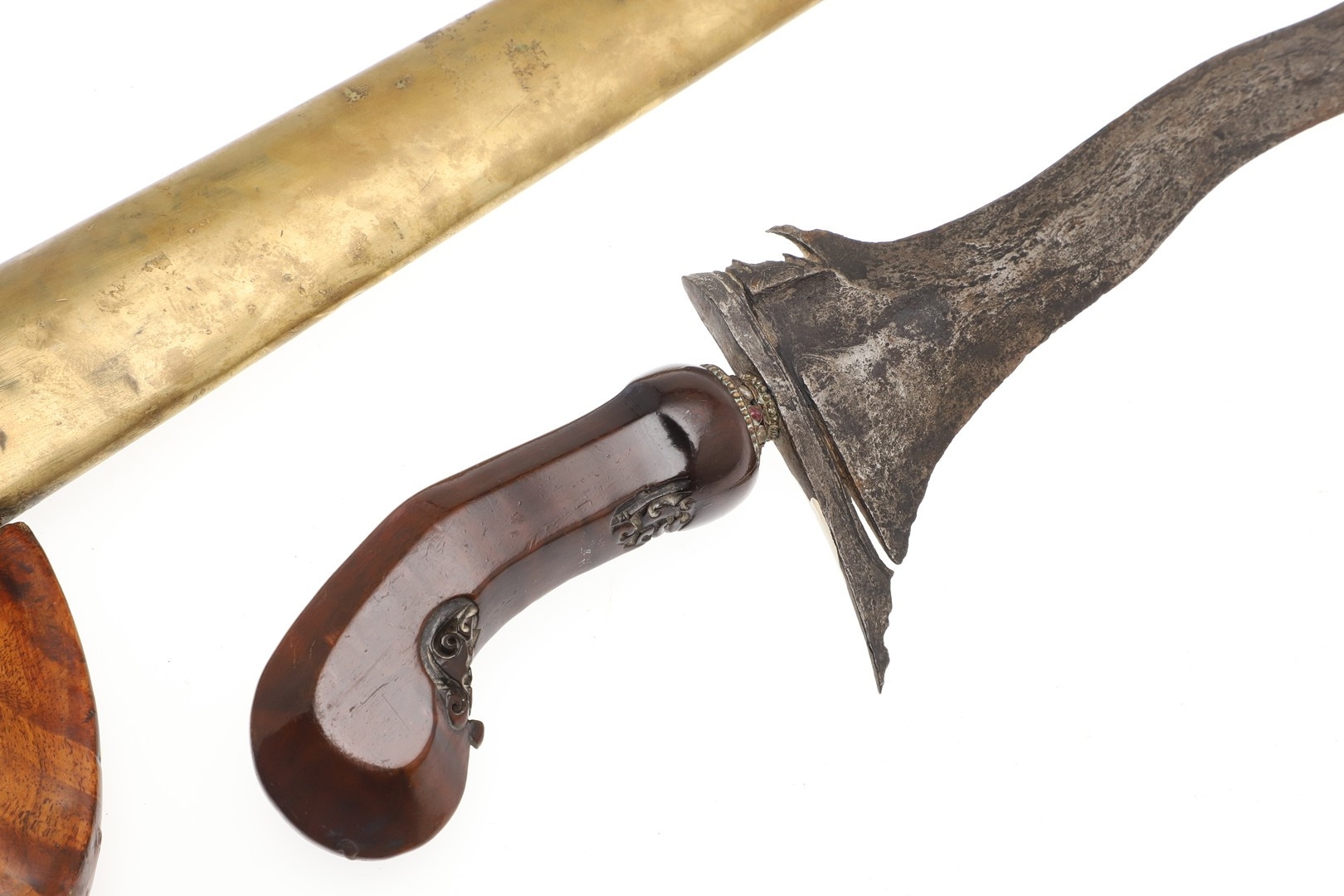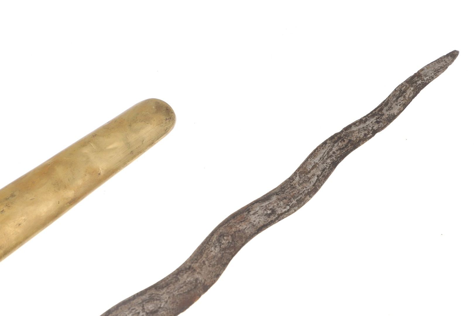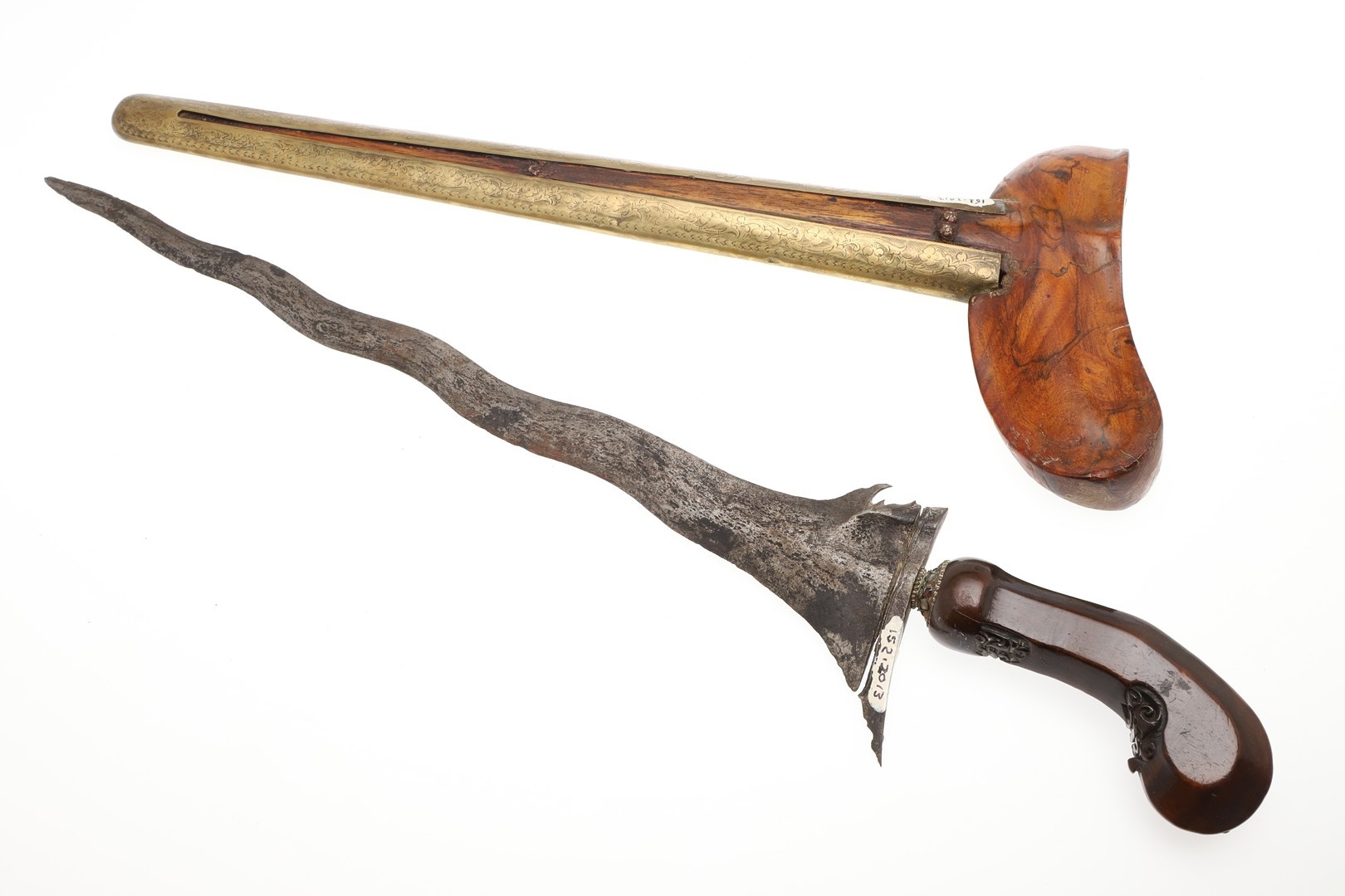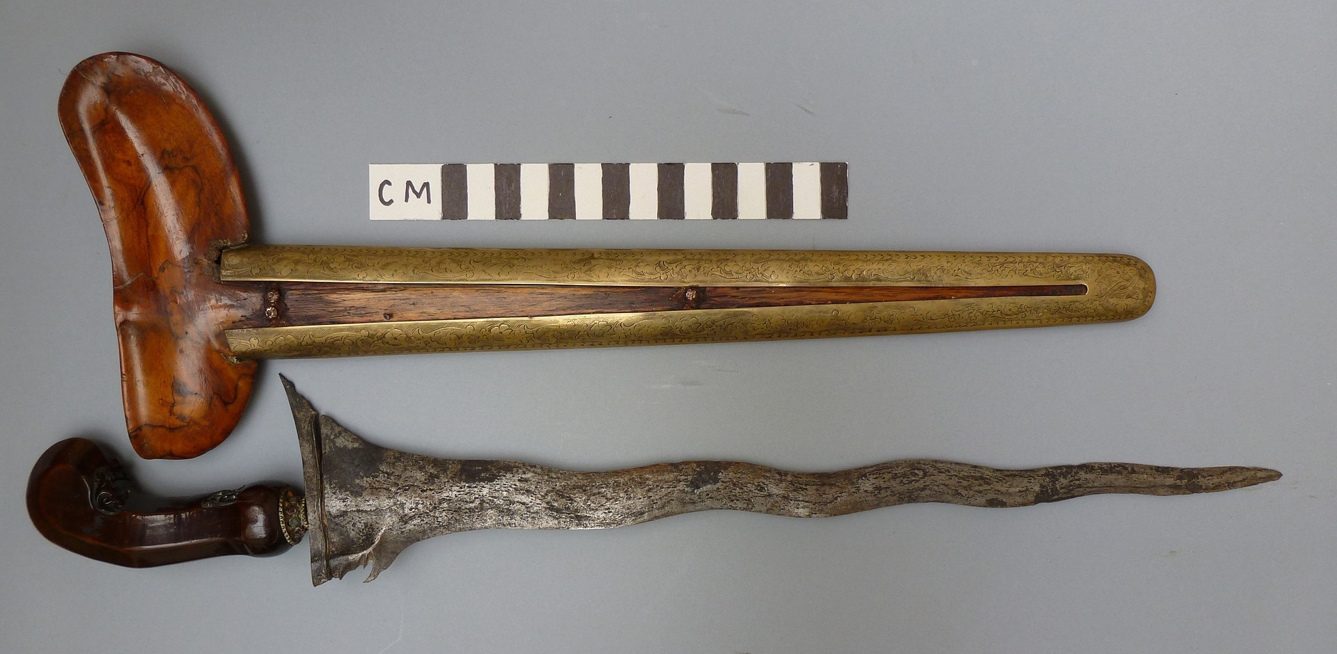 A 19TH CENTURY 'JEWEL' MOUNTED JAVANESE KRIS AND SCABBARD. The 35.5 cm blade with eight curves and pamor in the Kembang Lampes or 'Carpet of Flowers' design. On a Java type hilt, the mount set with rough-cut white and red stones. The scabbard with chased brass pendok with a central split mounted with three further white stones. The cross piece of rounded Balinese or Madura type. 48 cm.