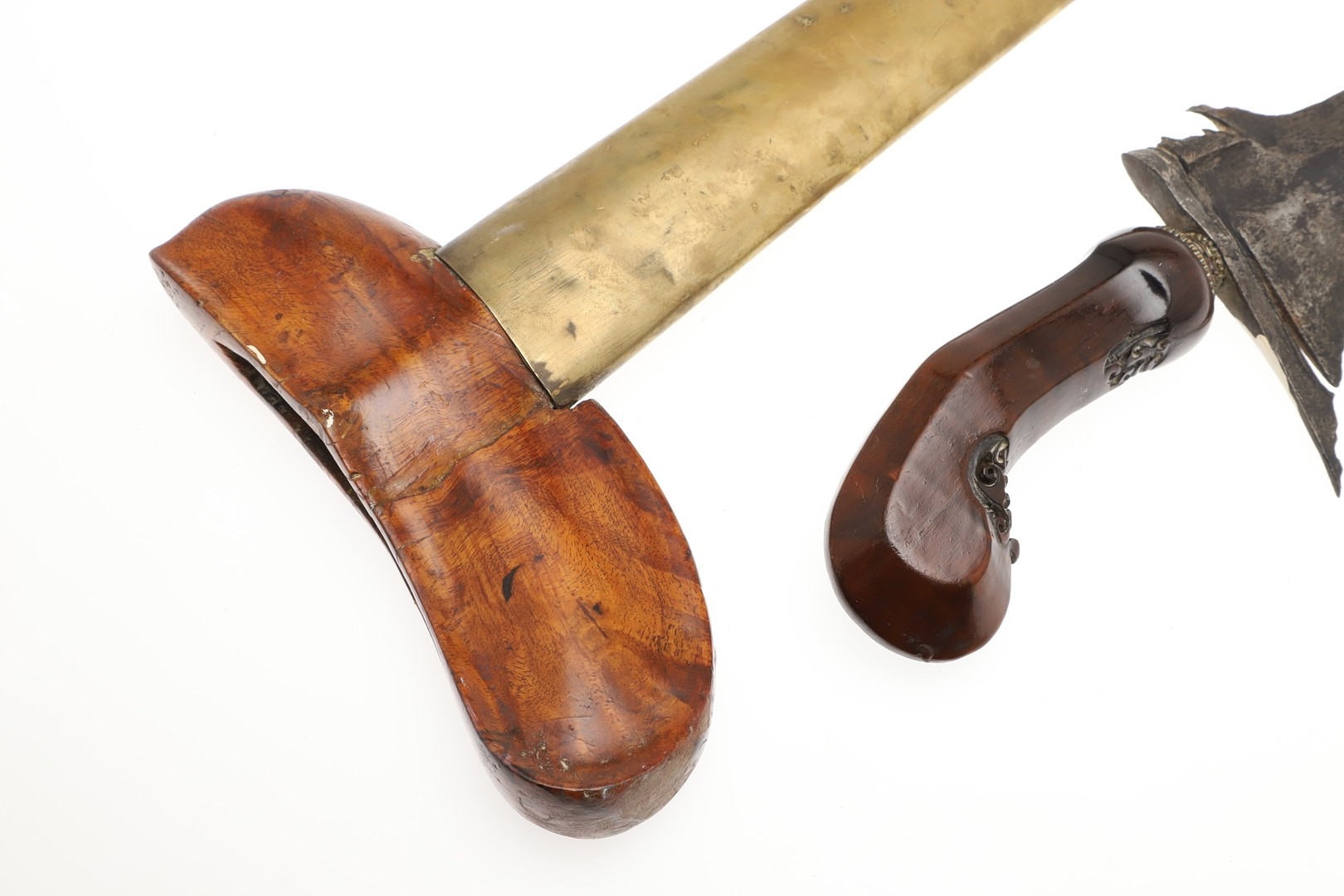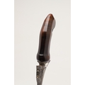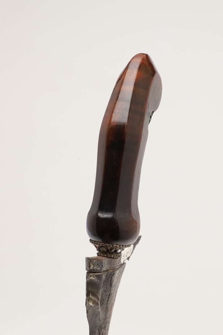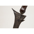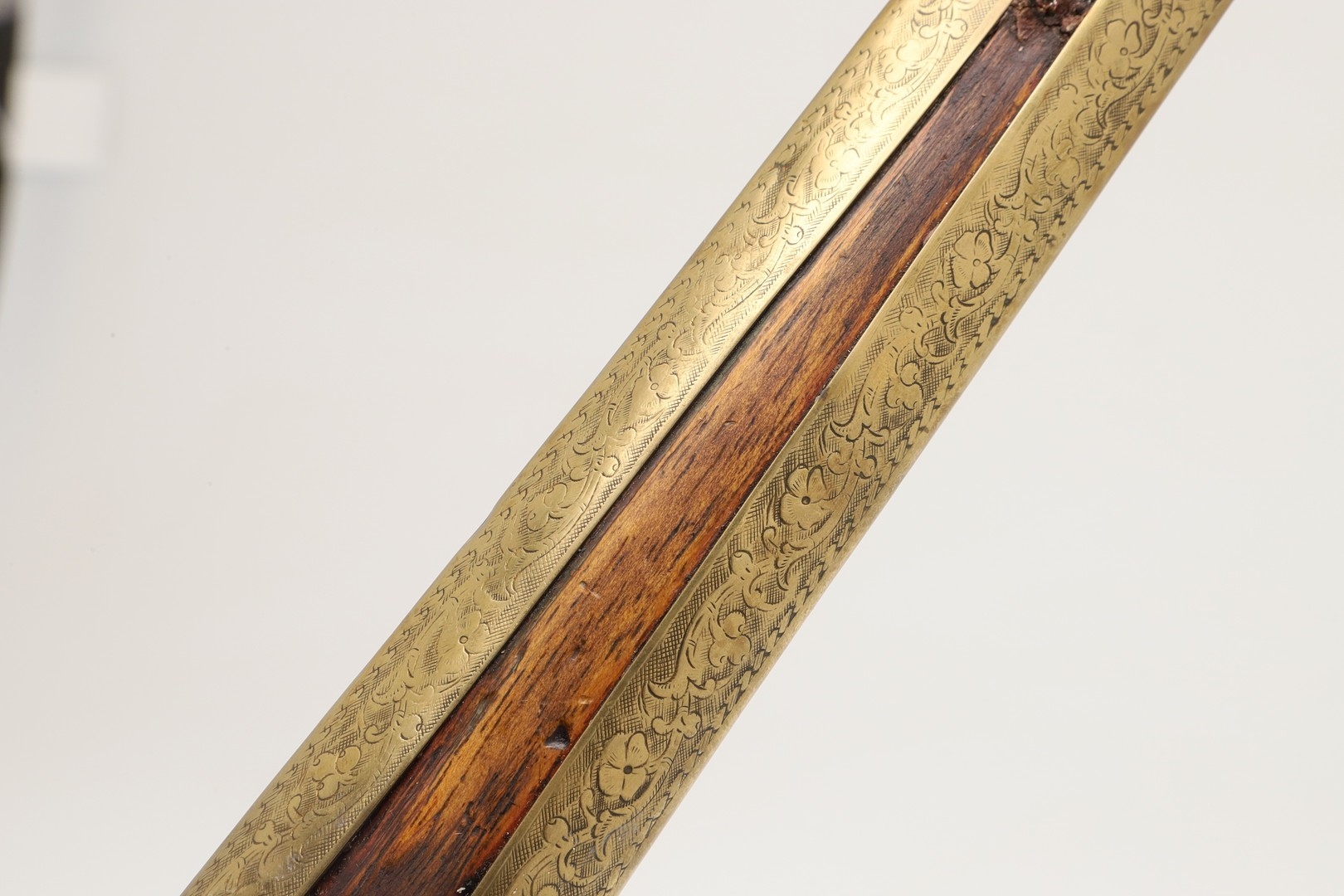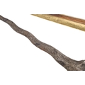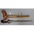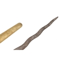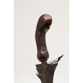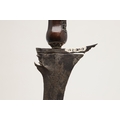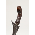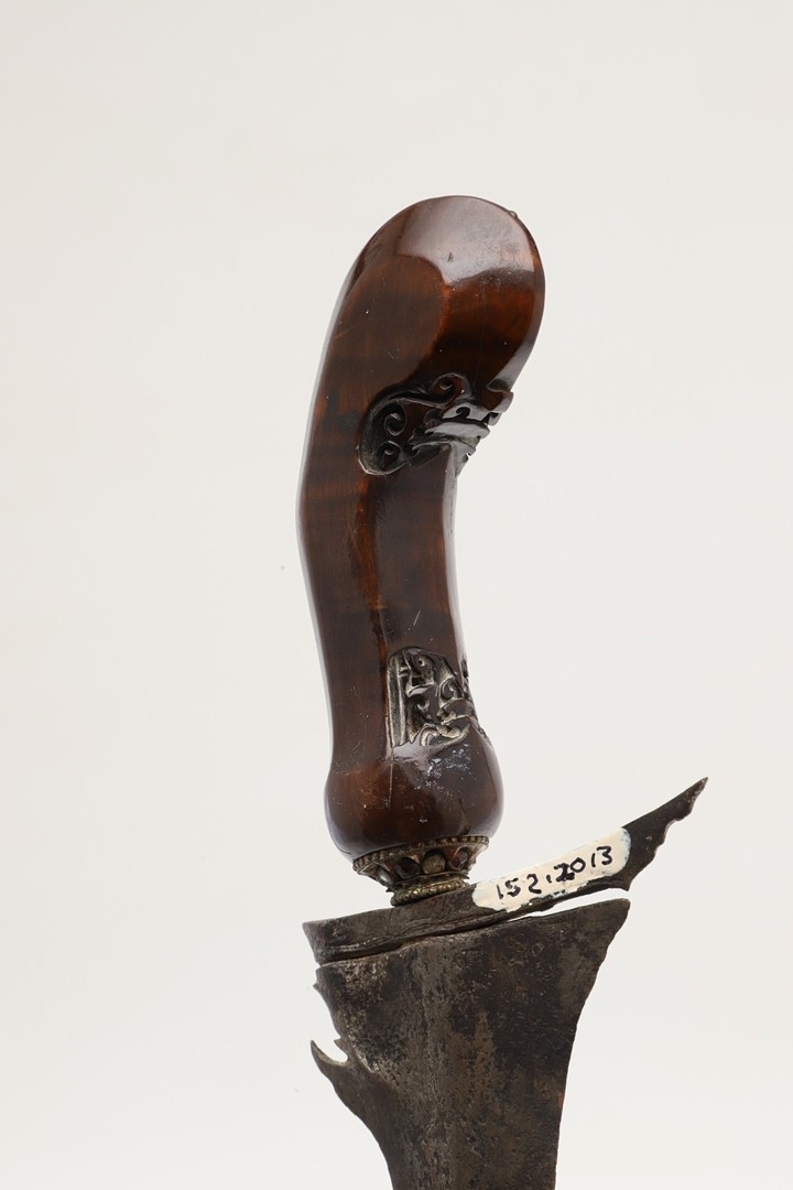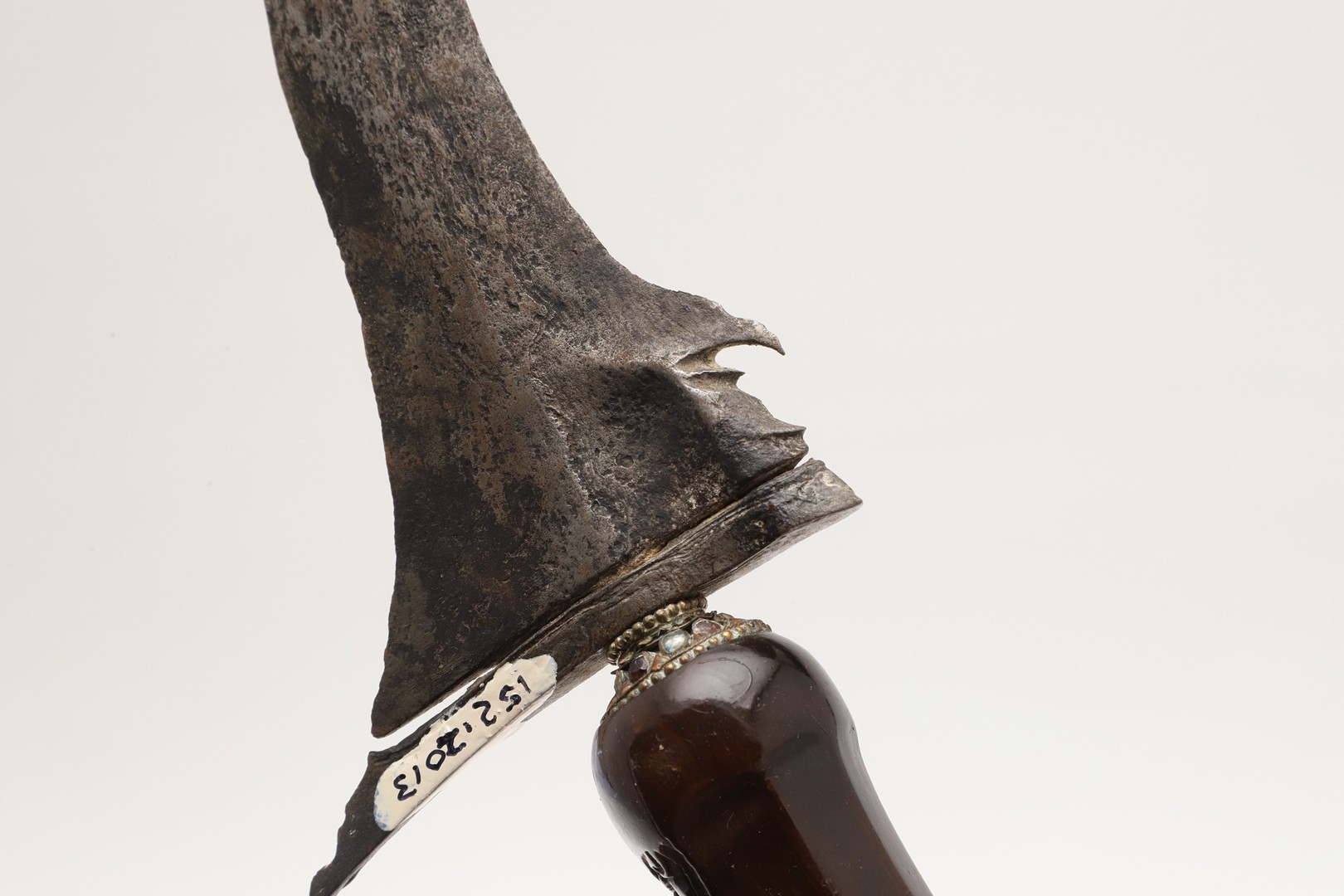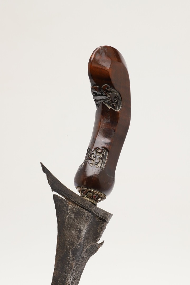 A 19TH CENTURY 'JEWEL' MOUNTED JAVANESE KRIS AND SCABBARD. The 35.5 cm blade with eight curves and pamor in the Kembang Lampes or 'Carpet of Flowers' design. On a Java type hilt, the mount set with rough-cut white and red stones. The scabbard with chased brass pendok with a central split mounted with three further white stones. The cross piece of rounded Balinese or Madura type. 48 cm.