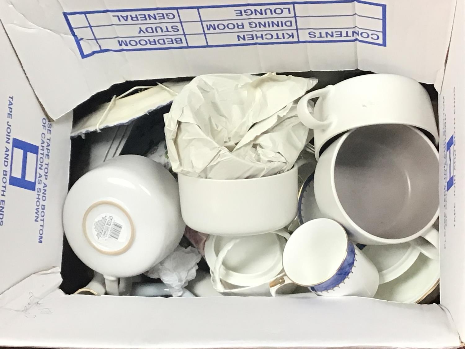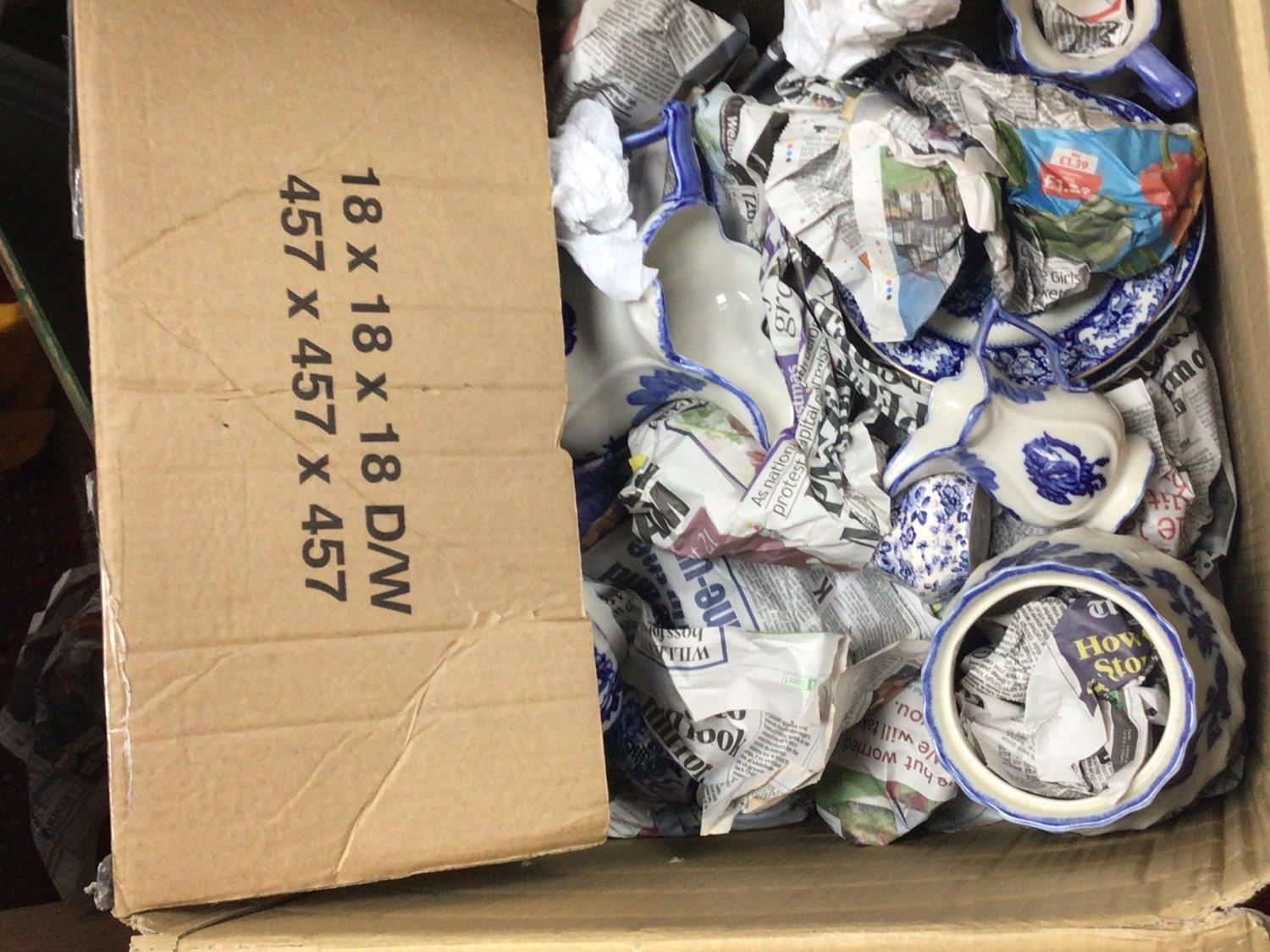 Two boxes containing decorative blue and white ceramics and other ceramics including a Lladro style figure. NO RESERVE