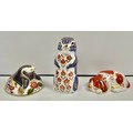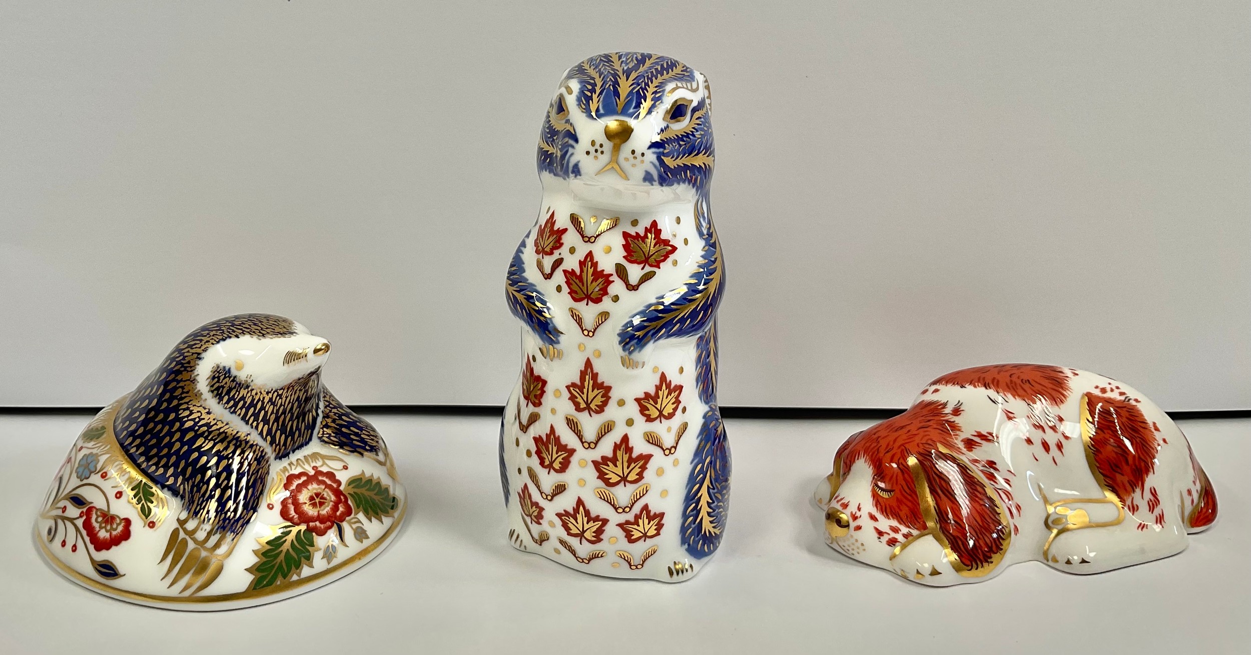 A Royal Crown Derby paperweight, Mole, gold stopper, 8.5cm long, printed mark in red; others, Chipmunk, gold stopper, printed mark,10.5cm; Puppy, Collectors Guild exclusive, gold stopper, 9cm long, printed mark (3)