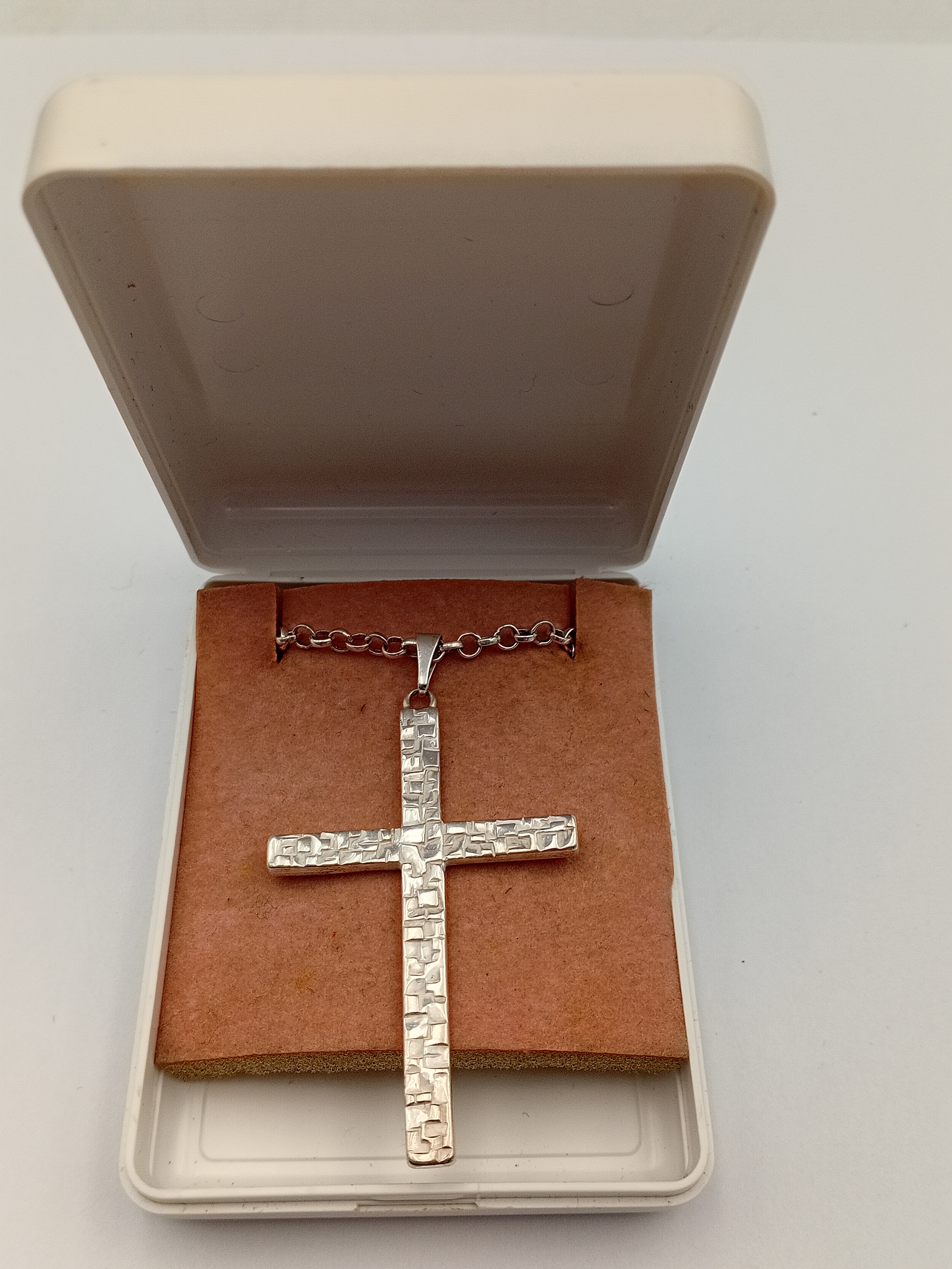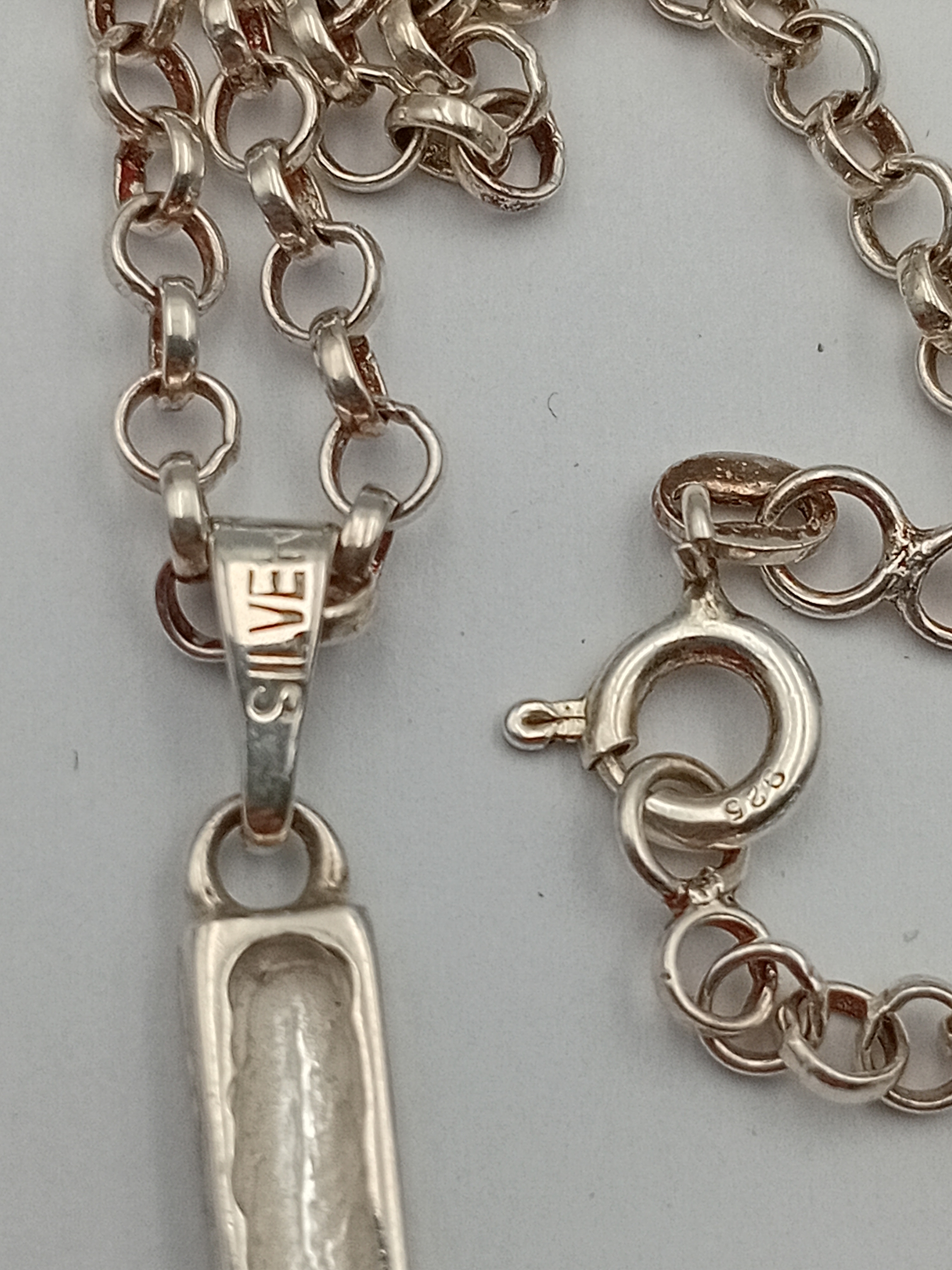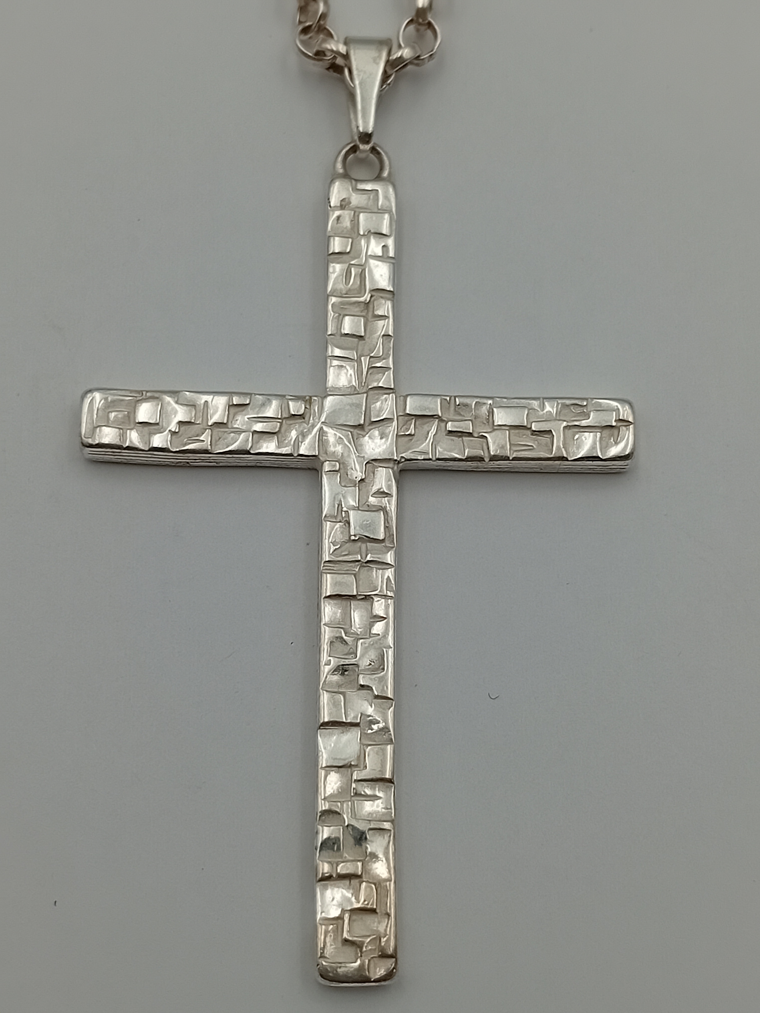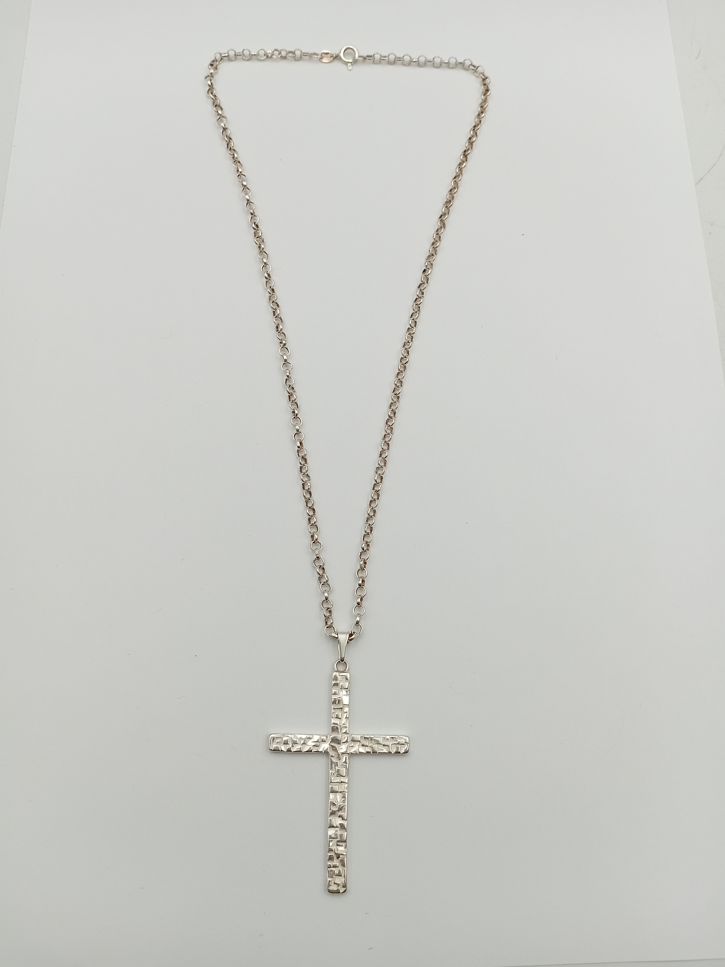 A stamped silver cross pendant on a stamped 925 silver belcher chain necklace. Length 18.5"