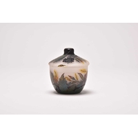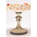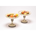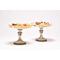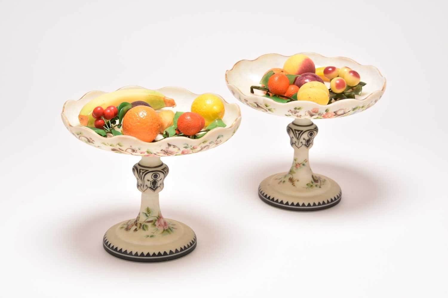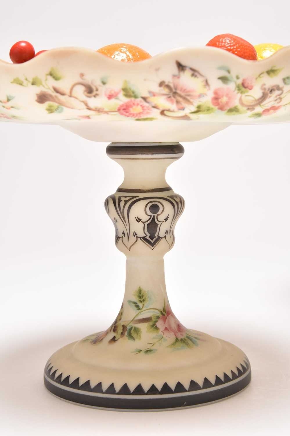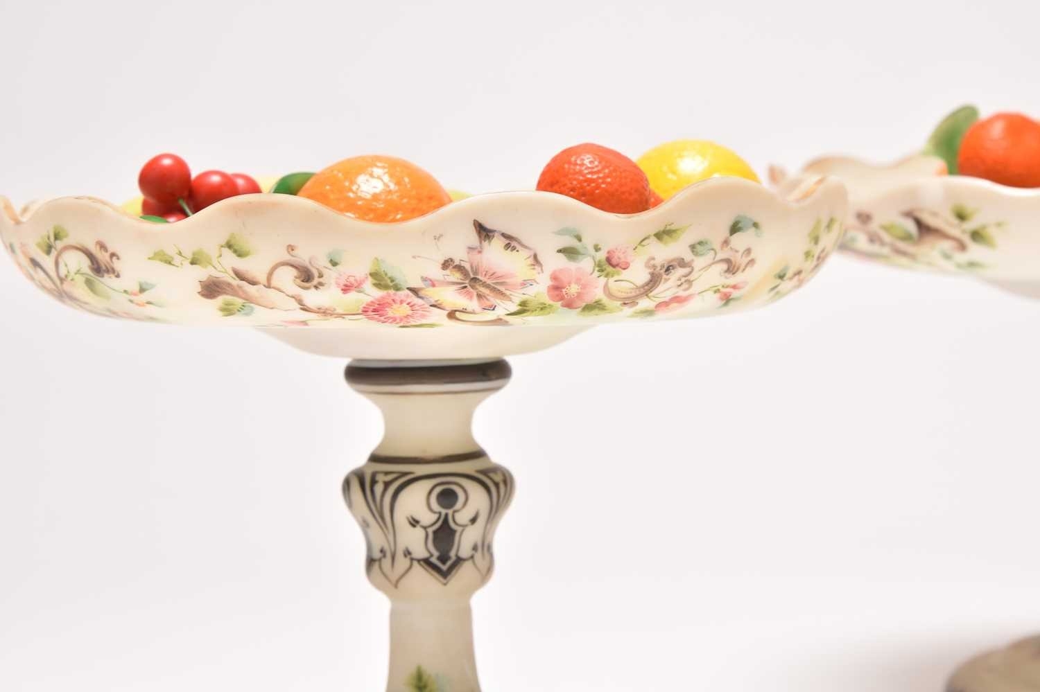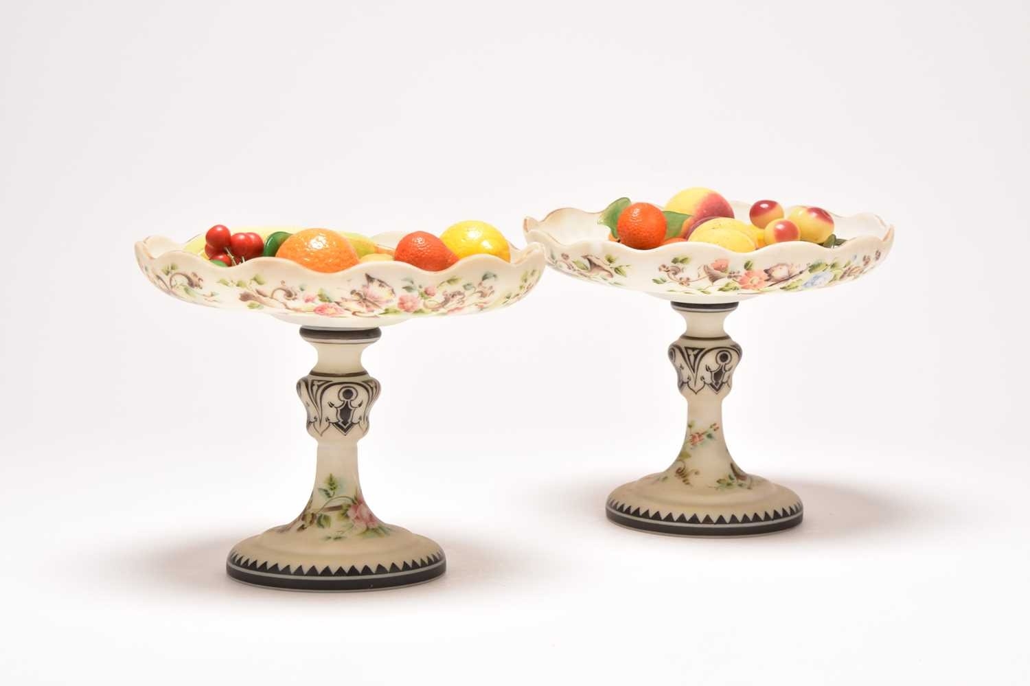 A pair of French opalescent glass tazzas with enamelled decoration of roses and birds, 19th century, milk white grounds, the bowls of lobed circular form raised on pedestal stems with circular feet, 18.5cm high. Sold together with faux models of display fruit Ex. Sotheby's label 15th March 1994. Condition:Chip to rim of one tazza