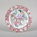 A CHINESE PORCELAIN FAMILLE ROSE 'LADY AND CHILDREN' PLATEin Yongzheng taste but likely later, decorated with a lady seated at a table and two children to the foreground, 22cm diameter