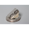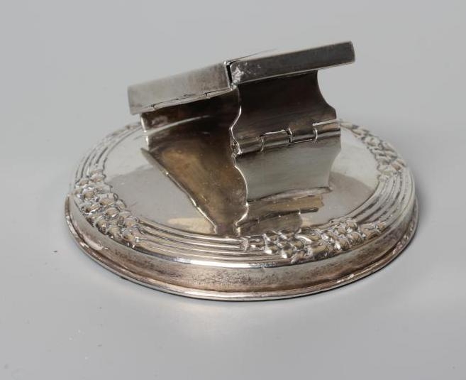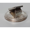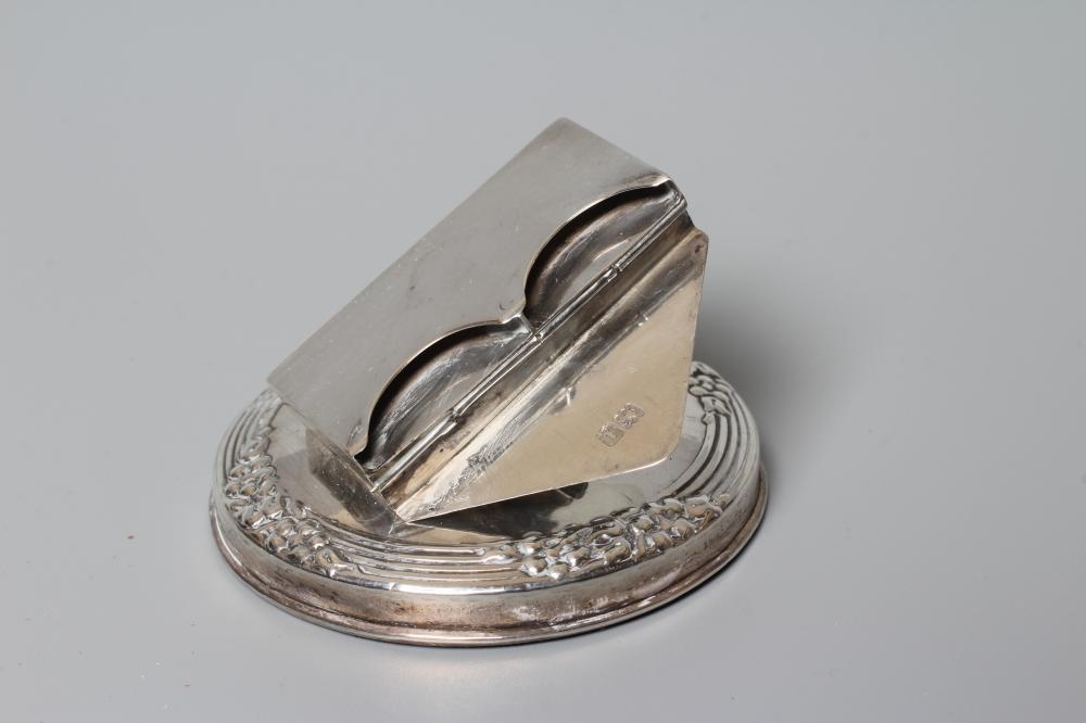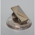 OF PHILATELIC INTEREST - AN EDWARDIAN NOVELTY DESK CLIP/PAPERWEIGHT, maker's mark rubbed, London 1904, the hinged envelope holder on a domed base with reeded tied rim, 2 1/2" diameter, loaded (Illustrated)