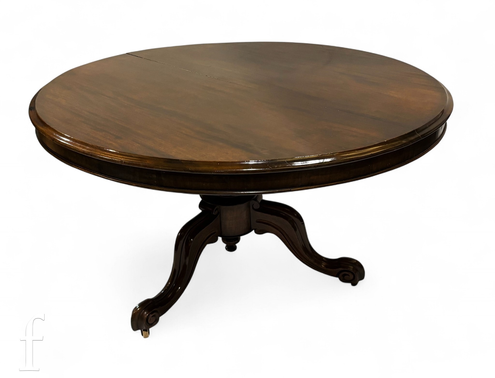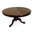 A 19th Century tilt top walnut breakfast or supper table, raised to a turned support over reeded scroll legs, height 72cm and diameter 121cm, slight damage.