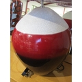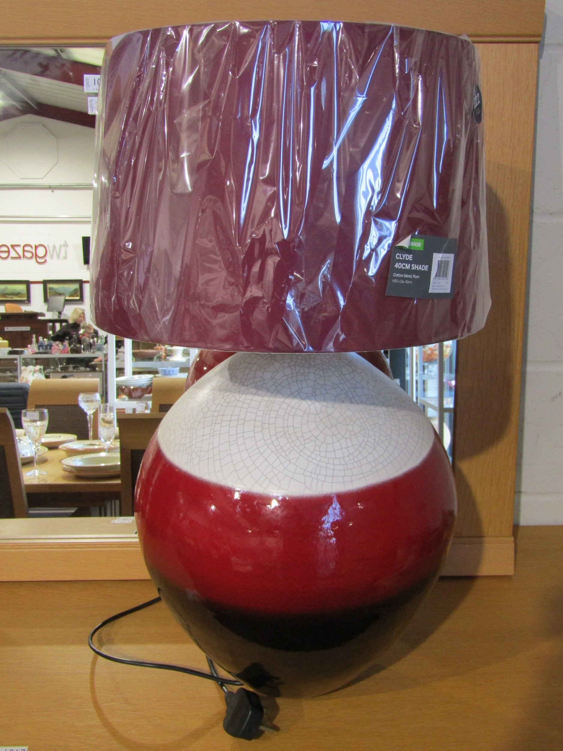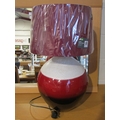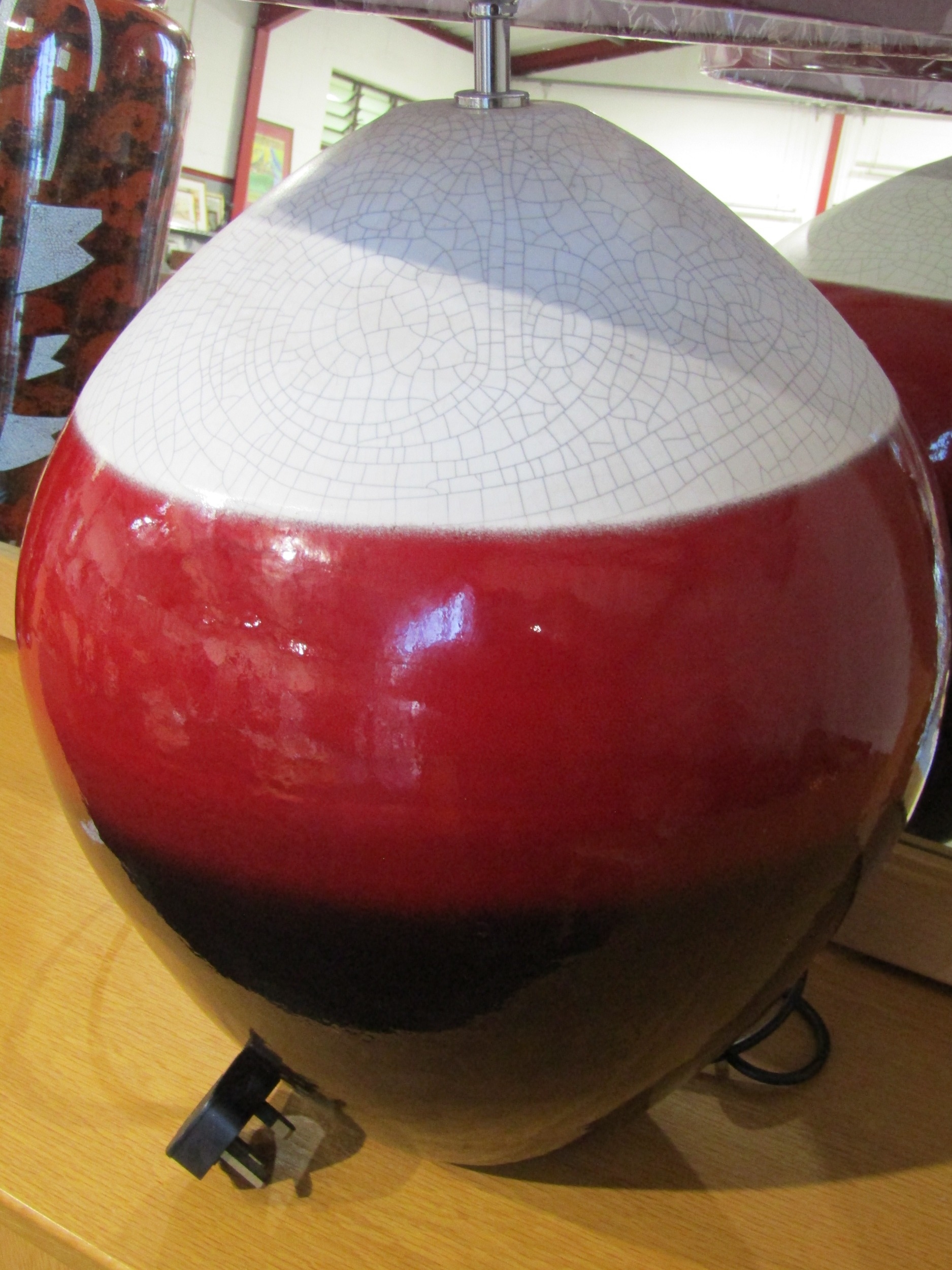 An oversized spherical table lamp with cream crackle glazed band, red and brown lower bands with shade