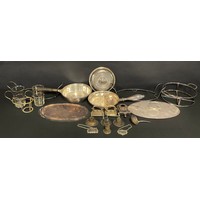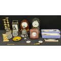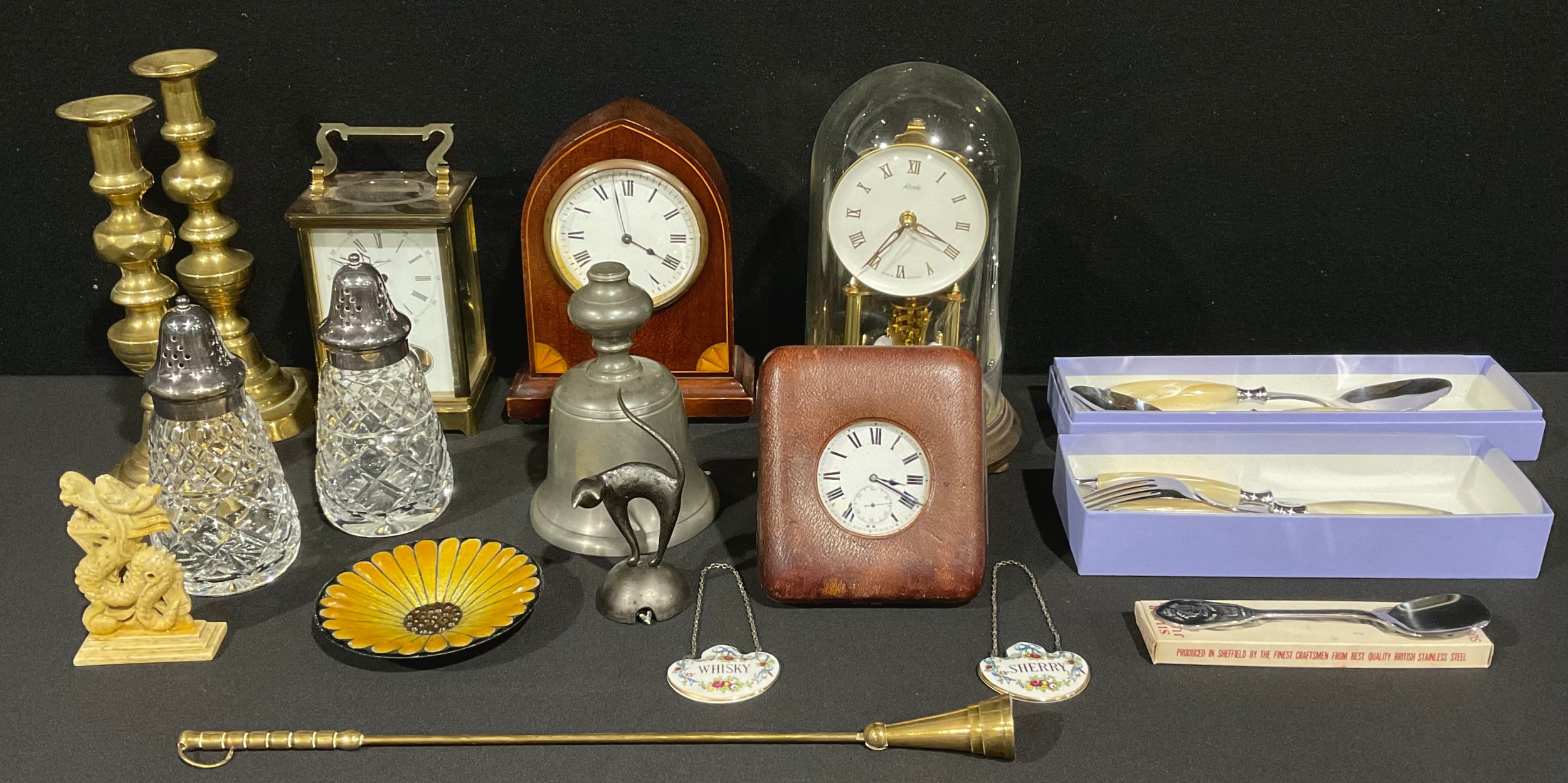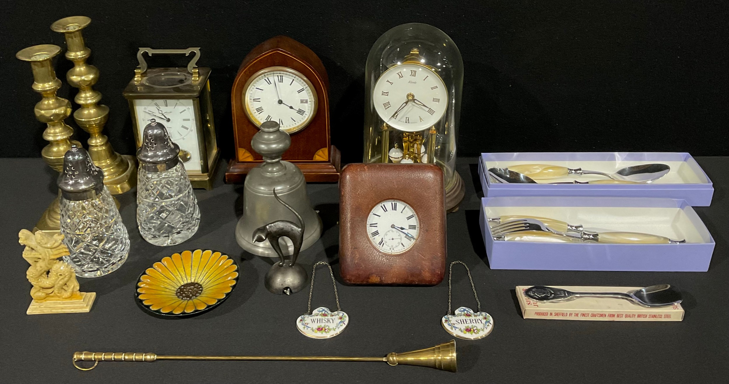 Boxes and Objects - an Edwardian mahogany lancet vshaped mantel clock; an early 20th century travelling Goliath timepiece; Bugatti Italian knives, forks and spoons; a Limoges dish; a carriage clock; etc