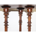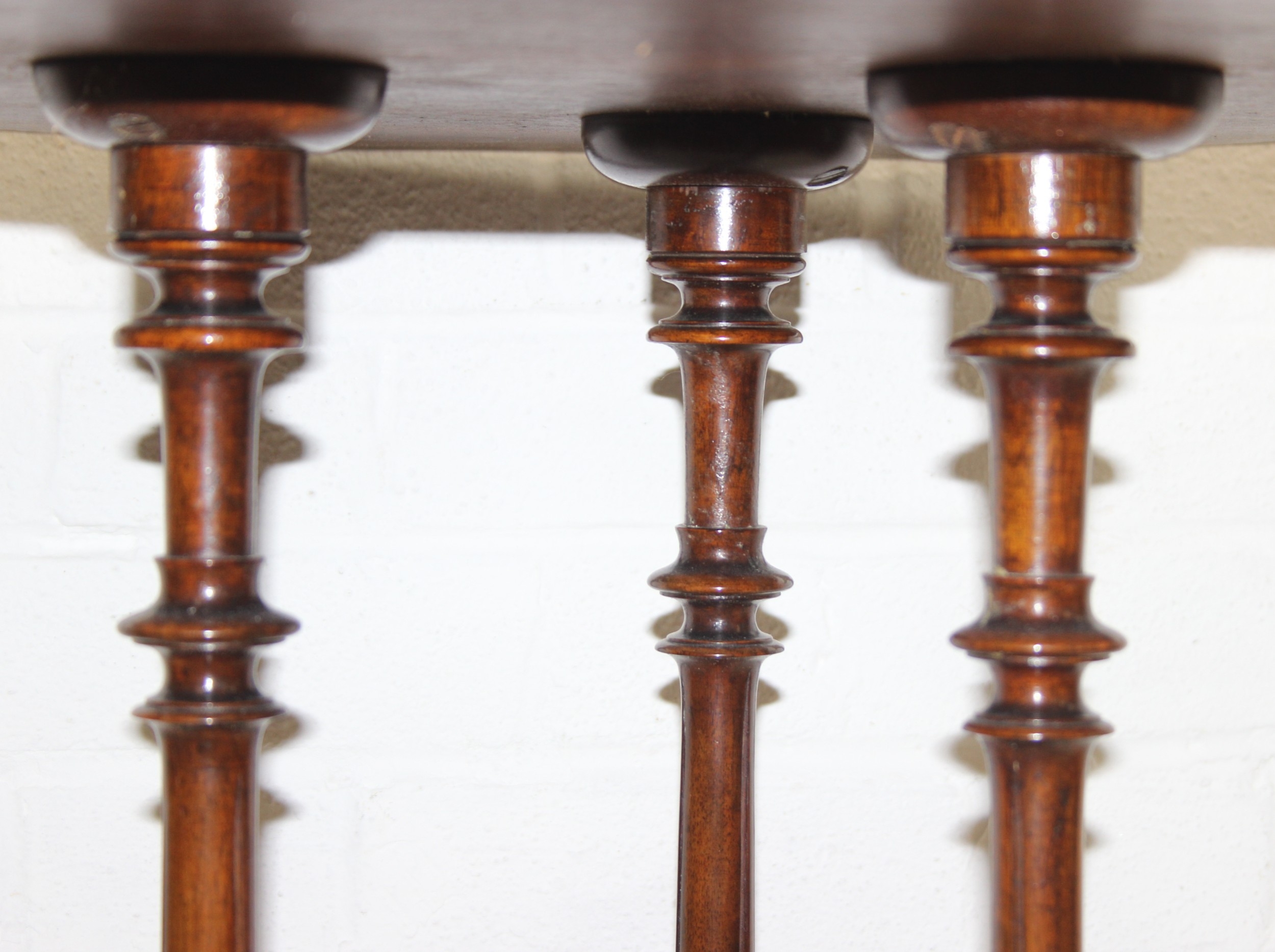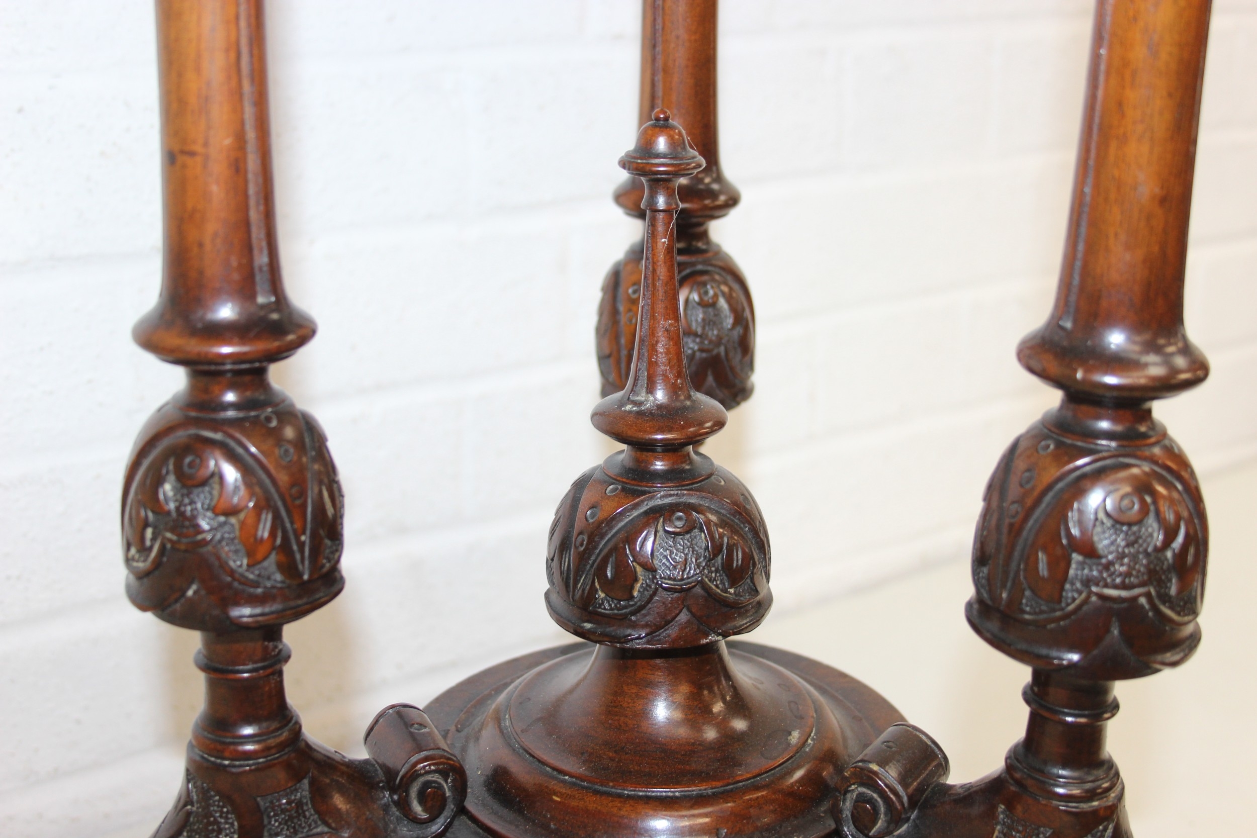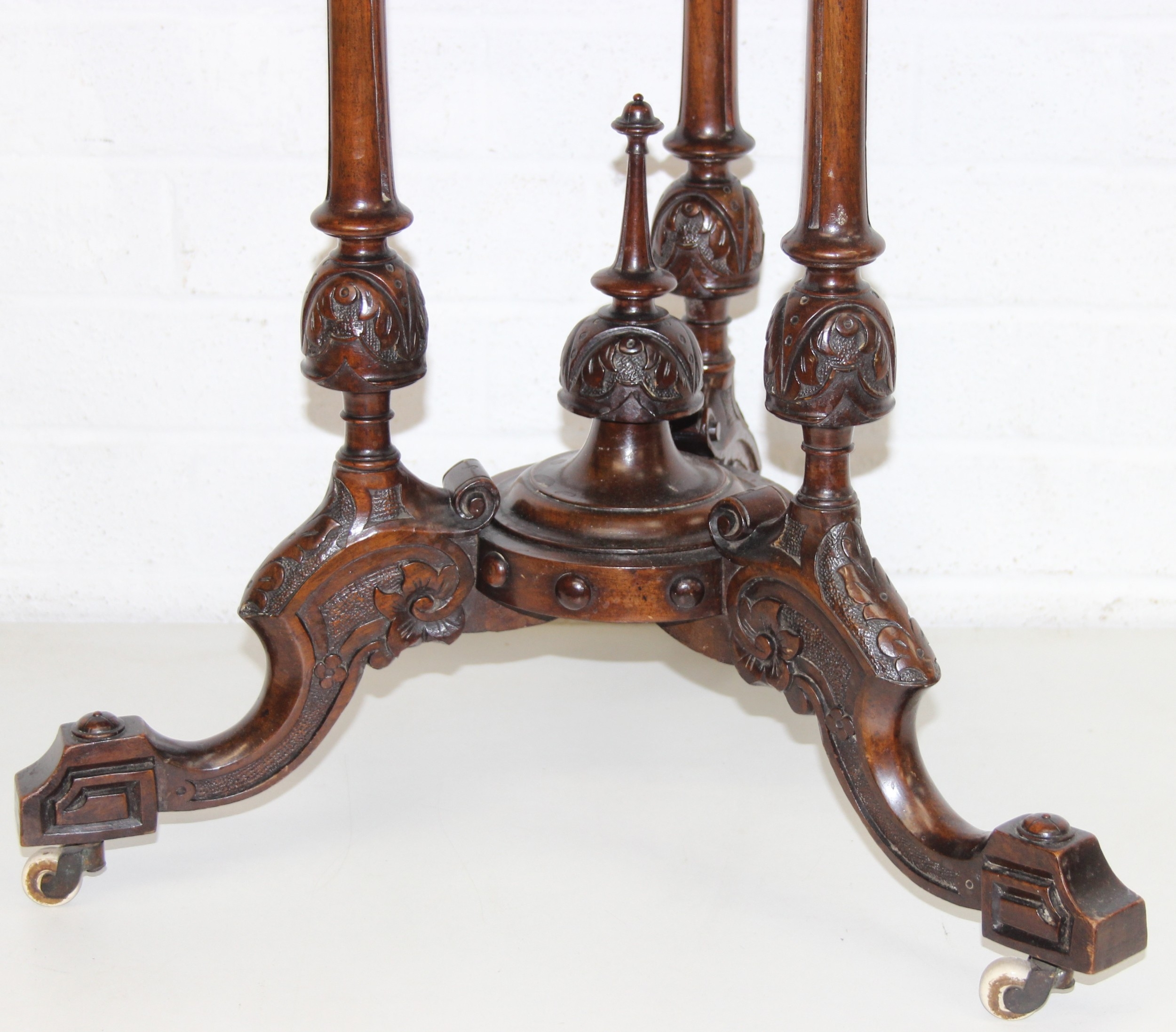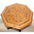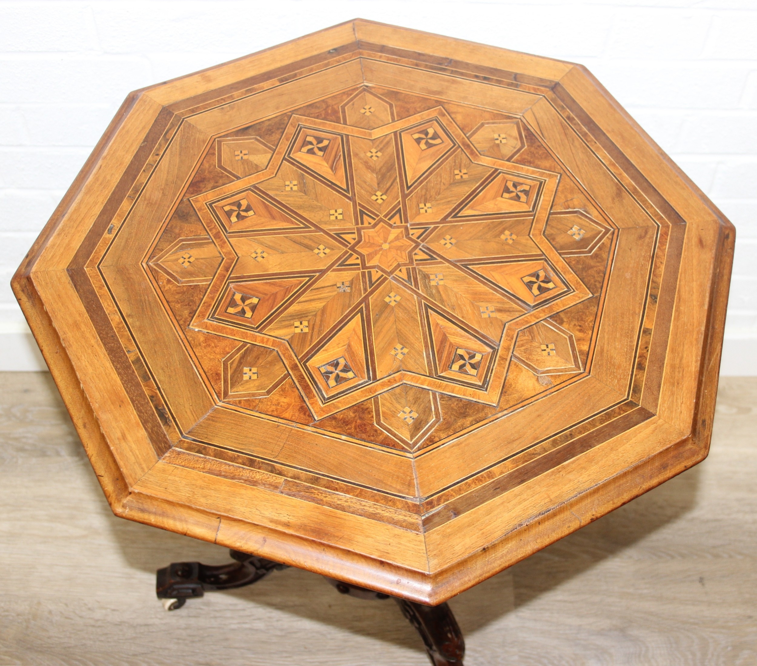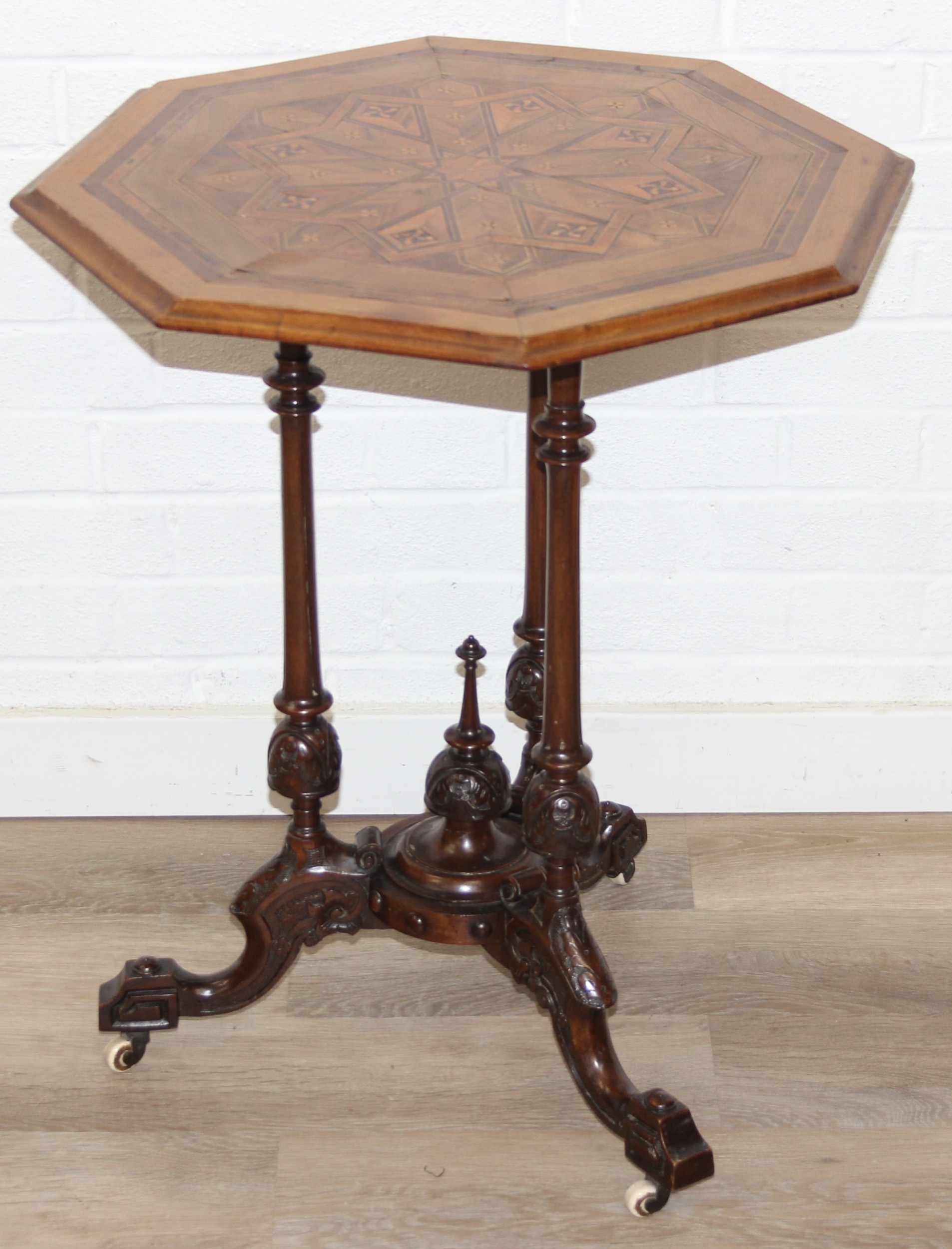 An antique specimen wood parquetry inlaid octagonal topped table with intricately carved triple pillar base, splayed legs and brass and ceramic castors, 19th century, possibly Italian Sorrento, 71cm H x 55cm diam