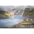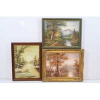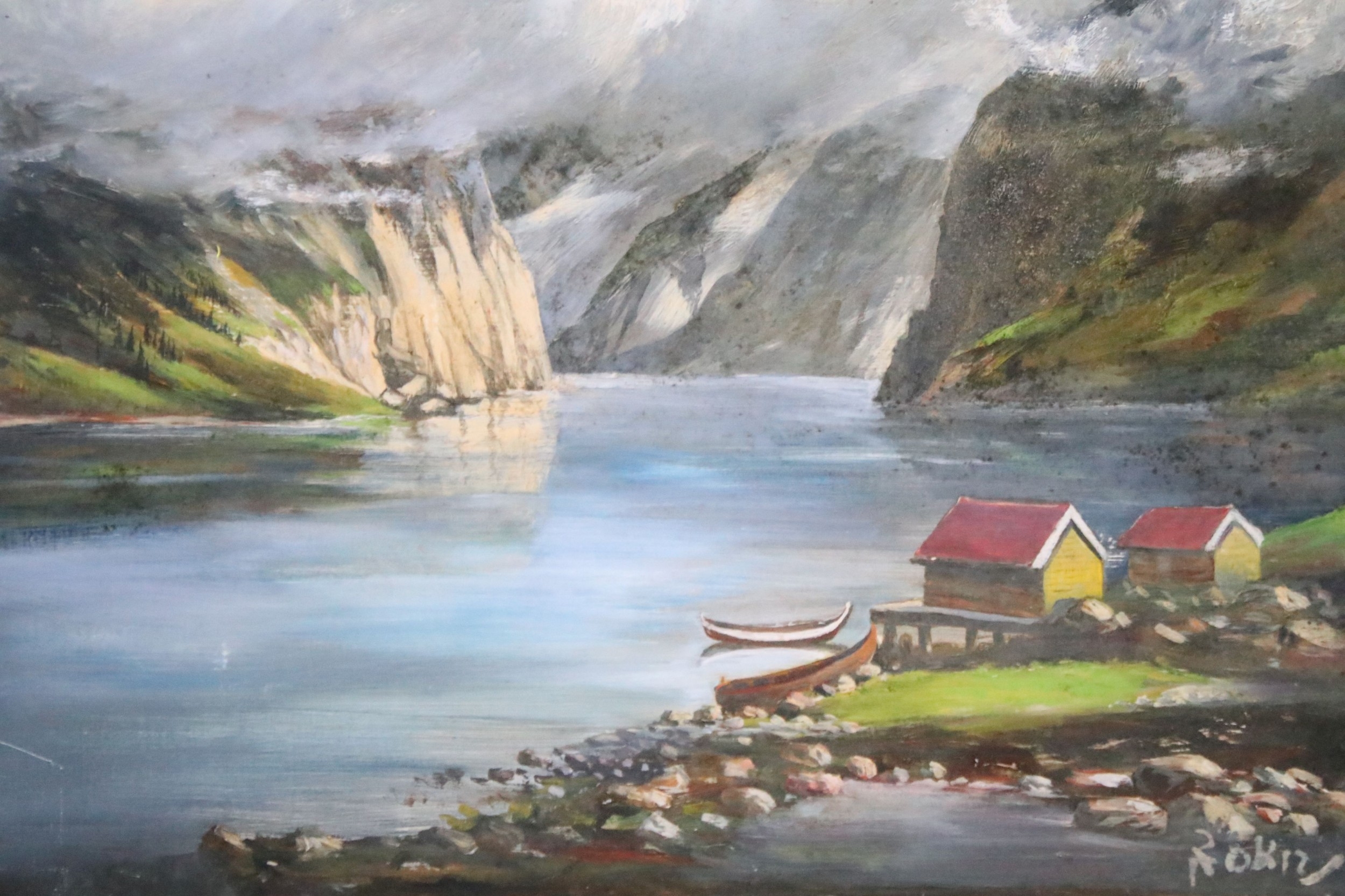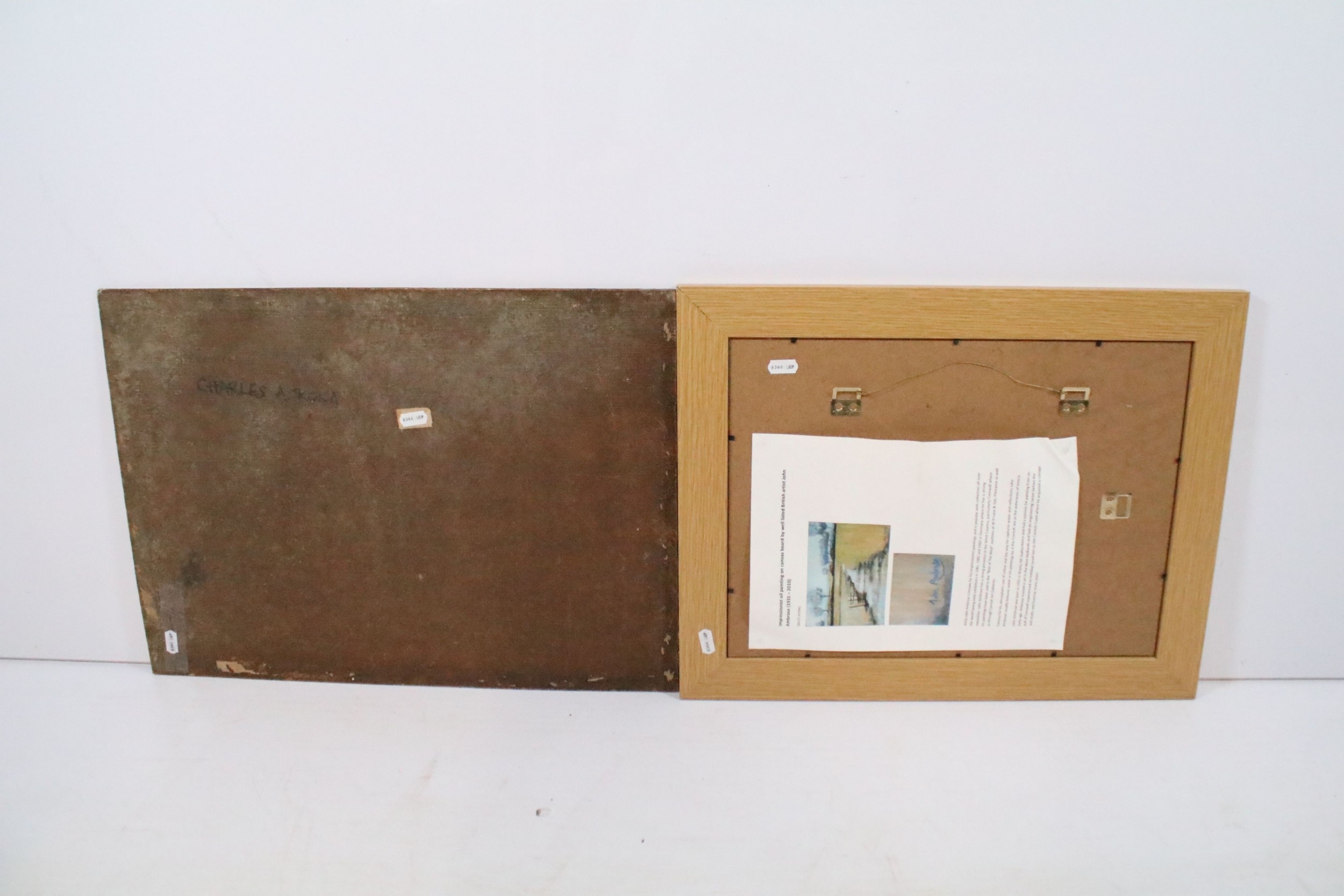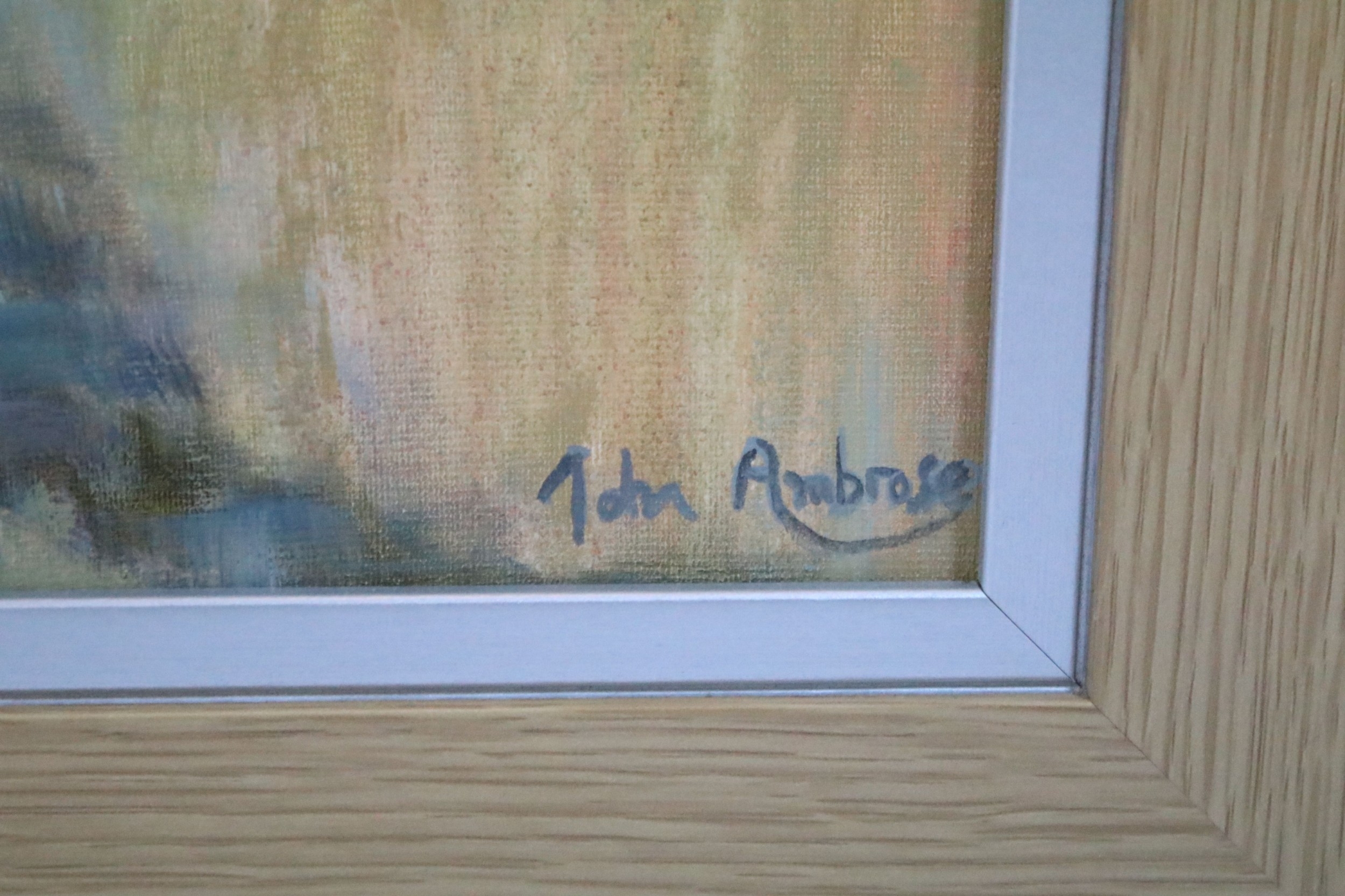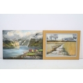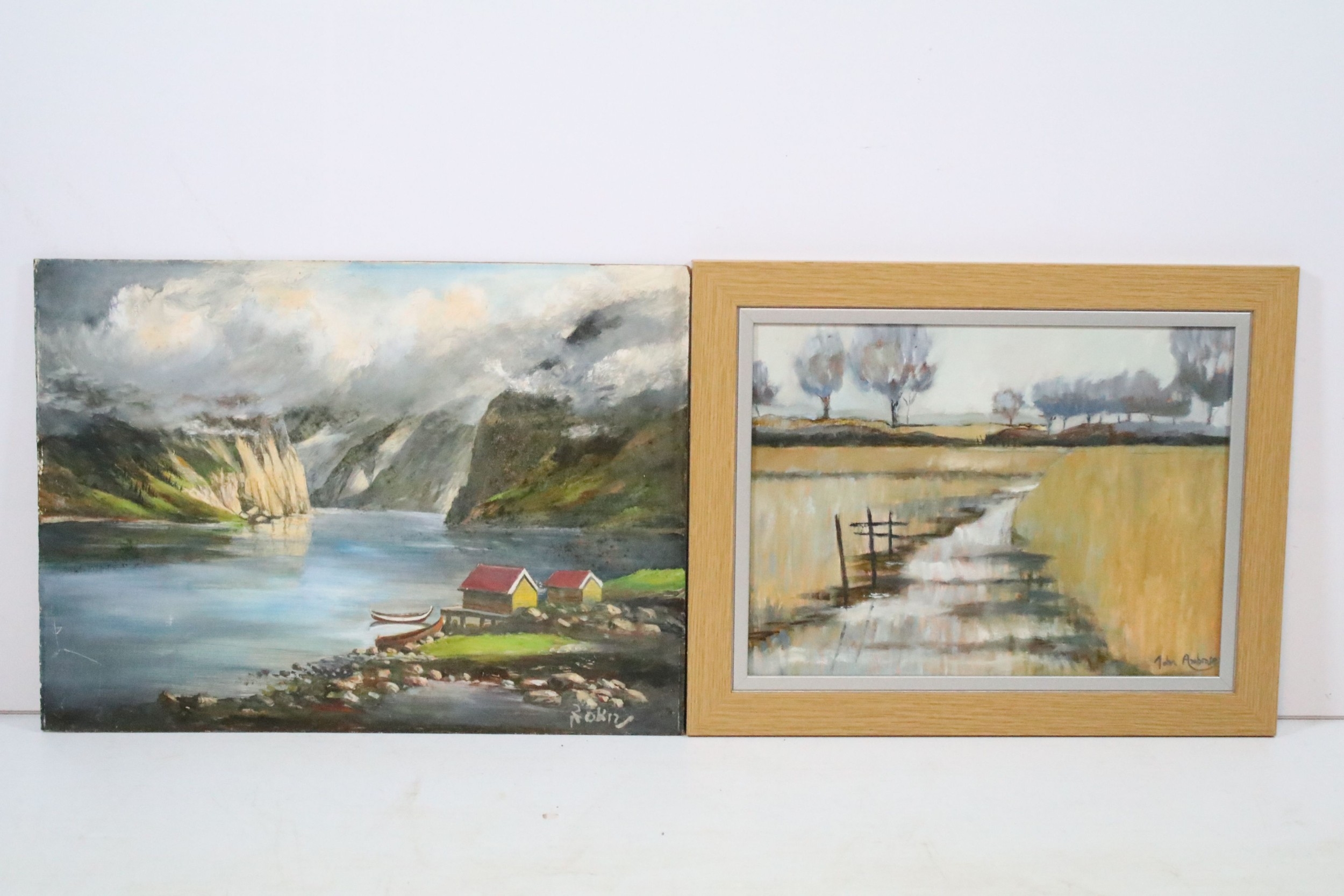 John Ambrose (1931 - 2010) stream in a field setting, oil on board, signed to lower right, information about the artist verso, 30.5cm x 40.5cm, framed together with Charles A Roka, oil on board, of a mountainscape, 39cm x 54cm (2)