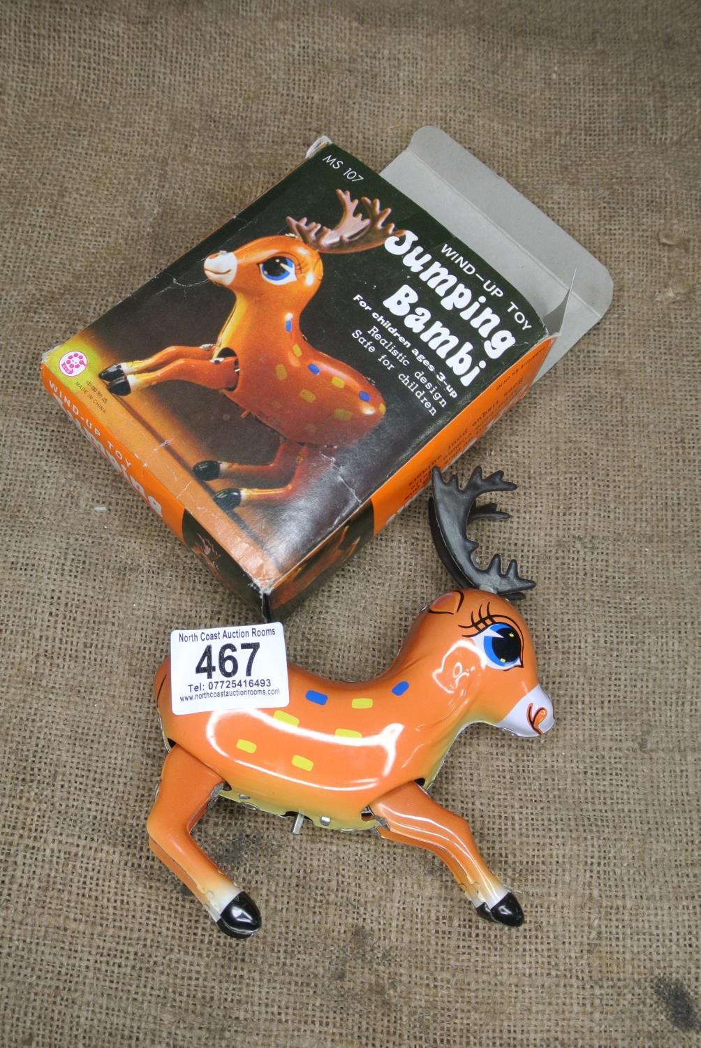 A vintage tin plate Jumping Bambi wind up toy with original box and key
