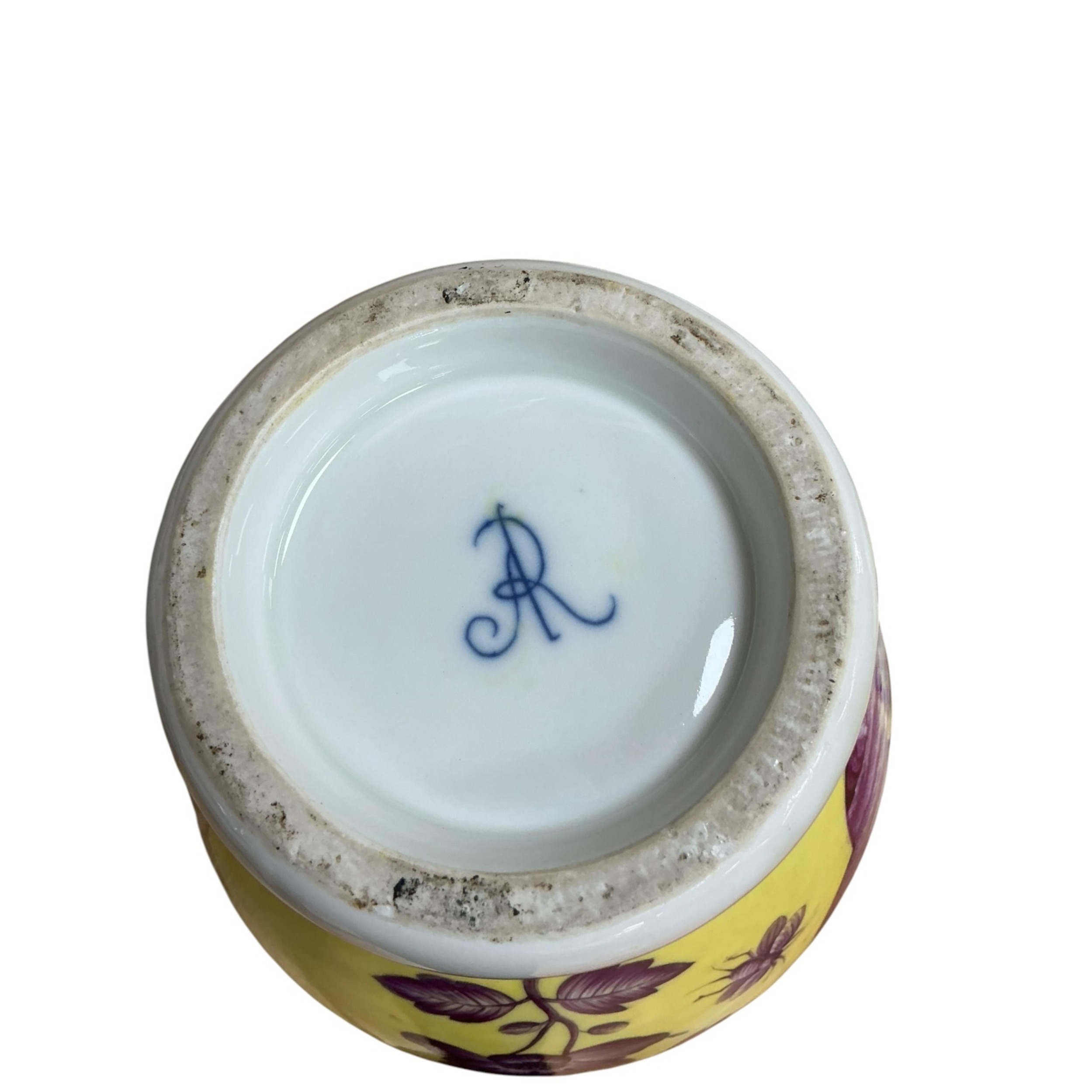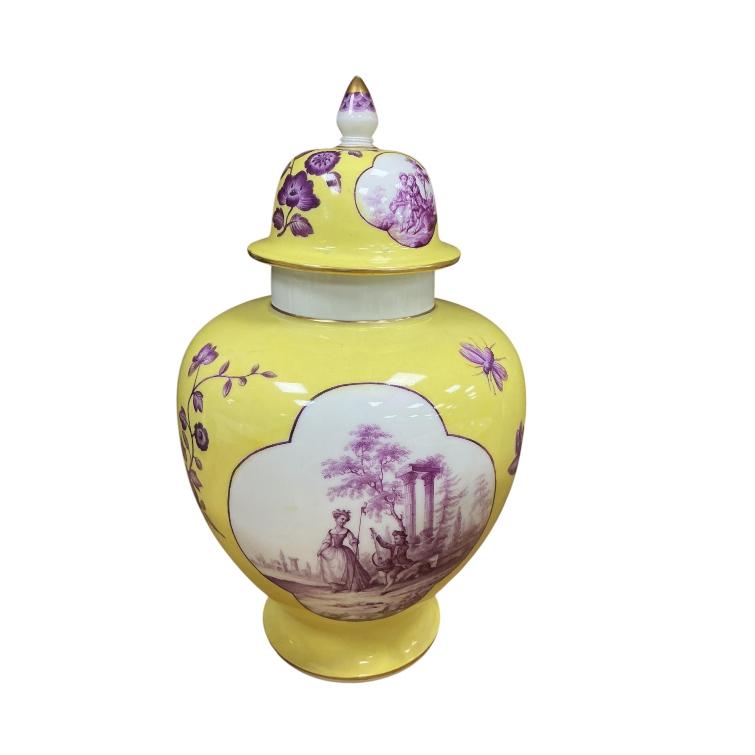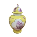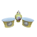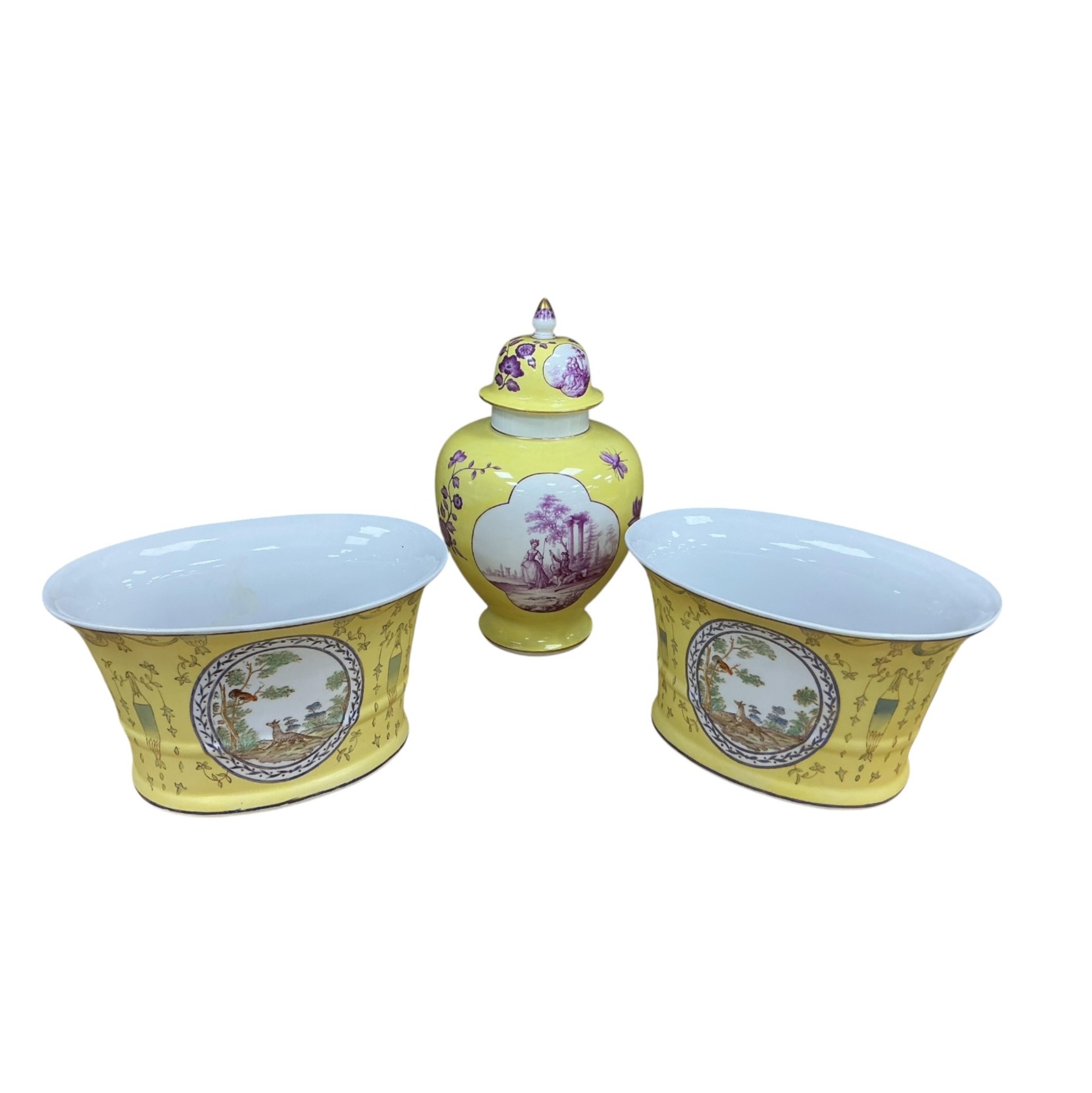 A Meissen style yellow ground porcelain jar and cover, 20th century, of baluster form, hand painted in puce with quatrefoil reserves of plein-air courting couples, further painted with insects and foliage, pseudo-Augustus Rex mark to base, 32cm high, along with a pair of yellow ground planters (3).