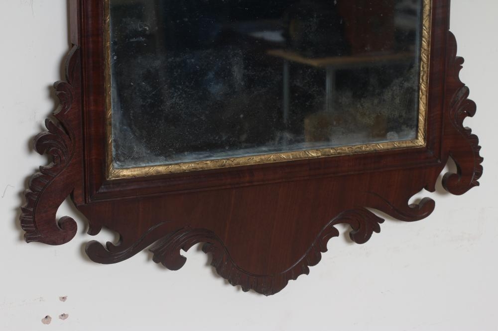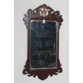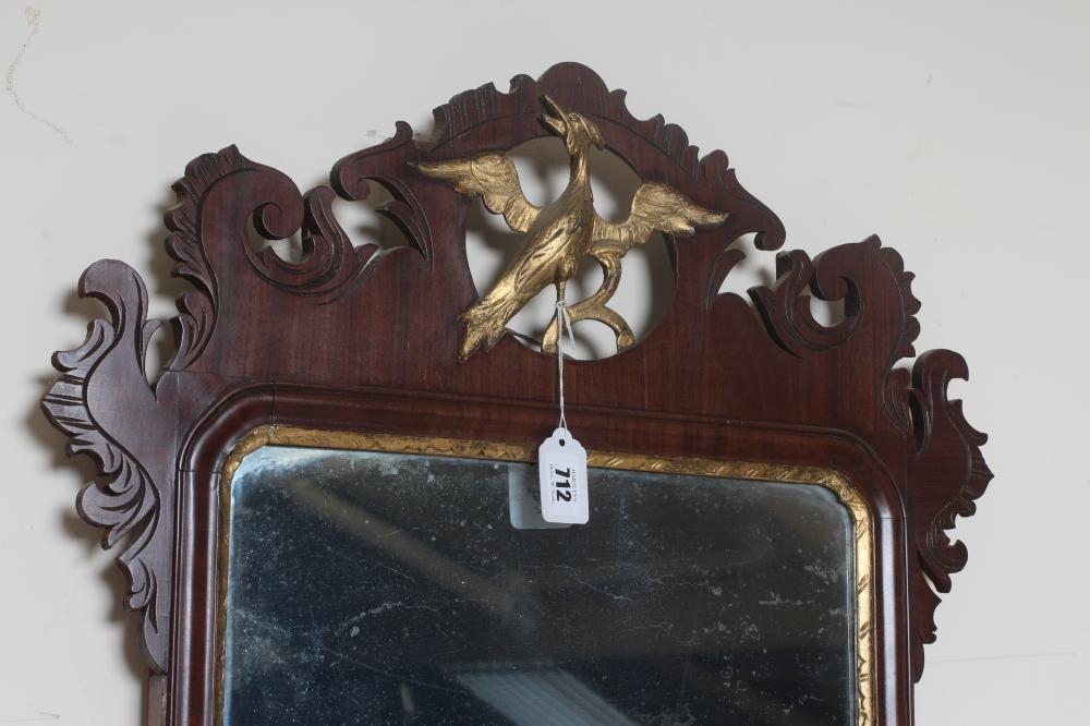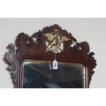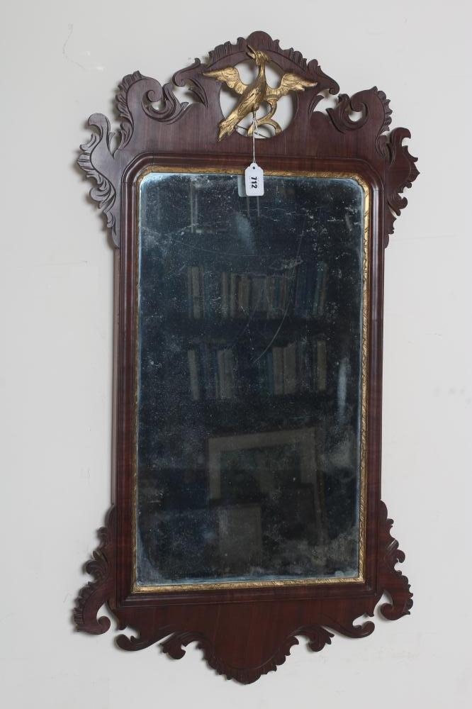 A MAHOGANY AND PARCEL GILT FRET PIER GLASS, early/mid 19th century, the mildly arched oblong plate within a gilt foliate and moulded surround, arched top with Ho-Ho bird, conforming base, 34 1/4" h x 212 w (Est. plus 24% premium inc. VAT)