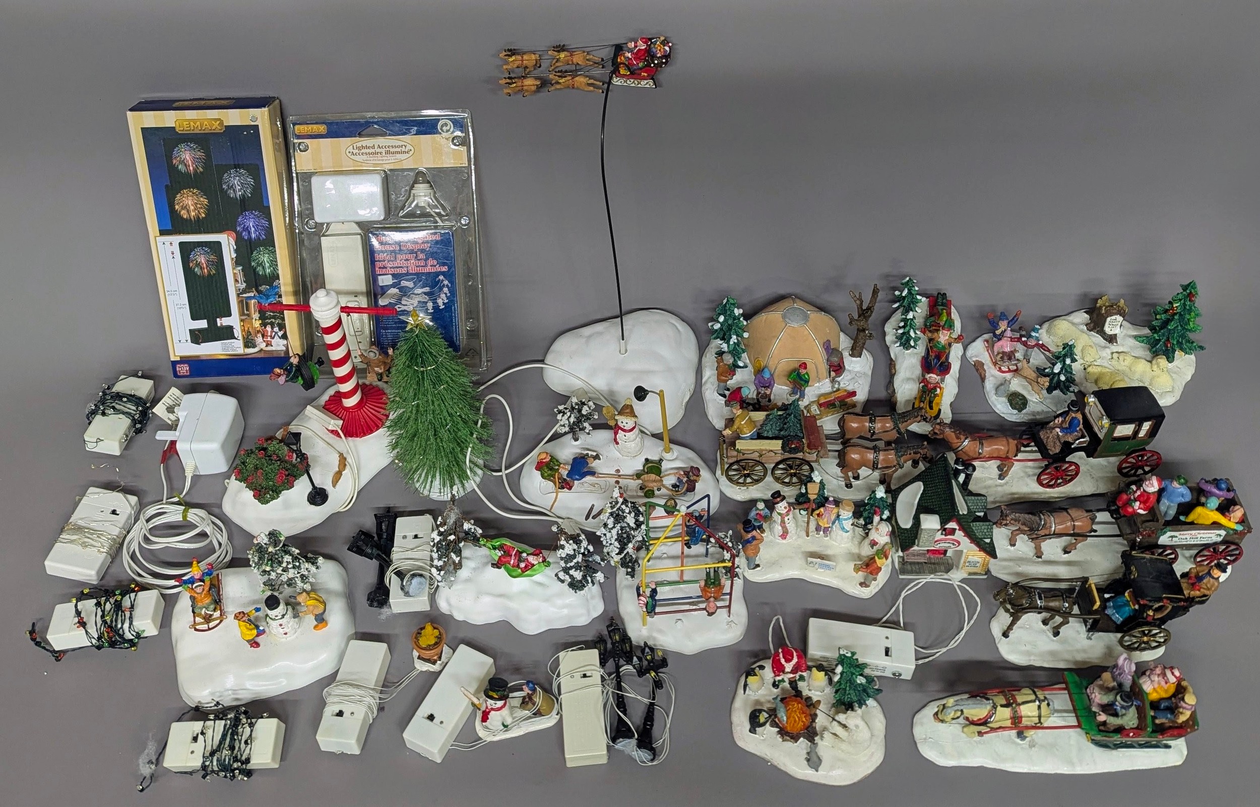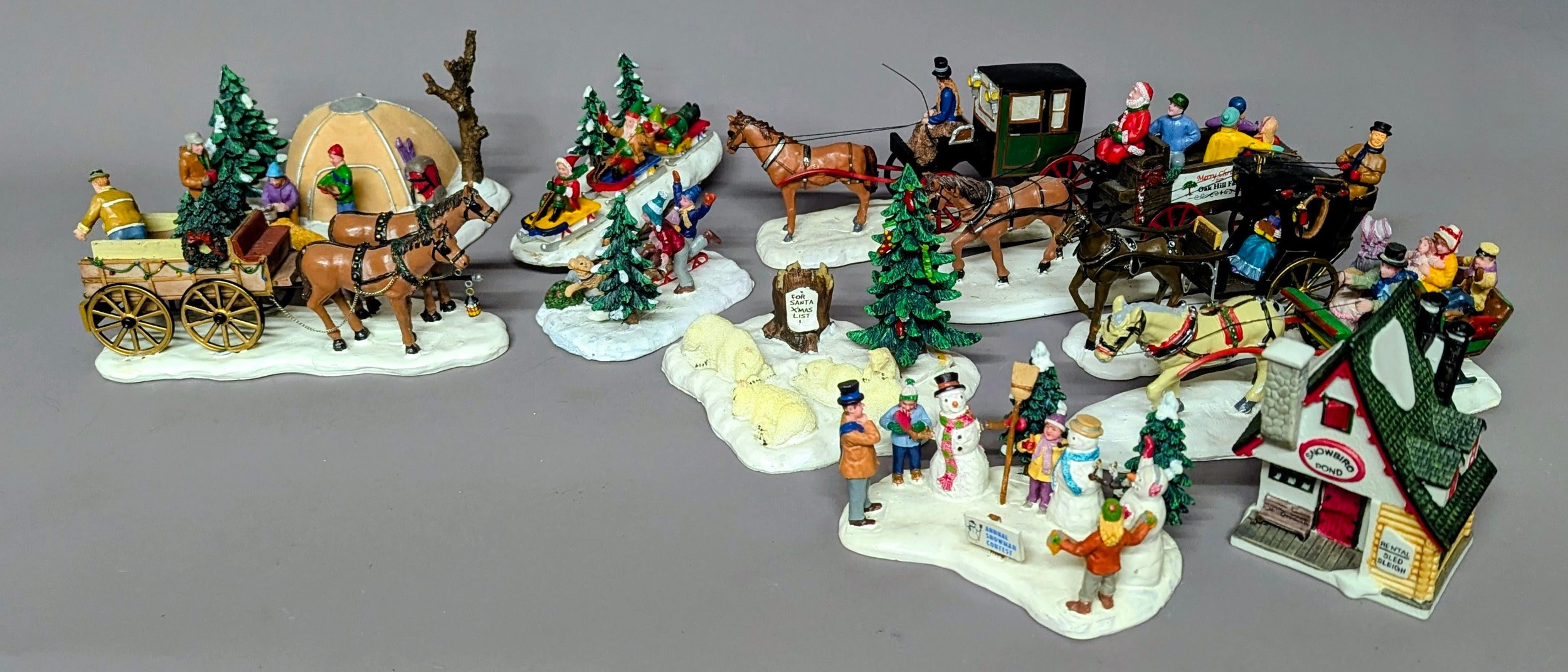 Lemax Village - Christmas, accessories including battery operated illuminated "flying" Santa and sleigh, climbing frame, swings, Christmas tree, Santa and penguins, etc; other Lemax Village accessory models, horse and cart groups, sleigh ride, camping group, snowmen, polar bears, qty