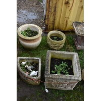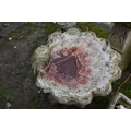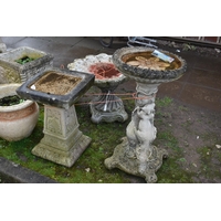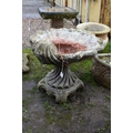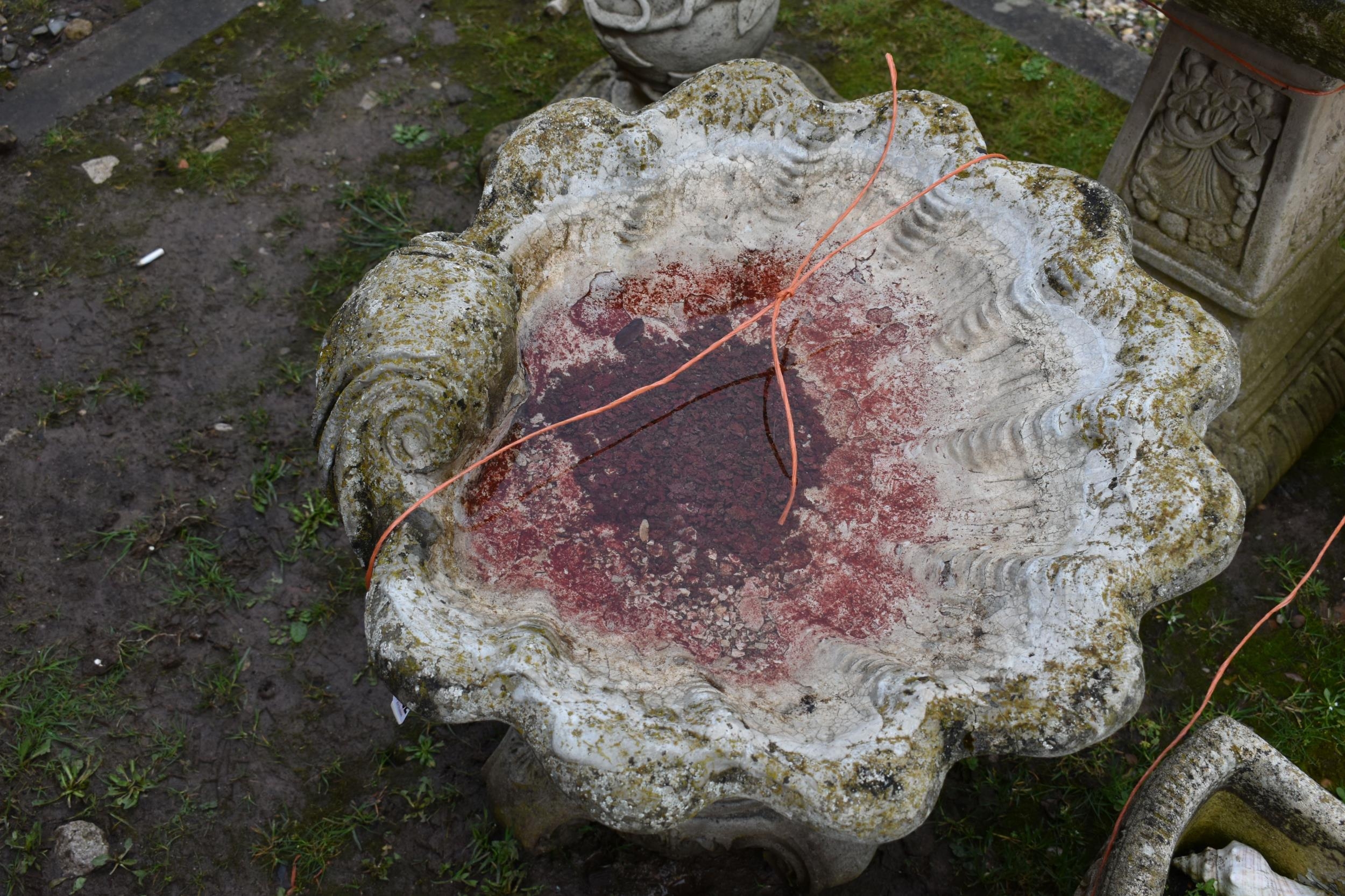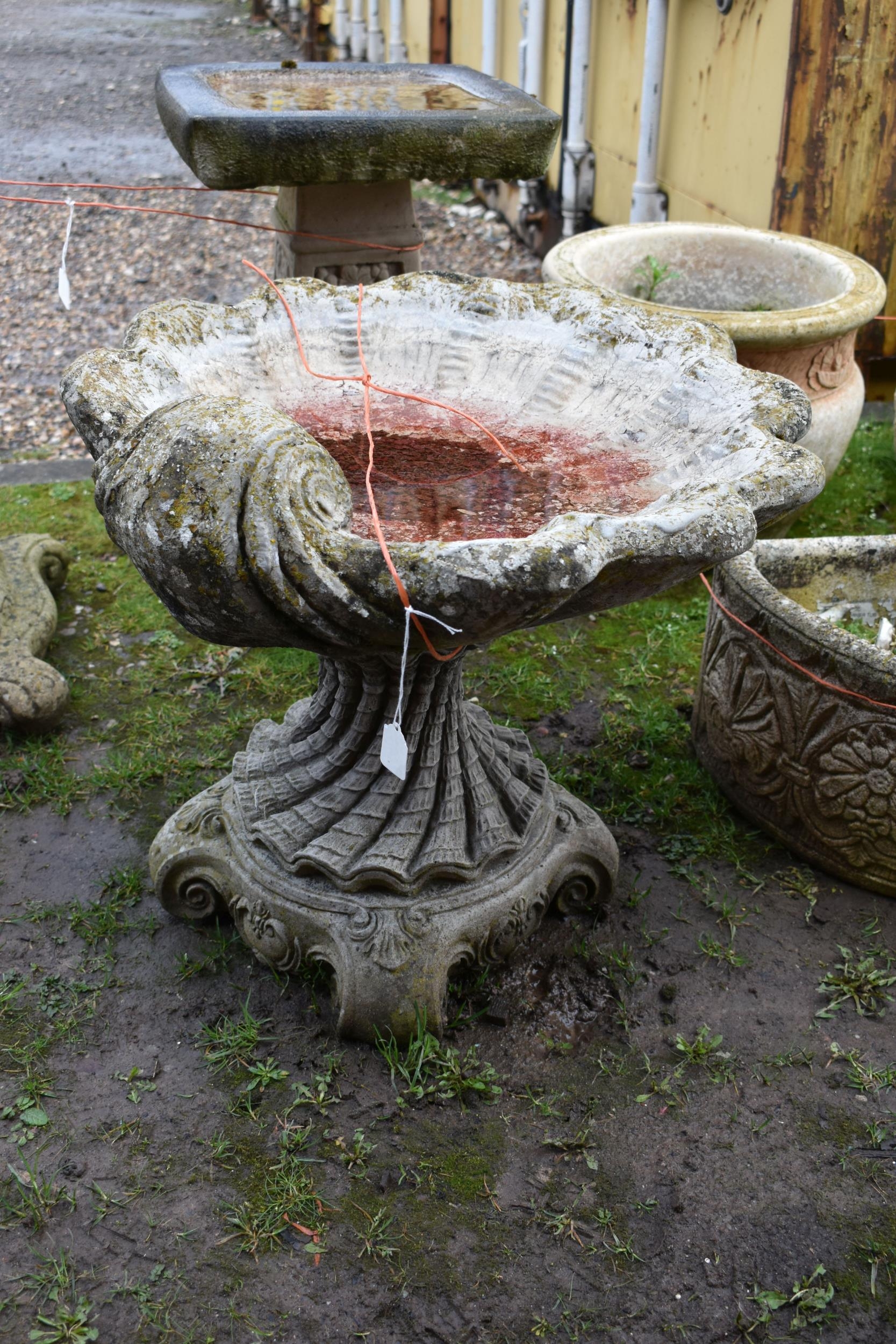 A MODERN COMPOSITE BIRD BATH in the form of an Oyster shell bowl on a linen swag base with four scrolled feet height 50cm