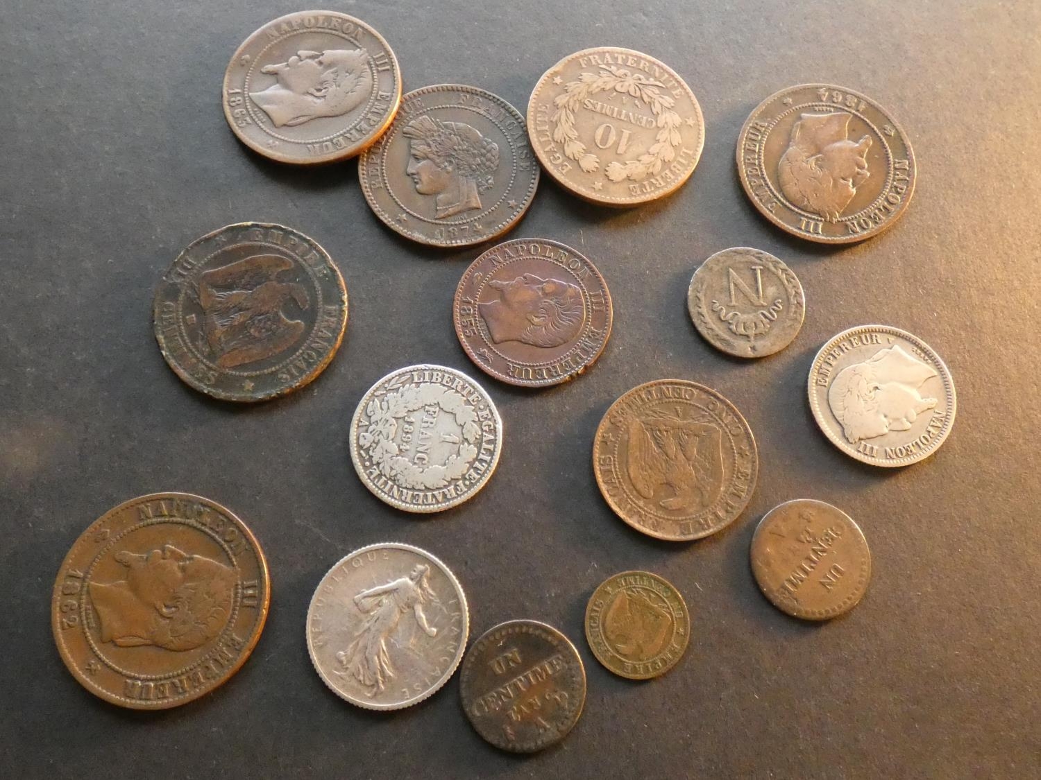 FRANCE. 1 Centime (L’An 6A, L’An 7A, 1862A), 5c [1855D(d), 1862A], 10c (1809H, 1862K, 1863K, 1864A, 1864BB, 1874A, 1887A) and 1 Franc (1866A, 1894A, 1916), mixed grades and condition, Good, worn to NVF, occasional fault, eks, etc. (15)
