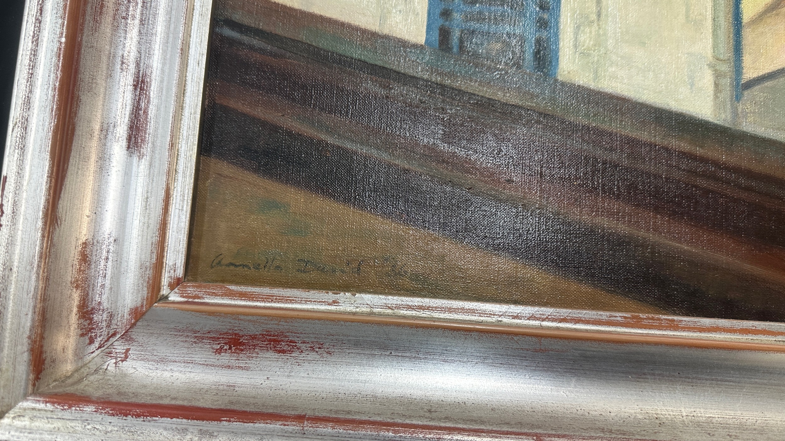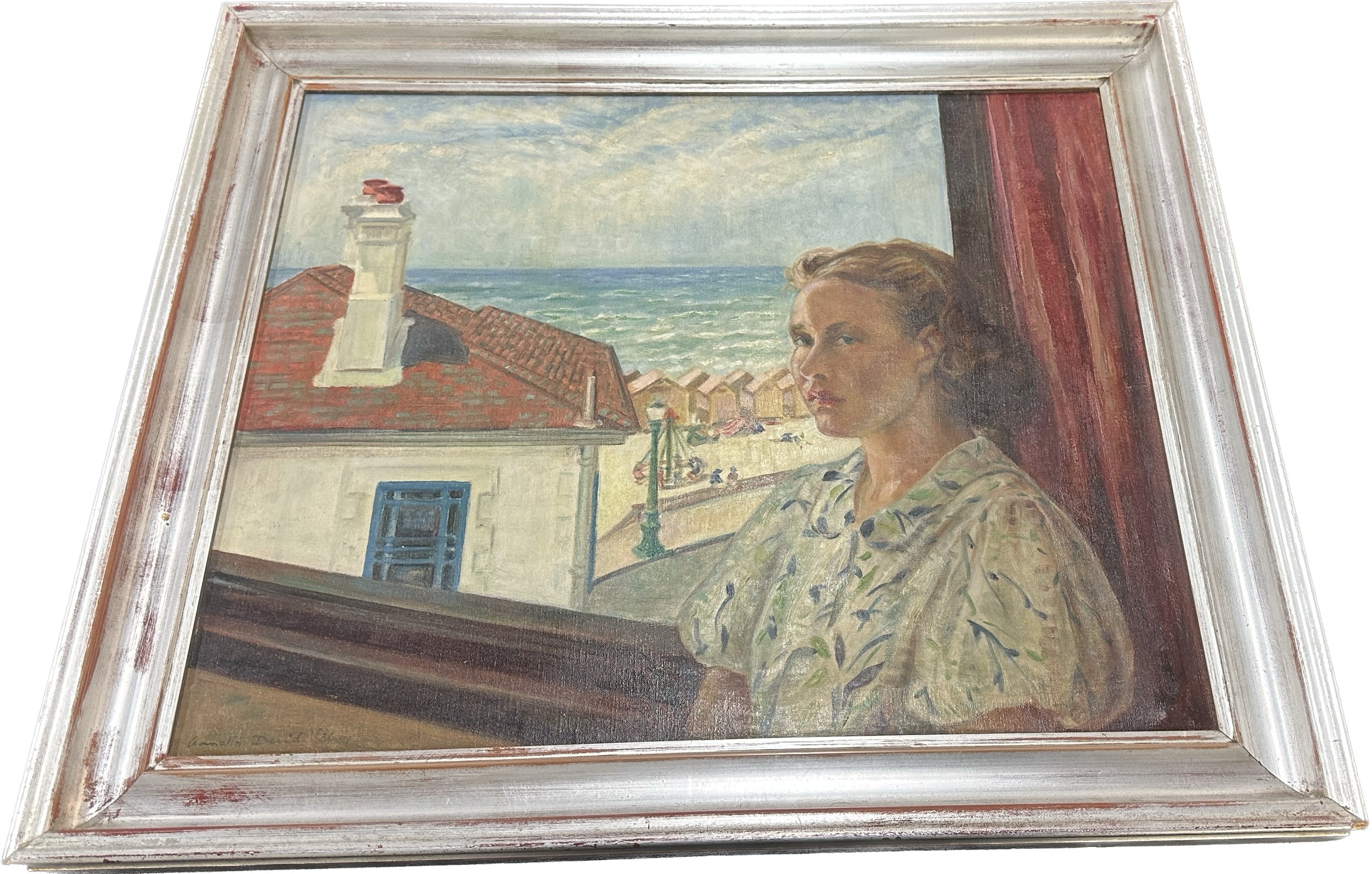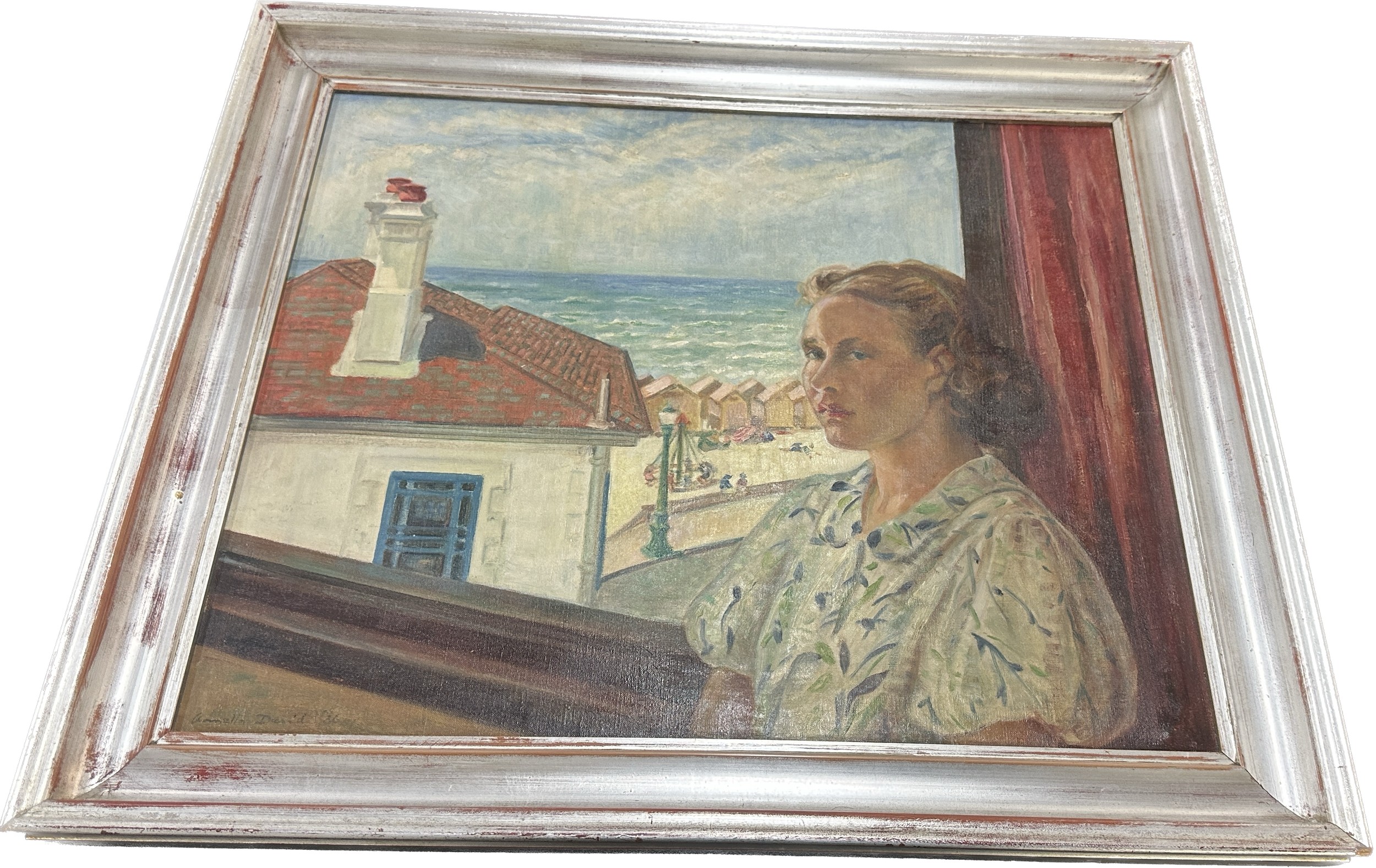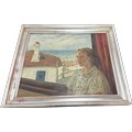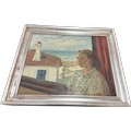 Vintage framed signed oil on canvas depicting a lady measures approximately 30 inches wide x 26 tall