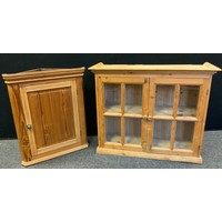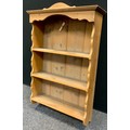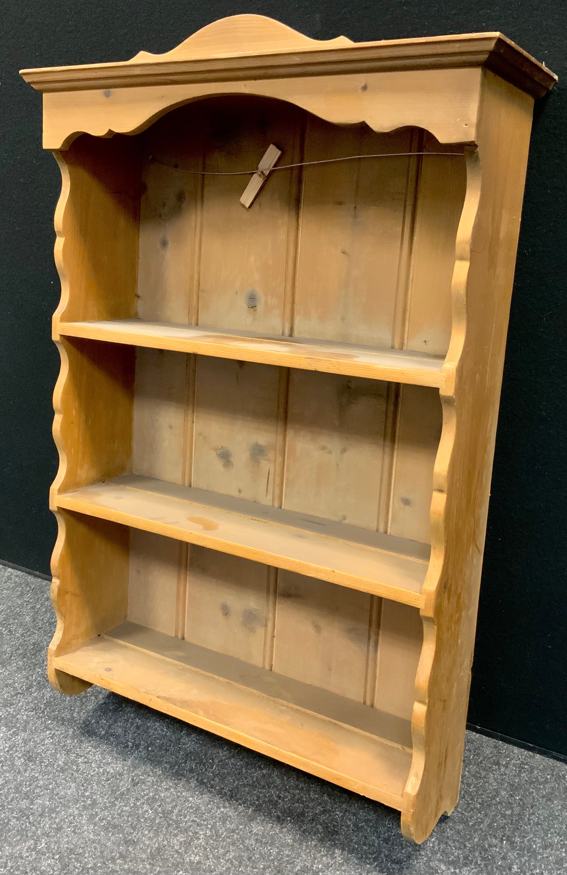 A pine wall hanging shelf, shaped cornice, 77cm high, 54cm wide