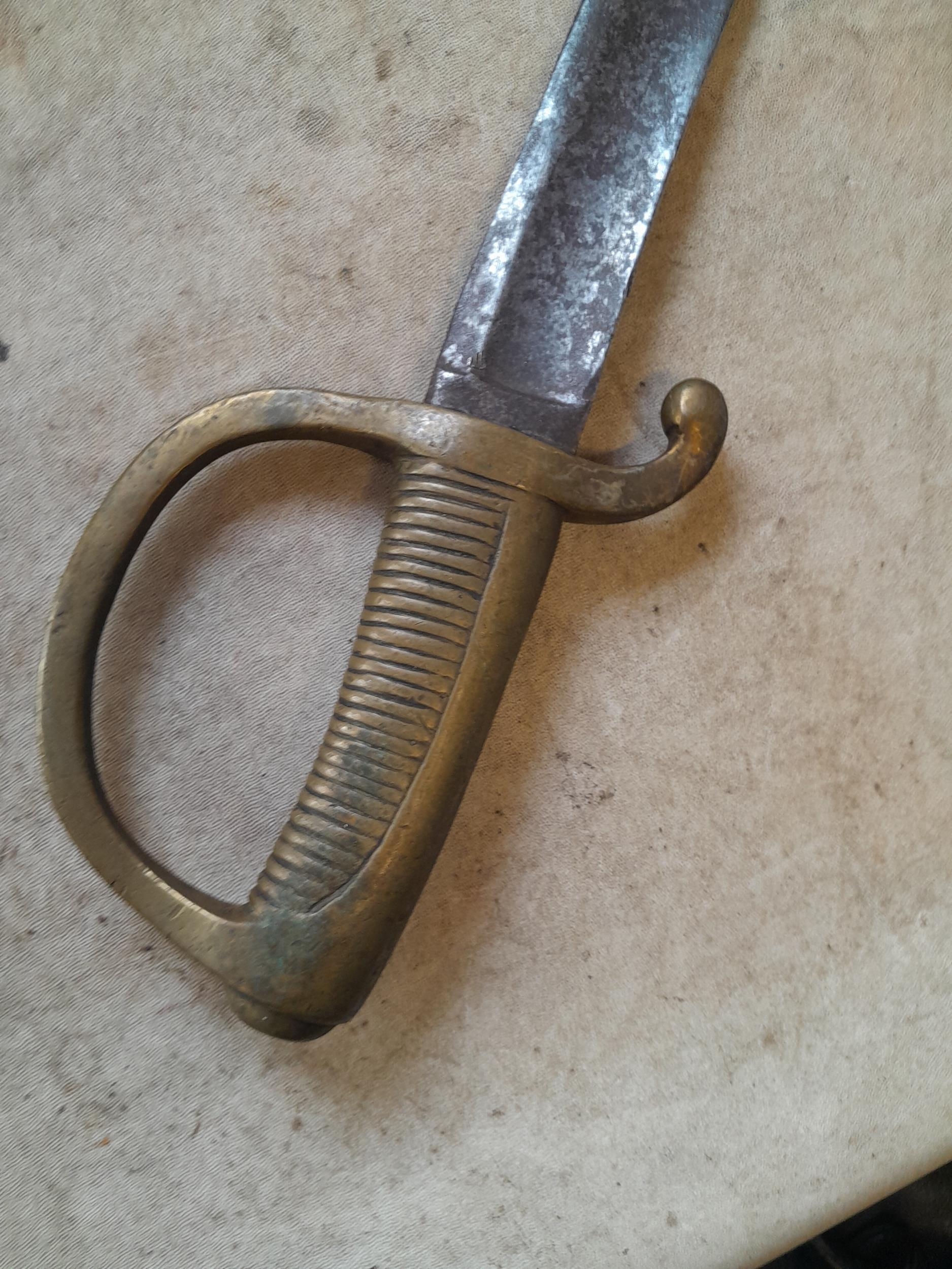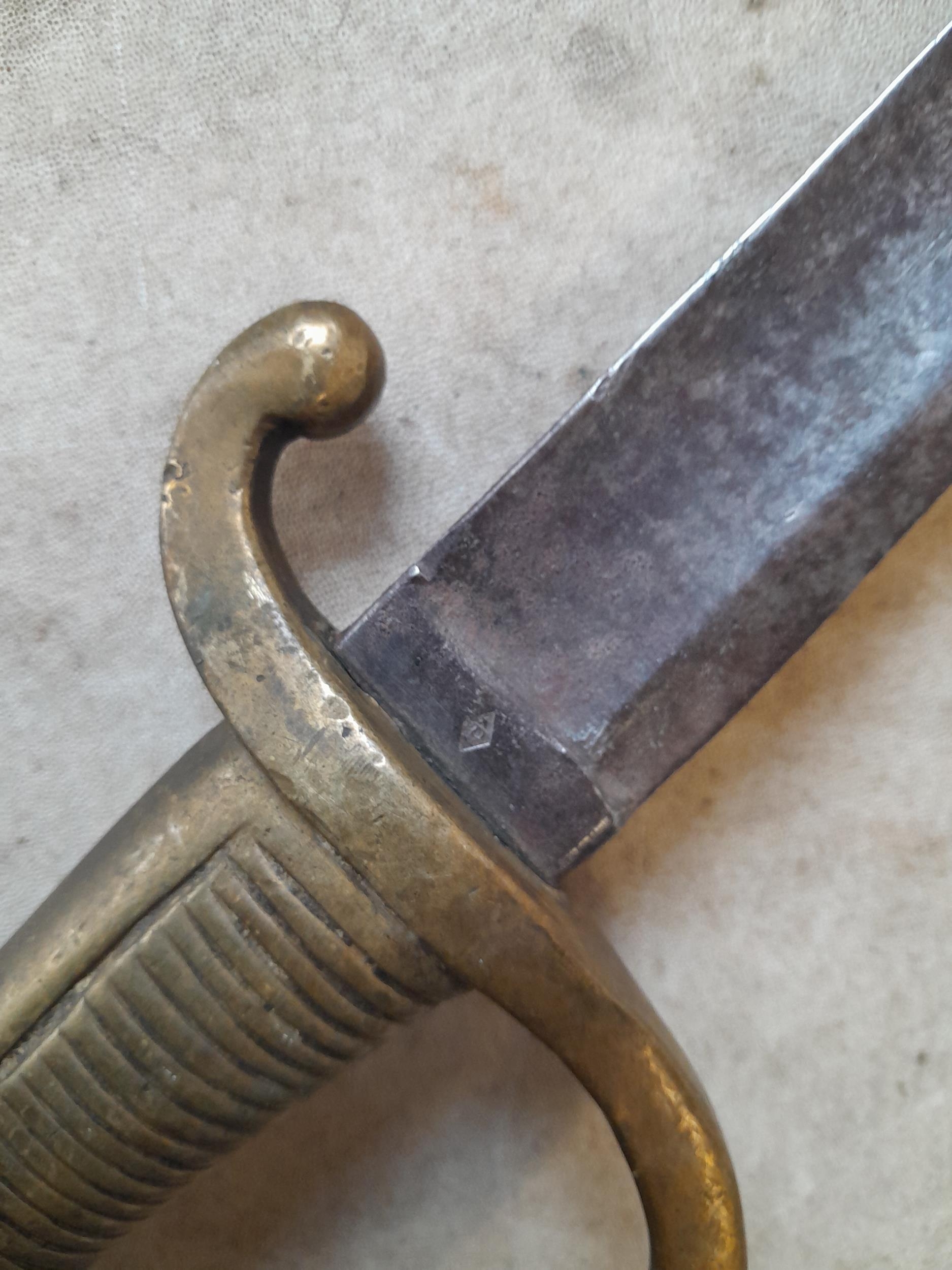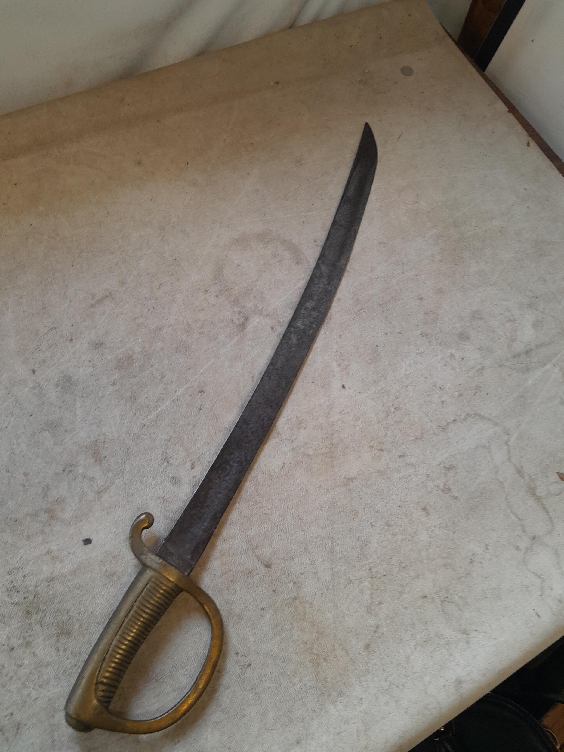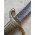19th century French made Briquet sword, with brass handle, curved steel blade with stamps, no scabbard