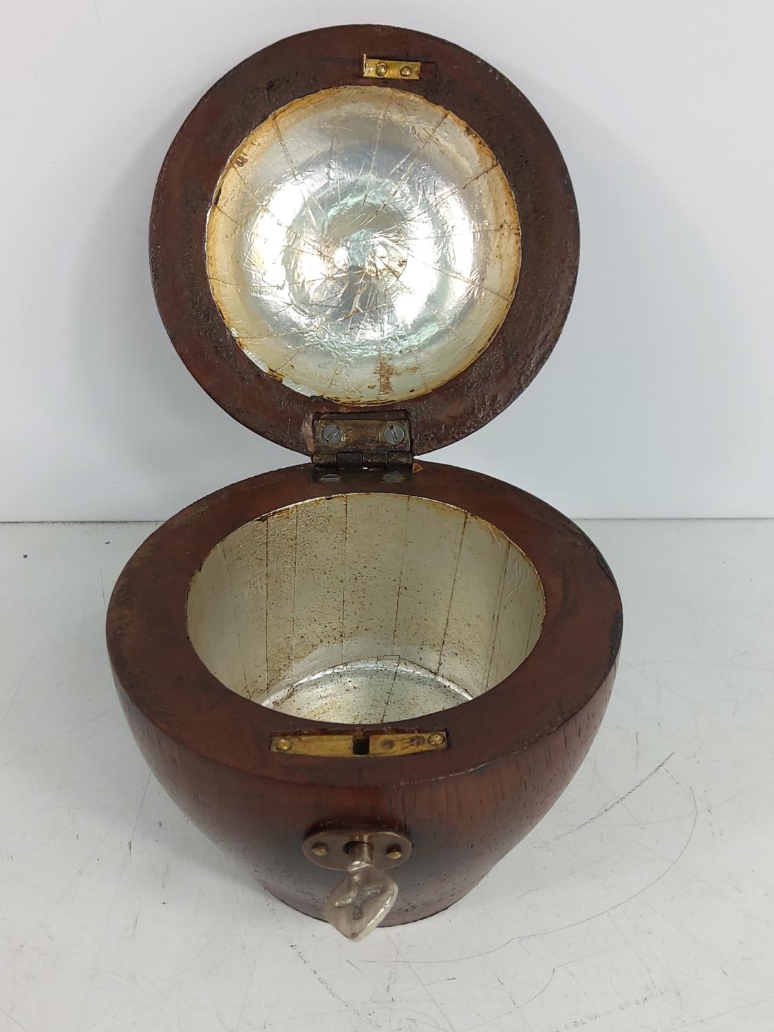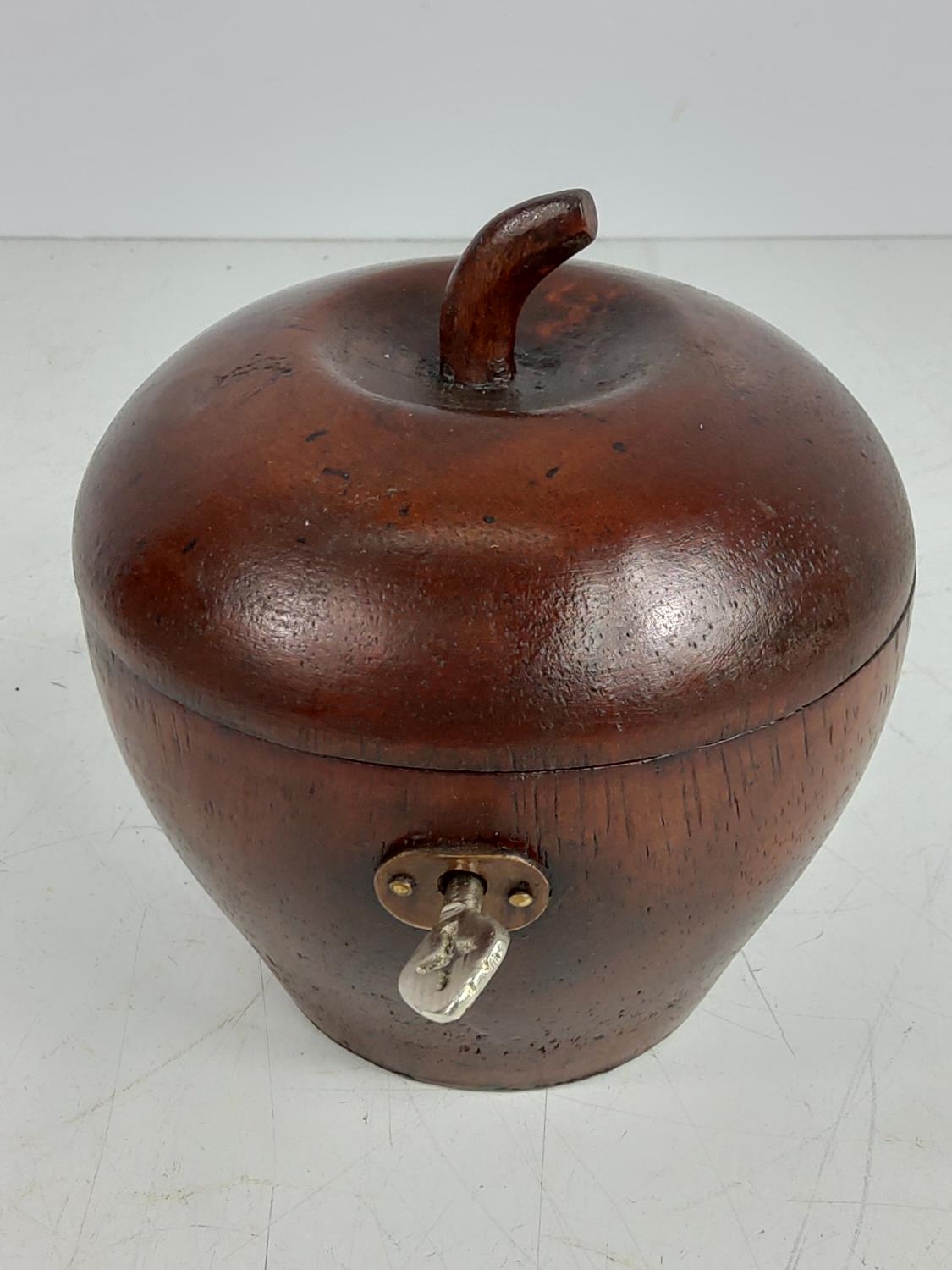 Fruit wood tea caddy with key, 12cms in height, 11.5cms in diameter