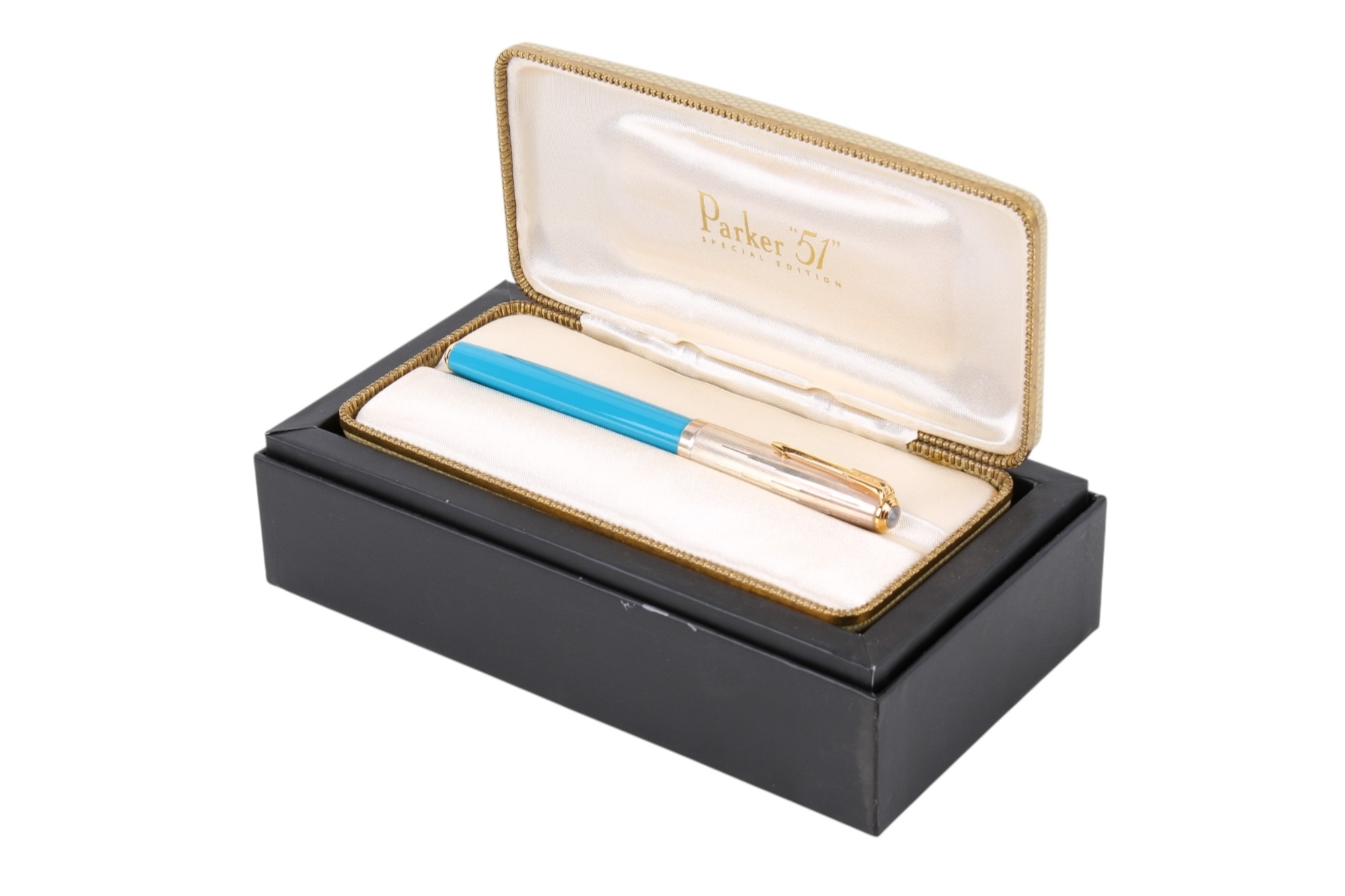 A 2002 special edition boxed Parker '51' fountain pen. With a white and yellow metal lid featuring the Empire State design, over a turquoise body, in the original box and gift box, with booklet and unused cleaning cloth.