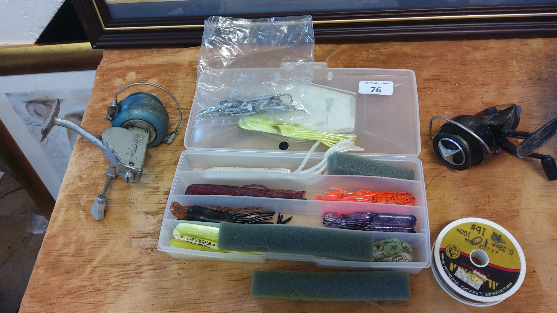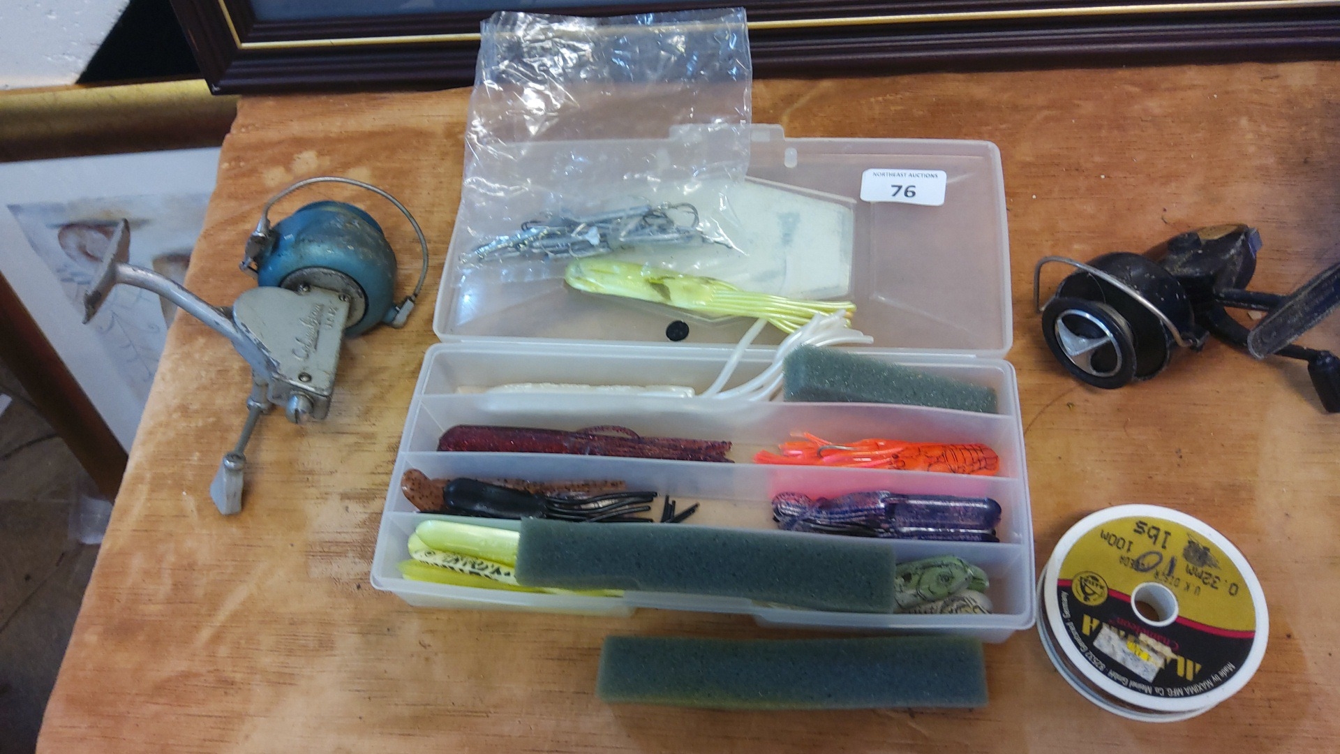 A group of fishing tackle comprising an assorted selection of soft-plastic lures and terminal tackle in a compartmented plastic box, accompanied by two vintage reel components and a spool of fishing line.