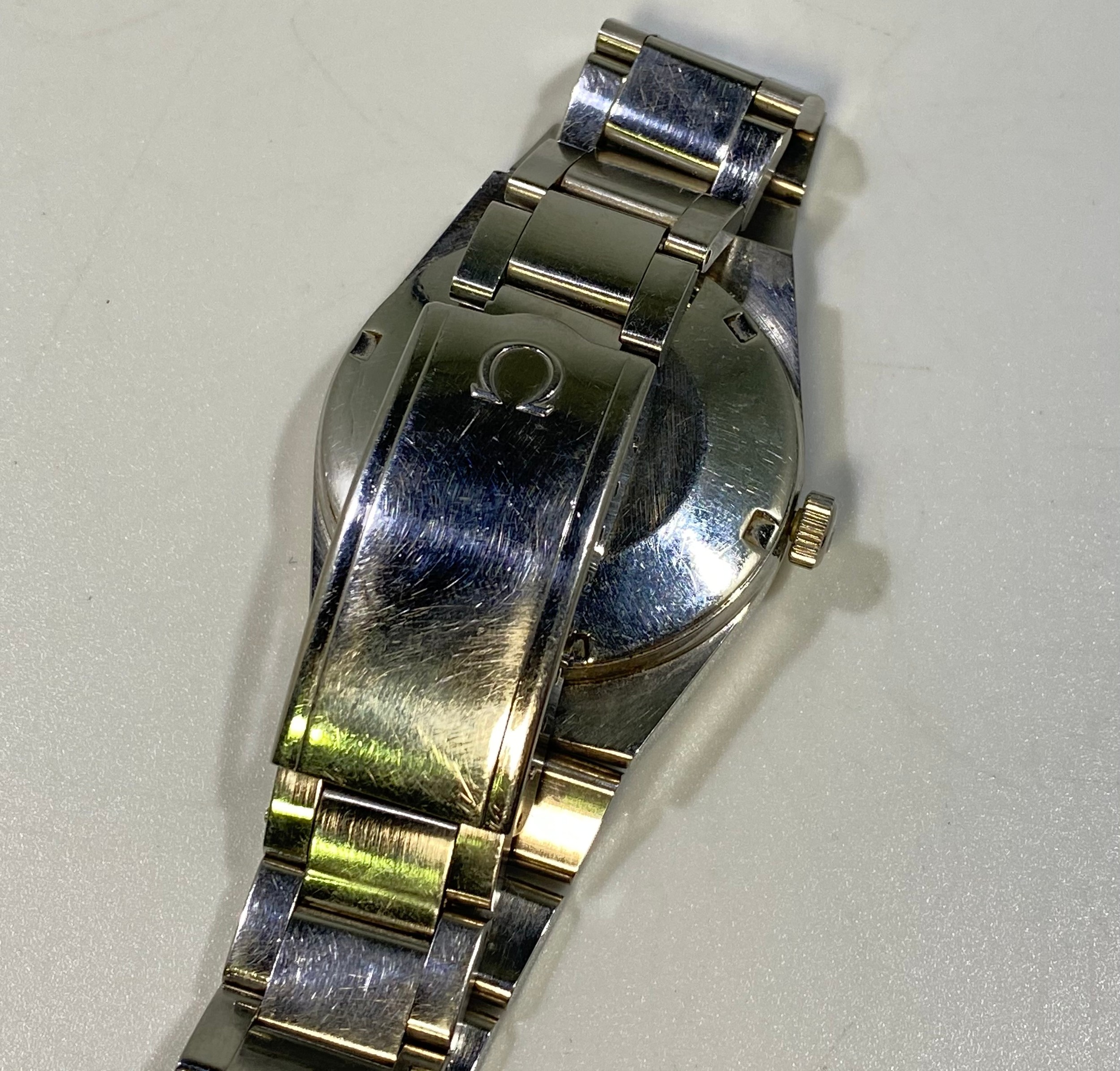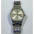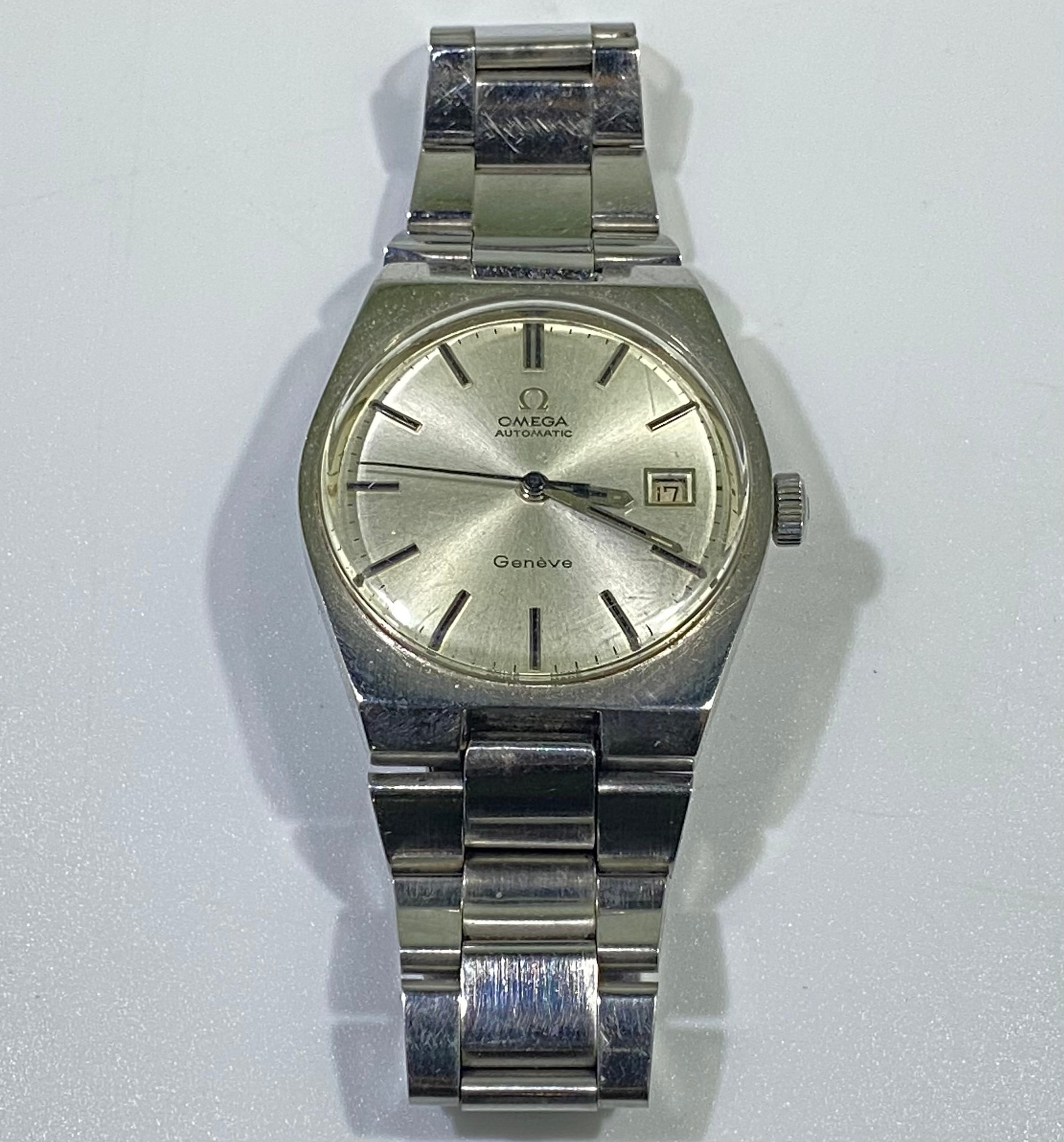 A gents stainless steel Omega Automatic Geneve wristwatch, c.1970’s, the circular silvered dial with batons denoting hours and date aperture at 3 o’clock position, on stainless steel bracelet, with branded clasp, 34mm case diameter