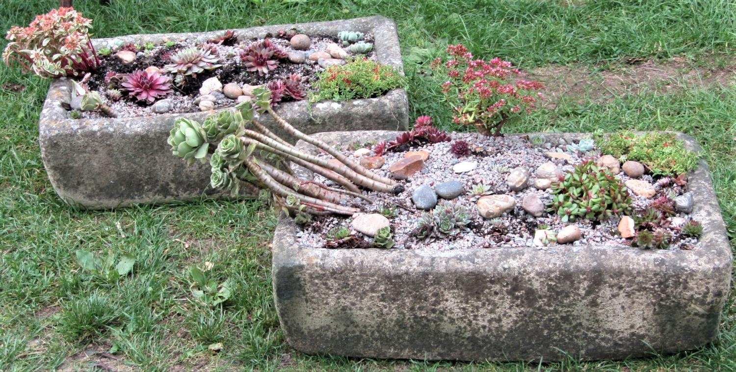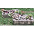 A pair of reclaimed shallow garden troughs of rectangular form containing succulents, approx 60 cm long x 40 cm wide x 16 cm high